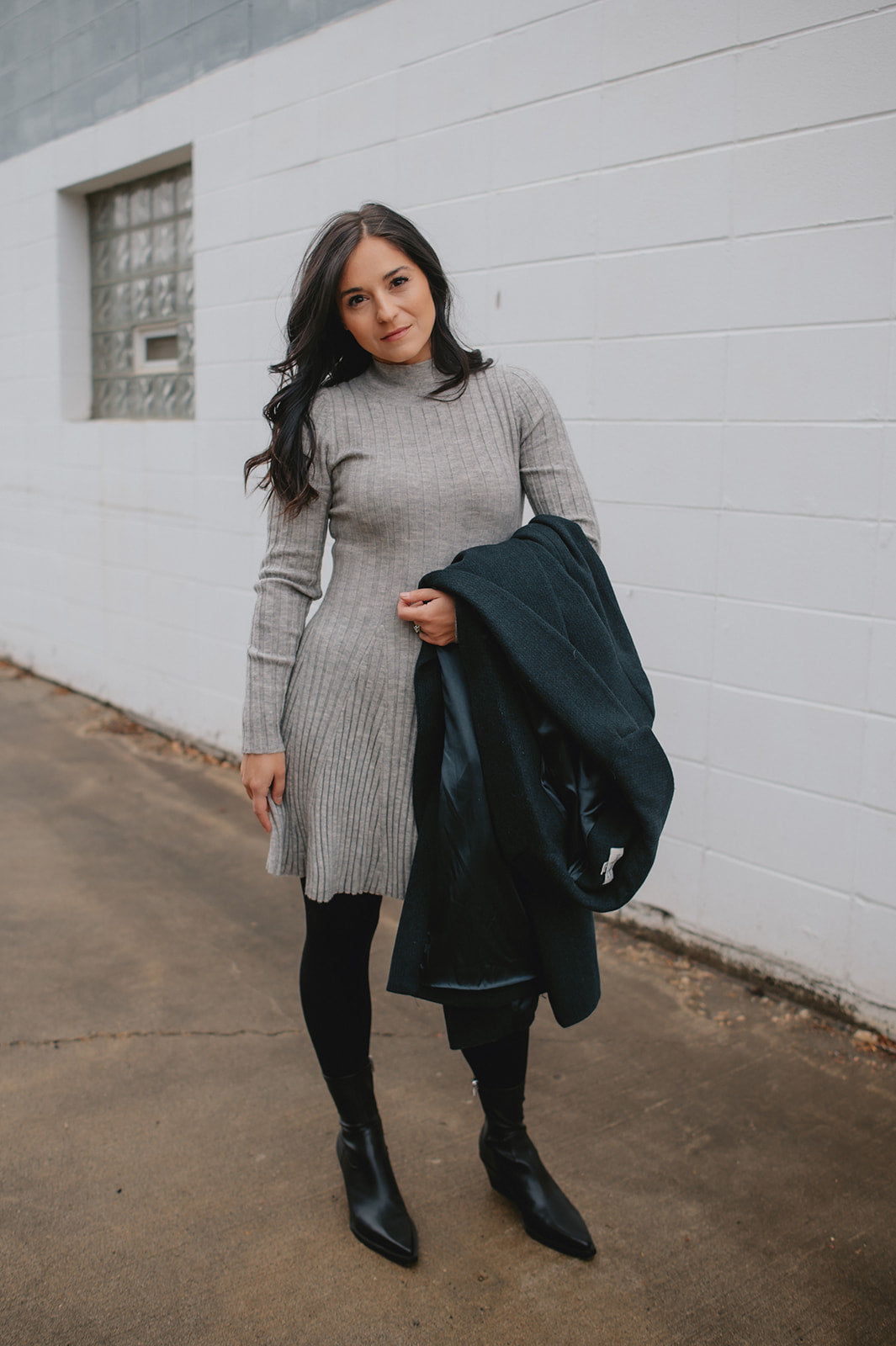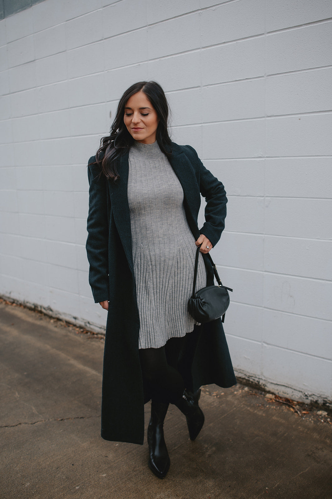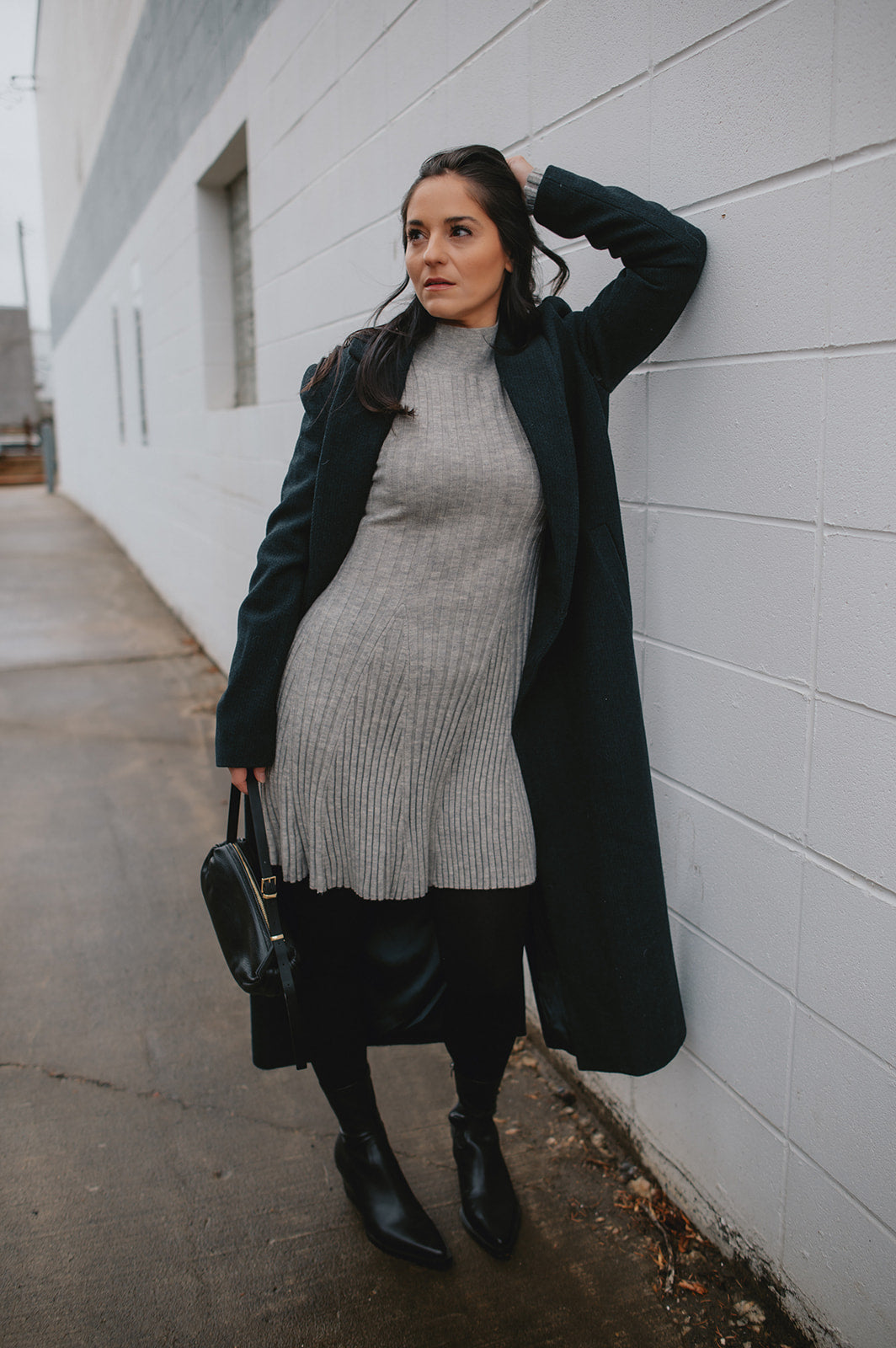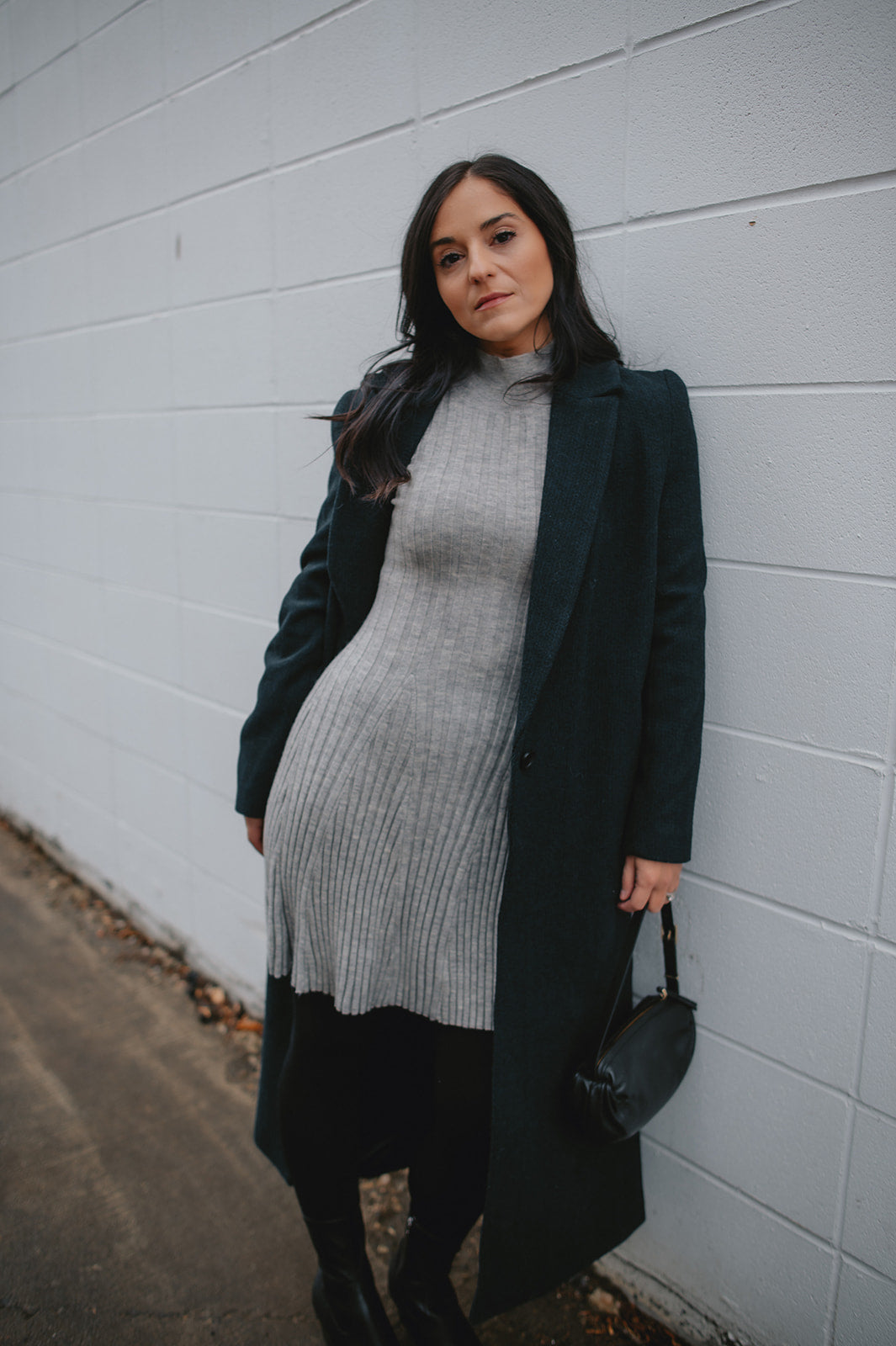 The Adi Dress is our effortless, throw-on-and-go sweater dress. It has a mock neck and slim fitting sleeves. But the magic is in the skirt, the rib is knit into godets to create a cute flounce at the sweep. Perfect with knee high boots.