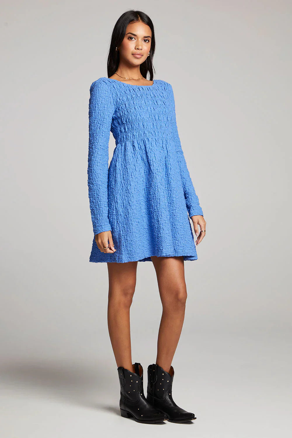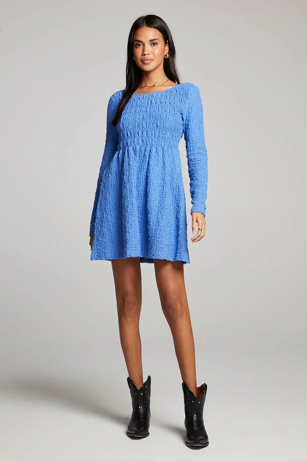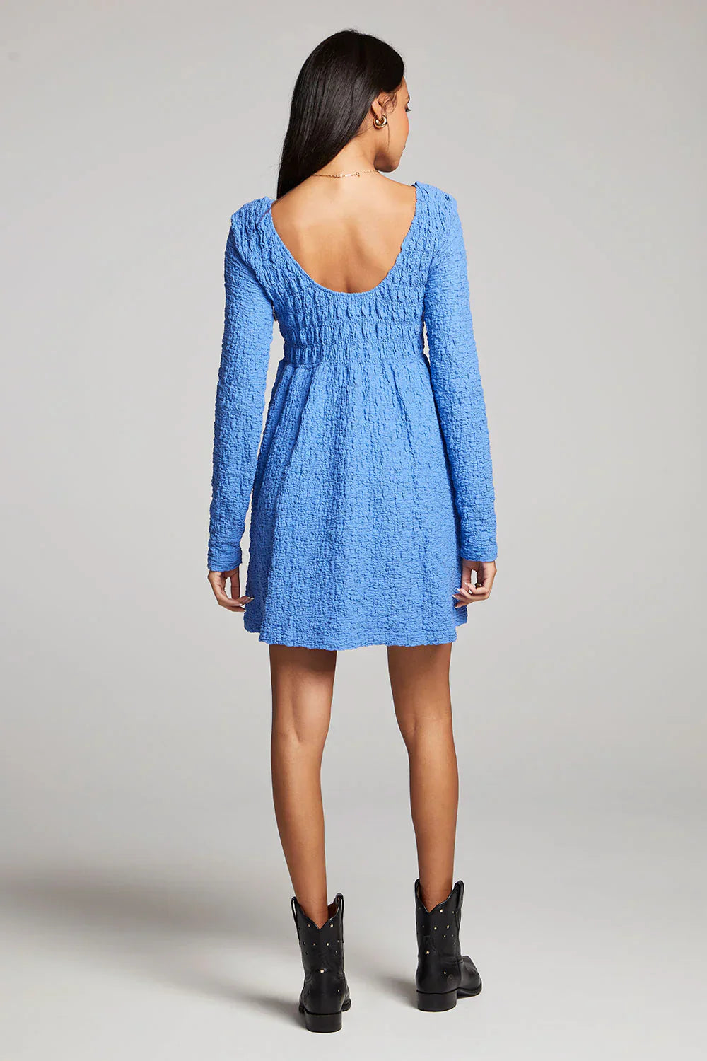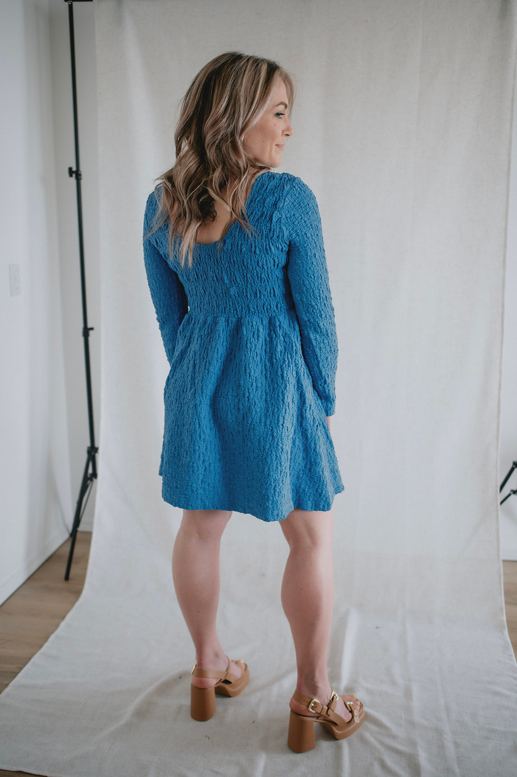 Ethereal and dreamy! Embrace your free-spirited side in our Adrianna Mini Dress. The pacific blue hue gives a relaxed vibe, while the playful front details add a touch of charm. Pair with boots or strappy heels.