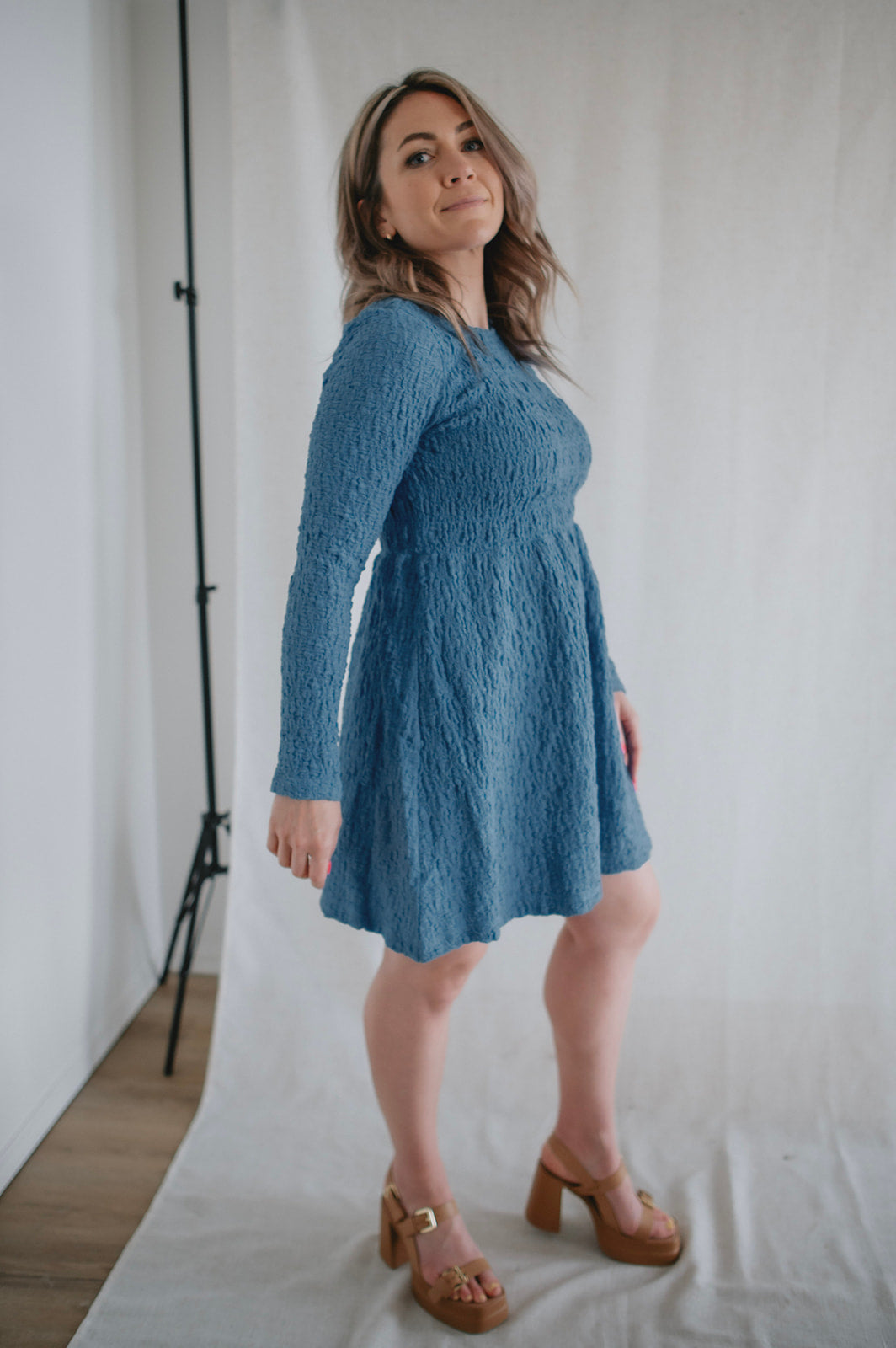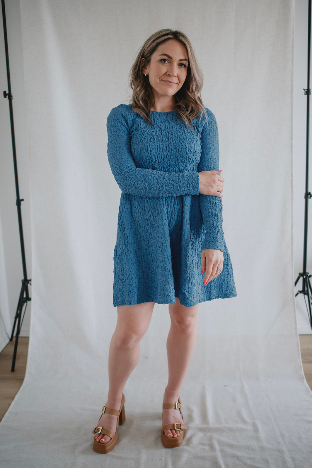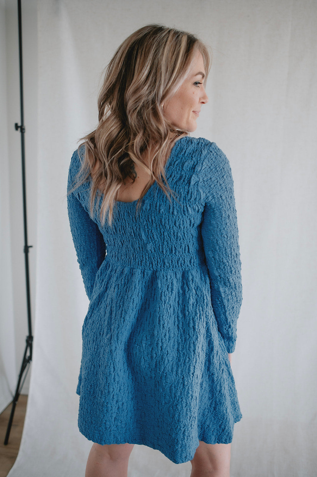 Ethereal and dreamy! Embrace your free-spirited side in our Adrianna Mini Dress. The pacific blue hue gives a relaxed vibe, while the playful front details add a touch of charm. Pair with boots or strappy heels.