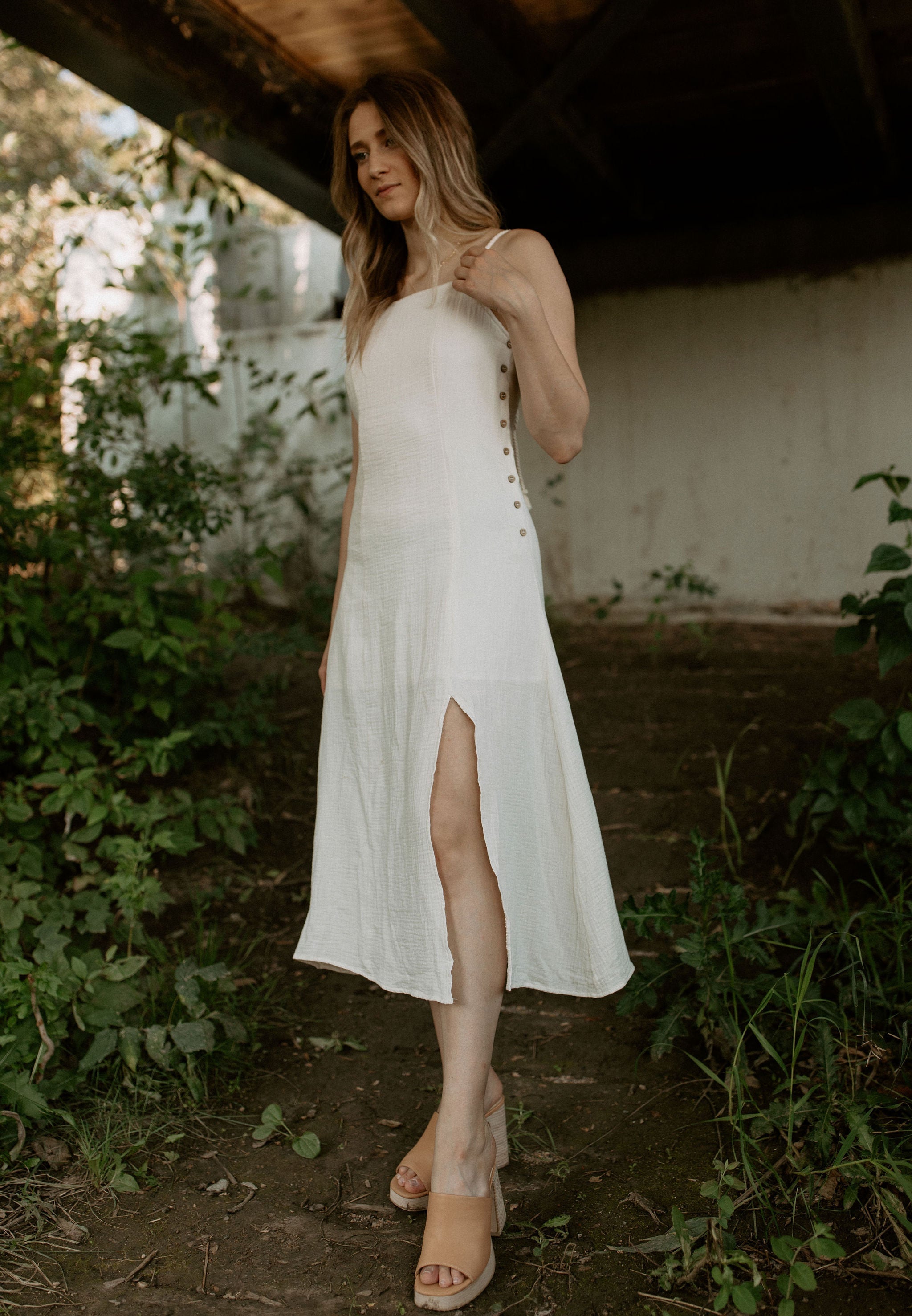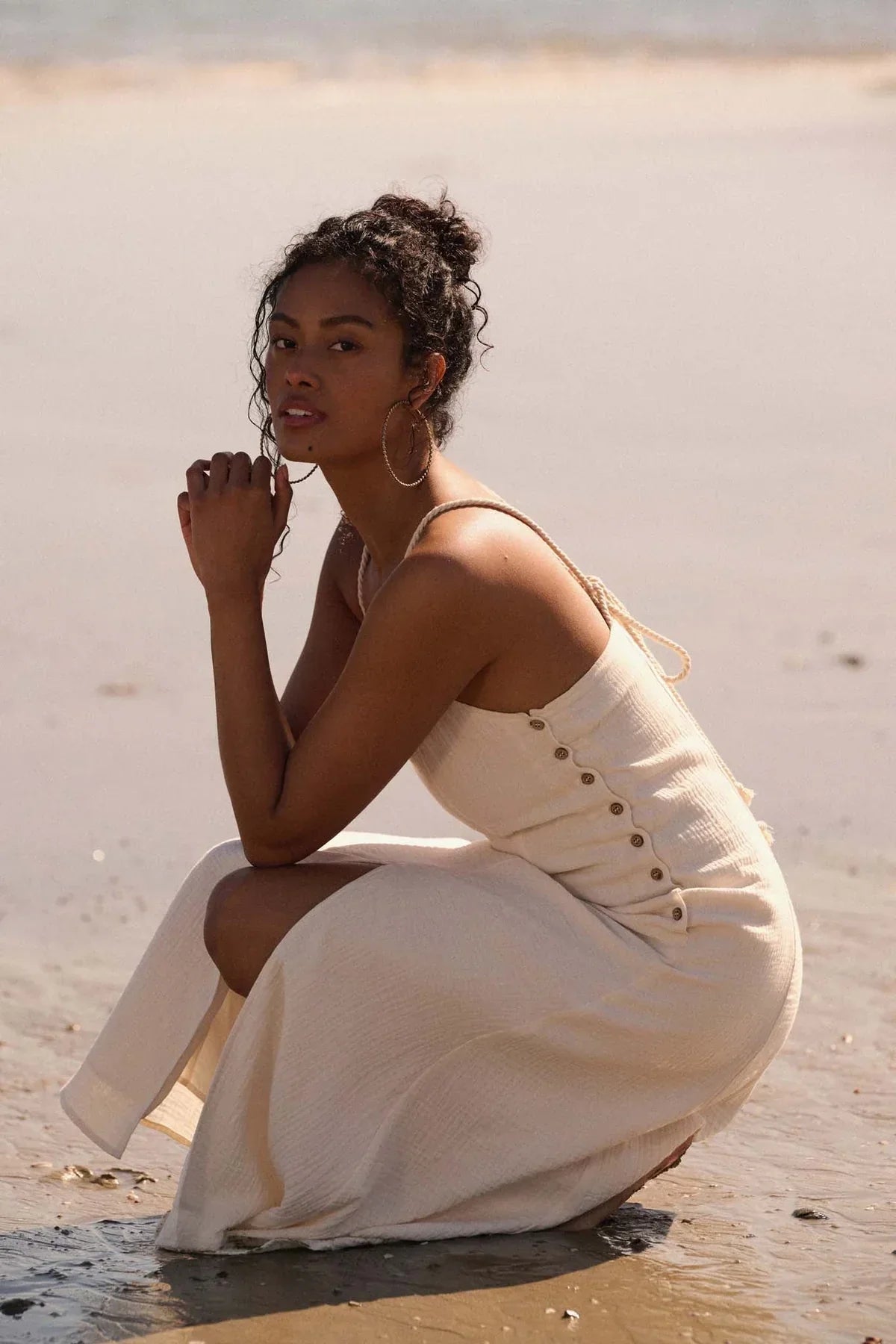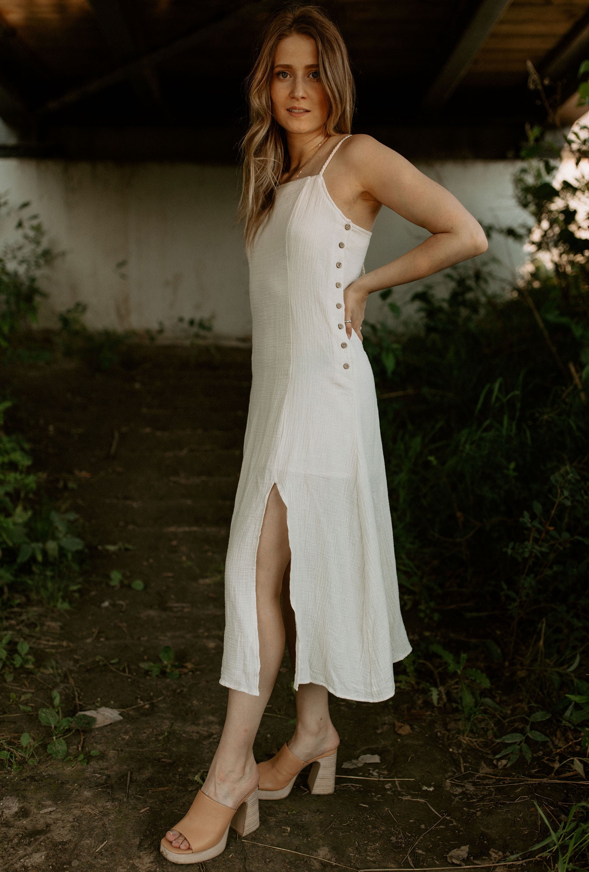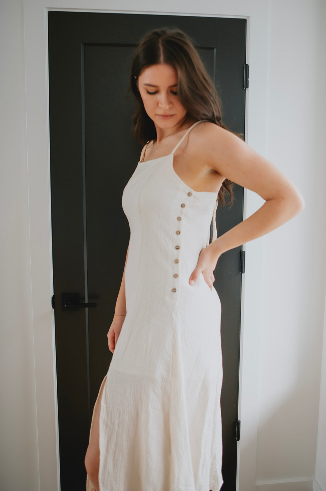 Feel like Ariel straight from out of the sea it this gorgeous maxi dress. Perfect for a day at the beach, this 100% cotton dress features maxi length, button details, and a leg slit for added movement.