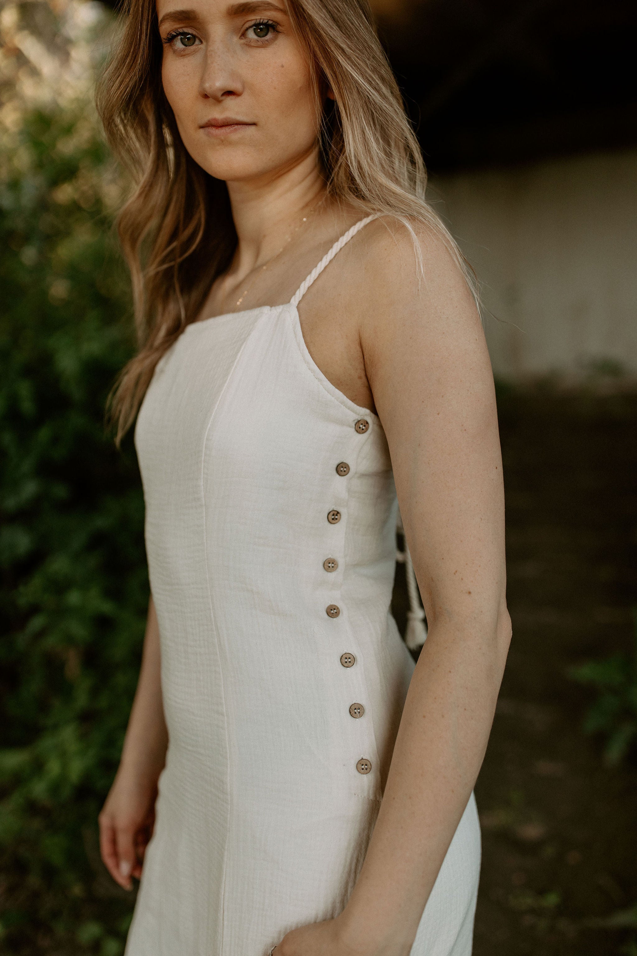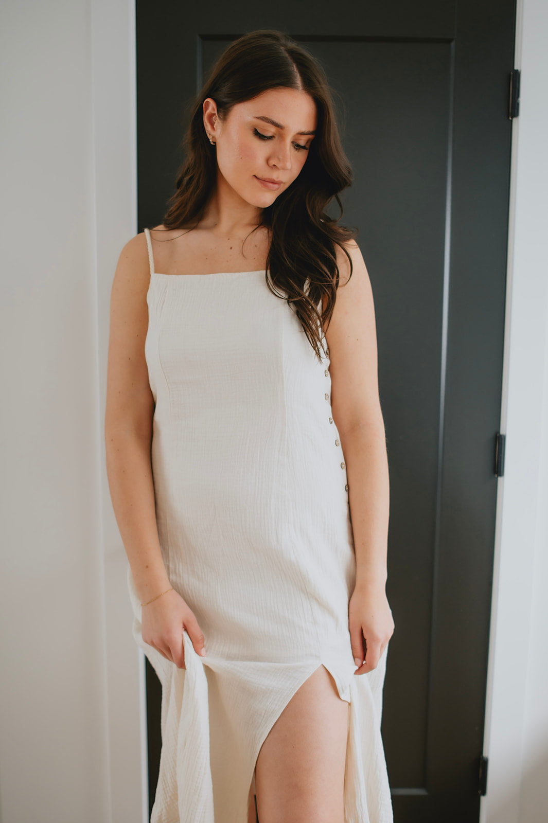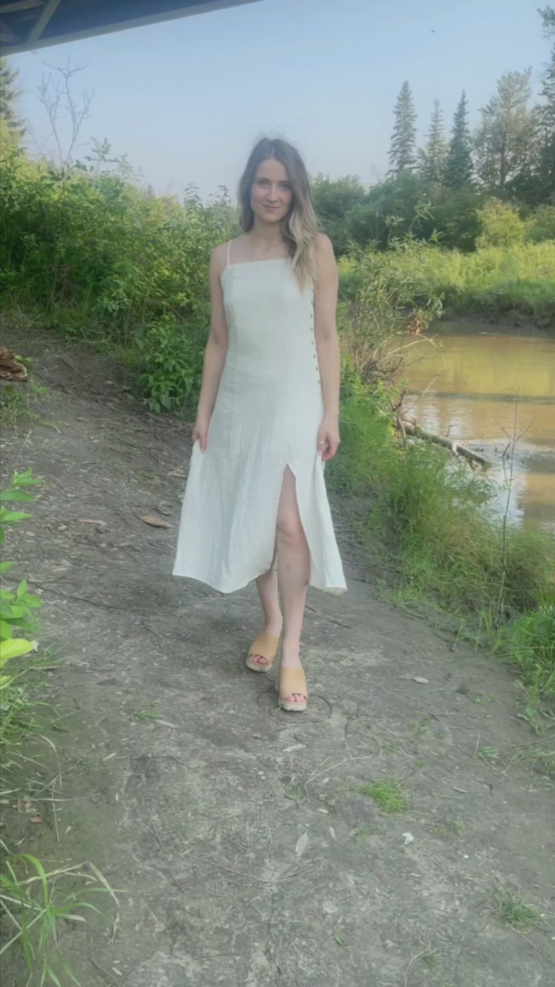 Feel like Ariel straight from out of the sea it this gorgeous maxi dress. Perfect for a day at the beach, this 100% cotton dress features maxi length, button details, and a leg slit for added movement.