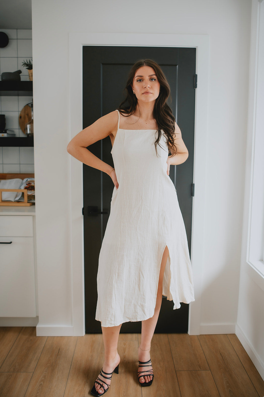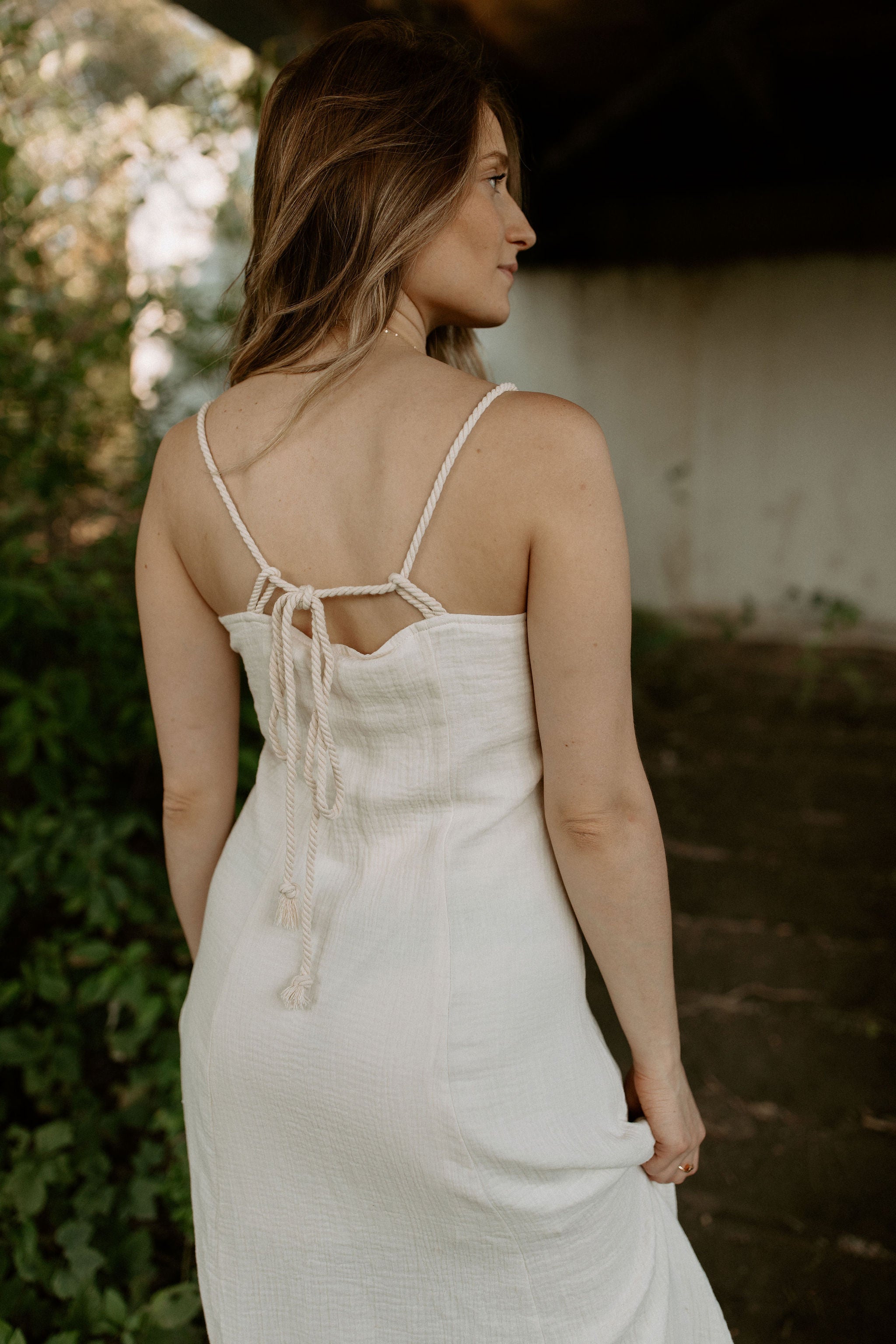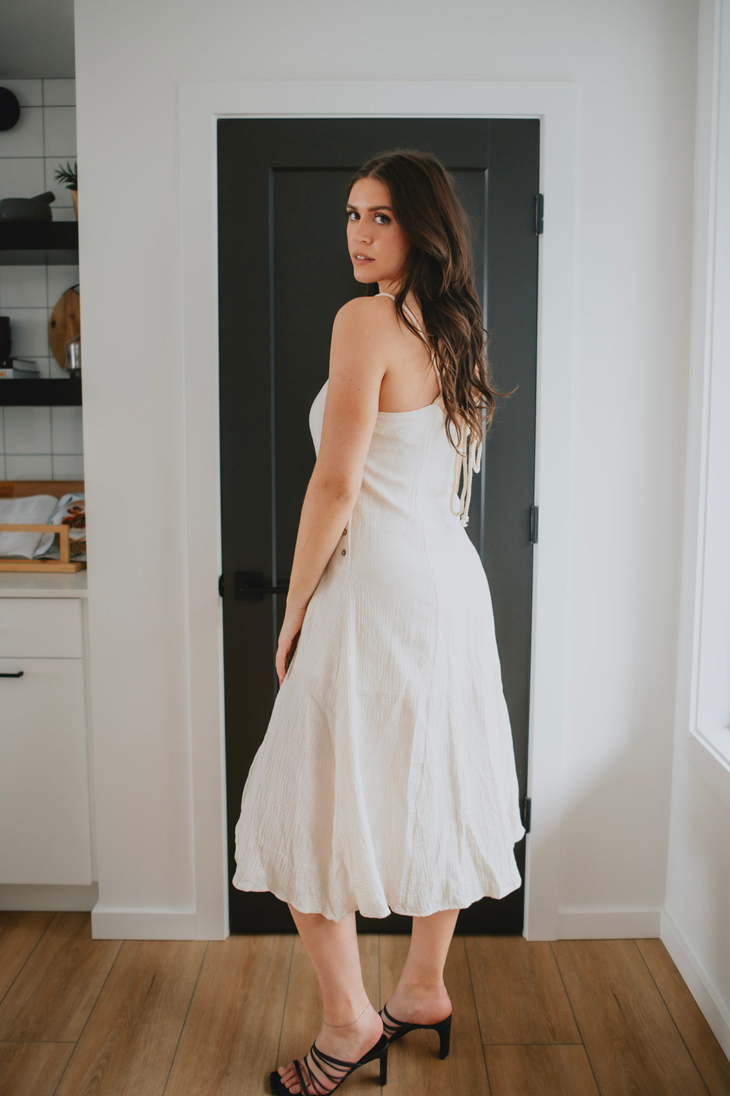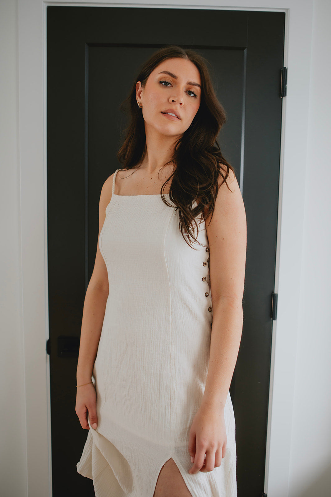 Feel like Ariel straight from out of the sea it this gorgeous maxi dress. Perfect for a day at the beach, this 100% cotton dress features maxi length, button details, and a leg slit for added movement.