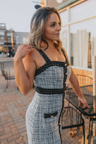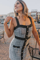This dress will have you wearing a beret and eating croissants in no time! We love the classic elegance that comes with the tweed and pearl combo mixed with the modern bodycon fit. Pair her with tights and a blazer for the office or out to drinks! She truly is a sweetie.