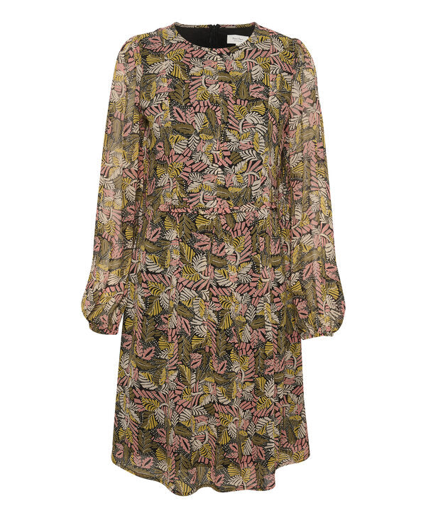 Introducing Part Two's Cirkeline Dress, the perfect addition to your Fall wardrobe. Featuring a round neckline and a slightly fitted waist, this easy to wear dress is designed with a subtle black and brown leaf print which means it's perfect worn on its own or for layering with a sweater or blazer. This chiffon dress is so versatile, it'll make it easy for you to head out in style all season long!