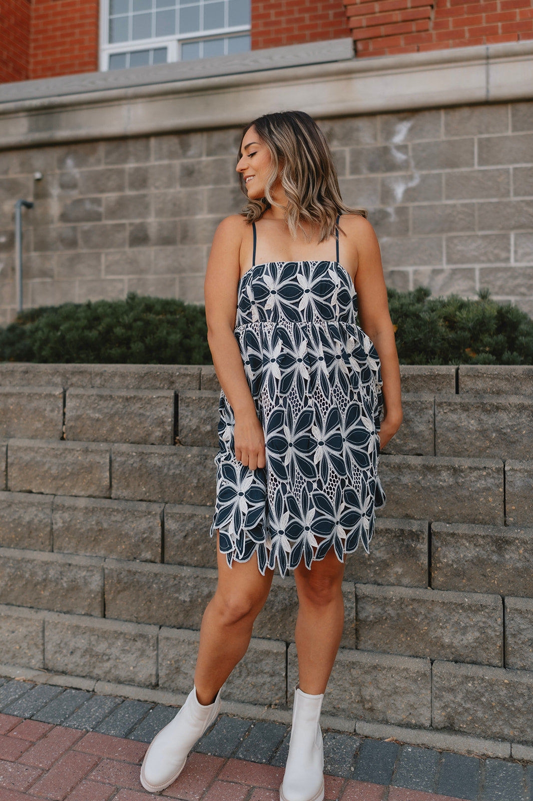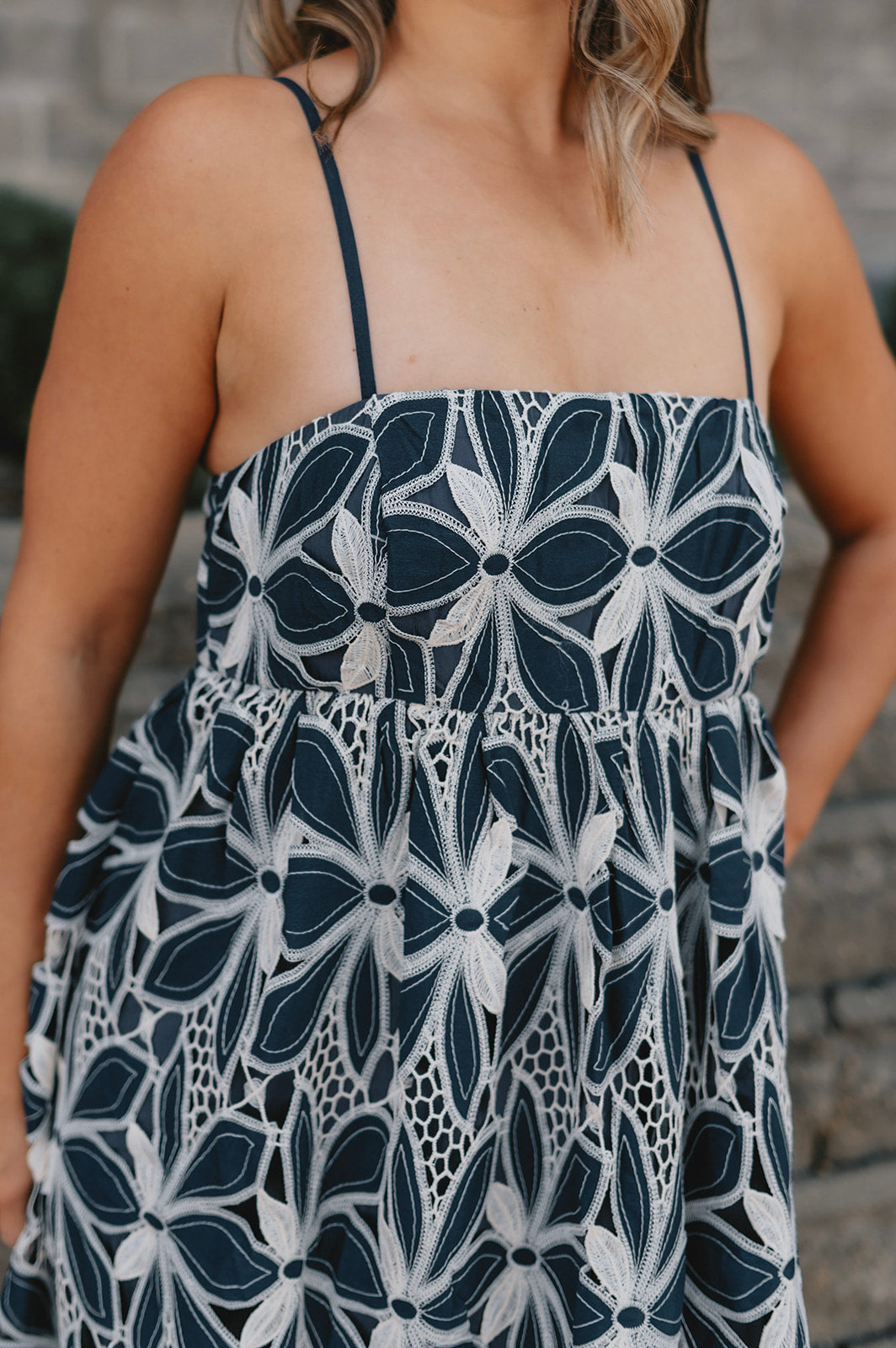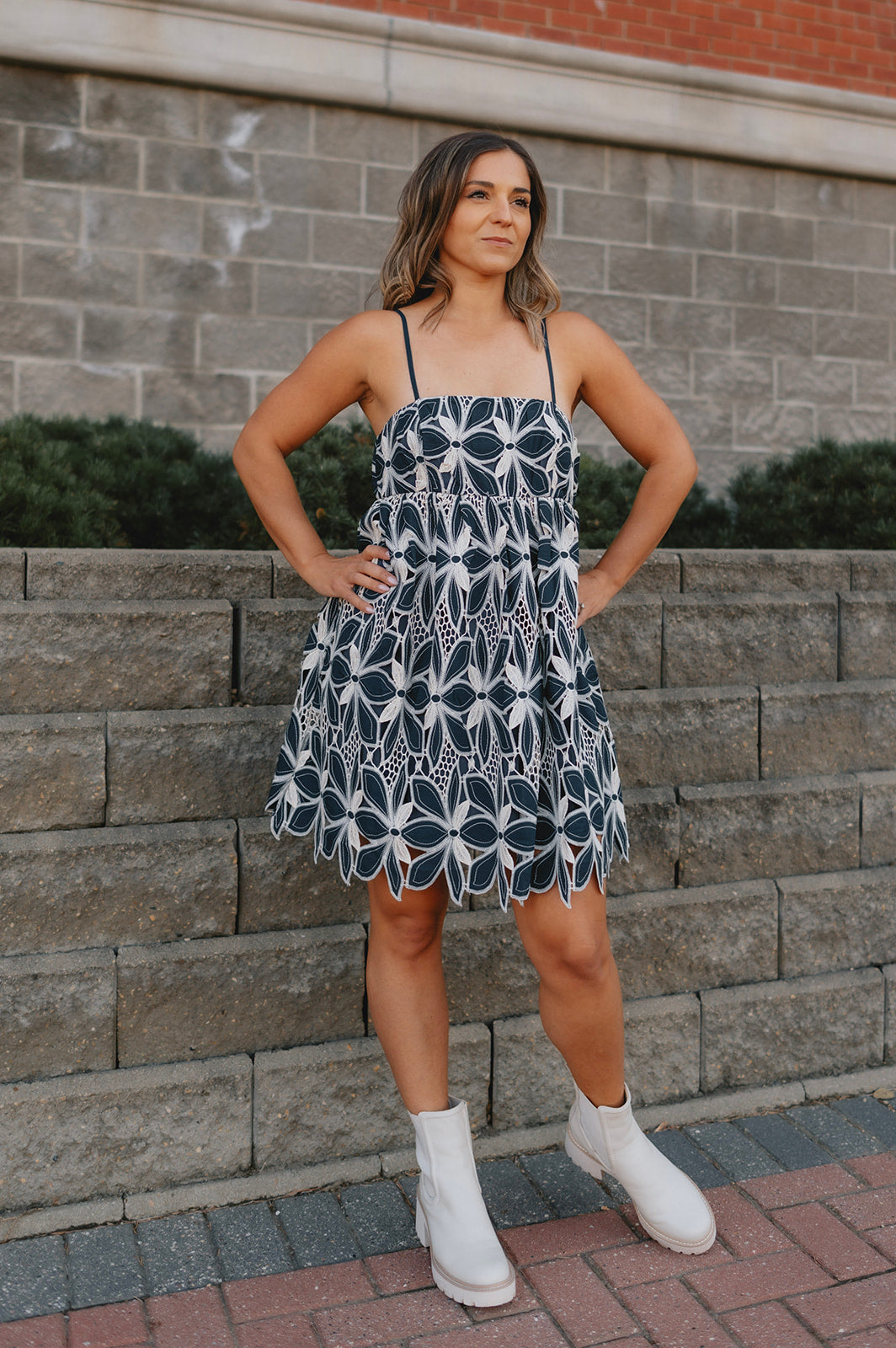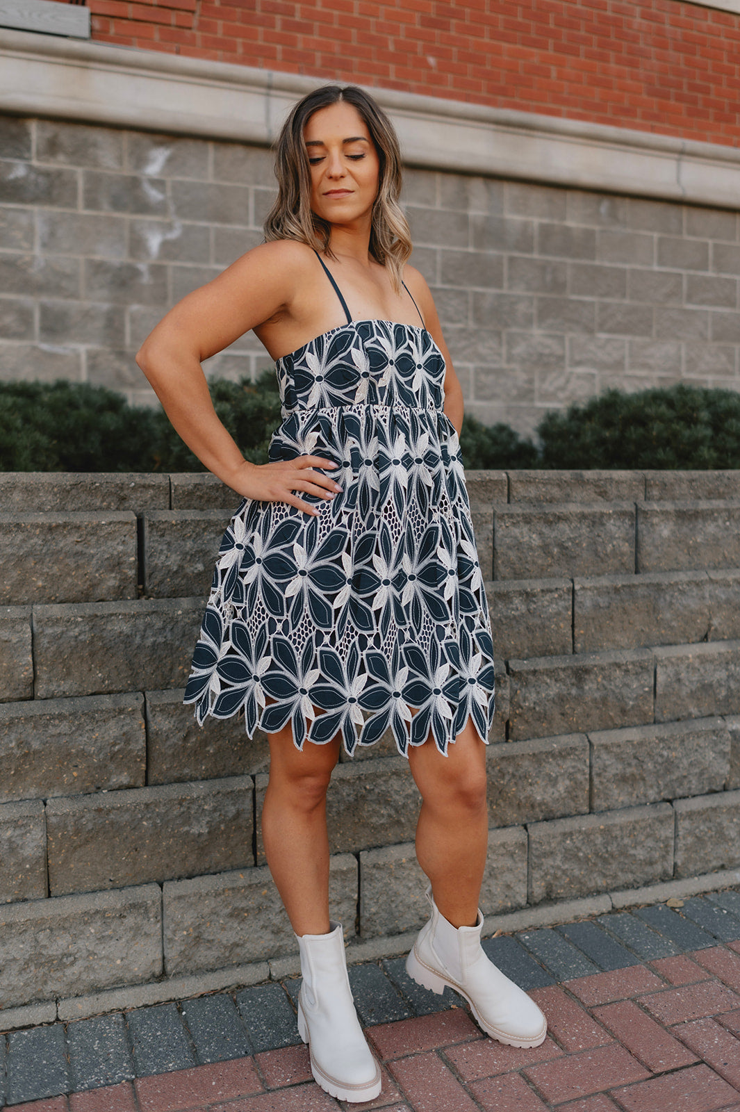 The Clea is a baby doll style mini dress with large crochet & embroidered flowers. She has a straight neckline, bust darts, adjustable spaghetti straps, gathered empire waist, and a back invisible zipper. We love her with a chunky boot and a jacket or with a soft cardigan and strappy heels for a dressy occasion.