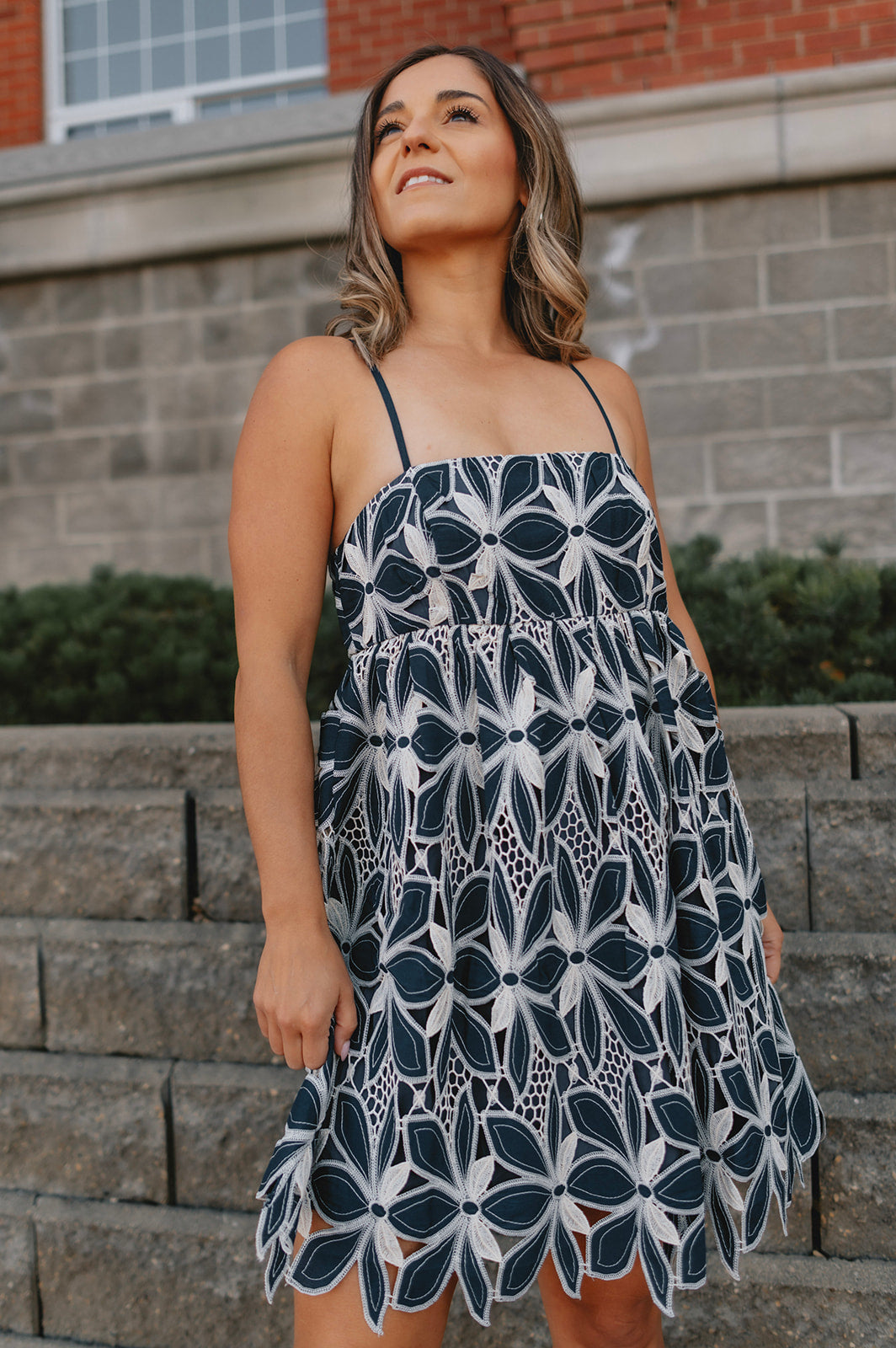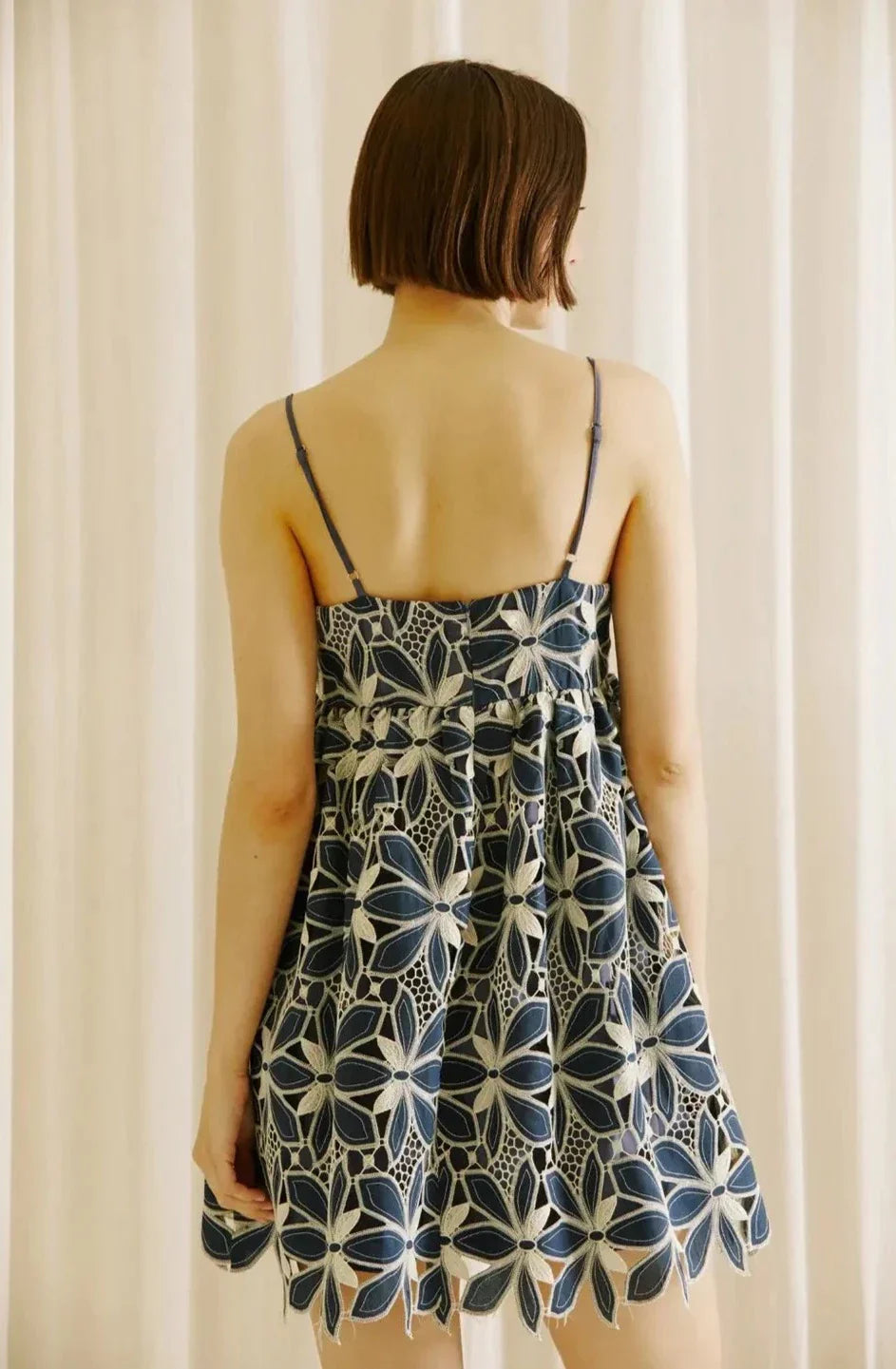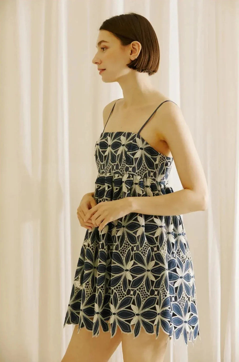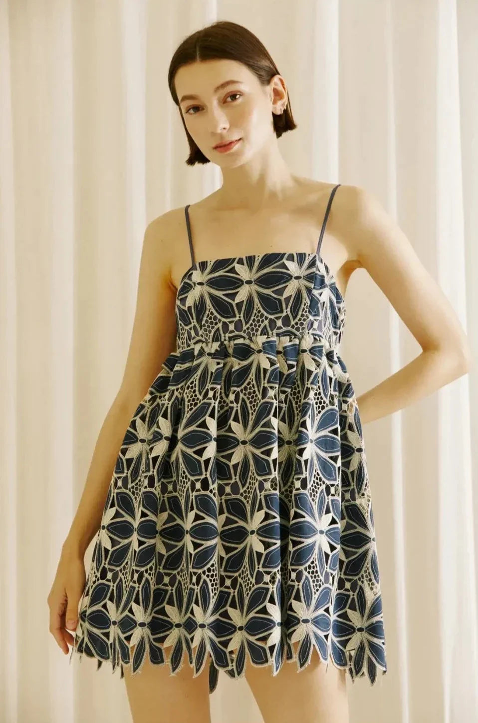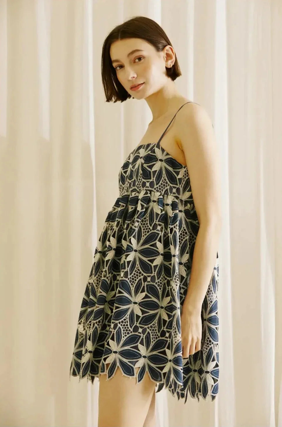 The Clea is a baby doll style mini dress with large crochet & embroidered flowers. She has a straight neckline, bust darts, adjustable spaghetti straps, gathered empire waist, and a back invisible zipper. We love her with a chunky boot and a jacket or with a soft cardigan and strappy heels for a dressy occasion.