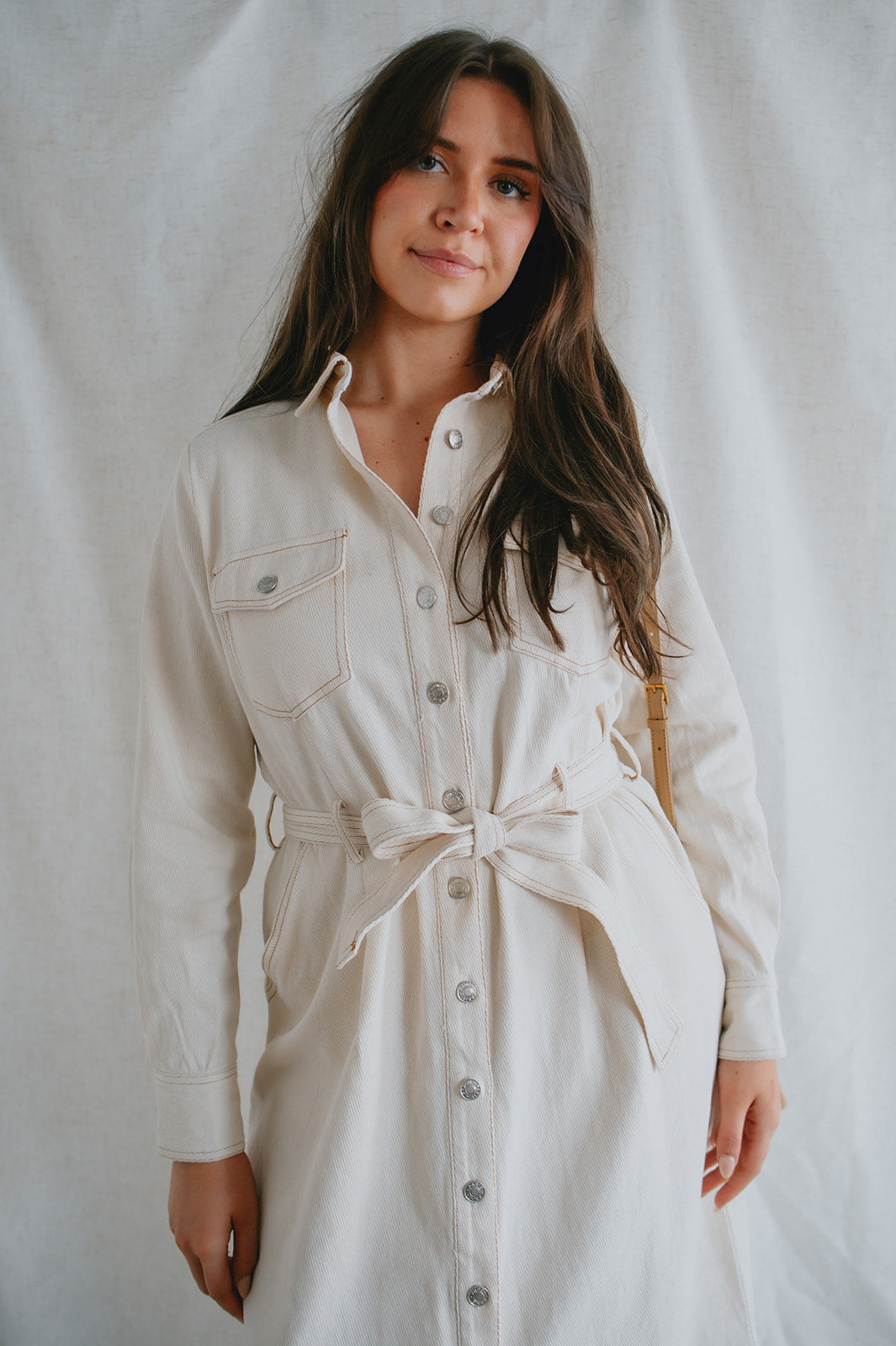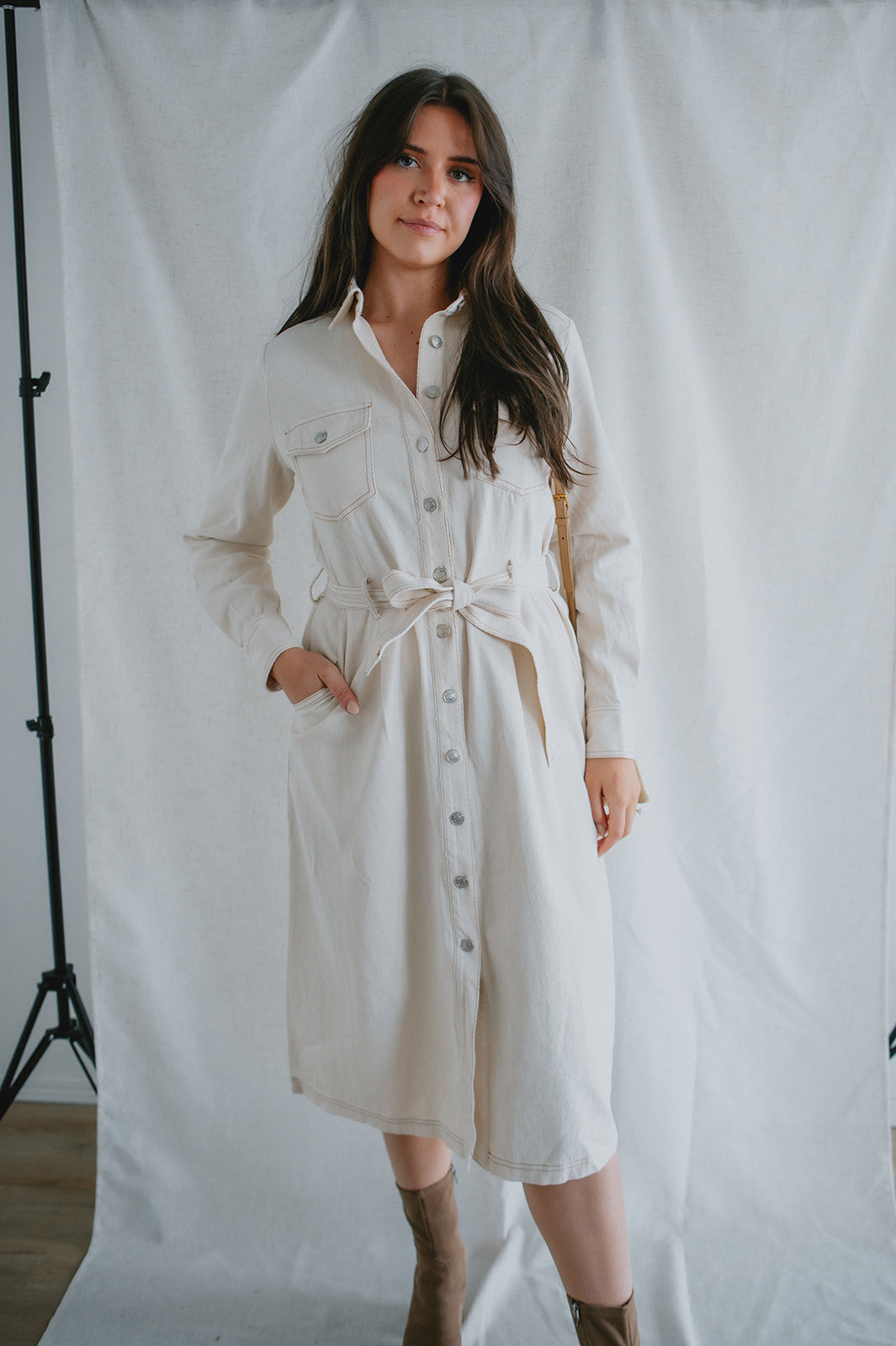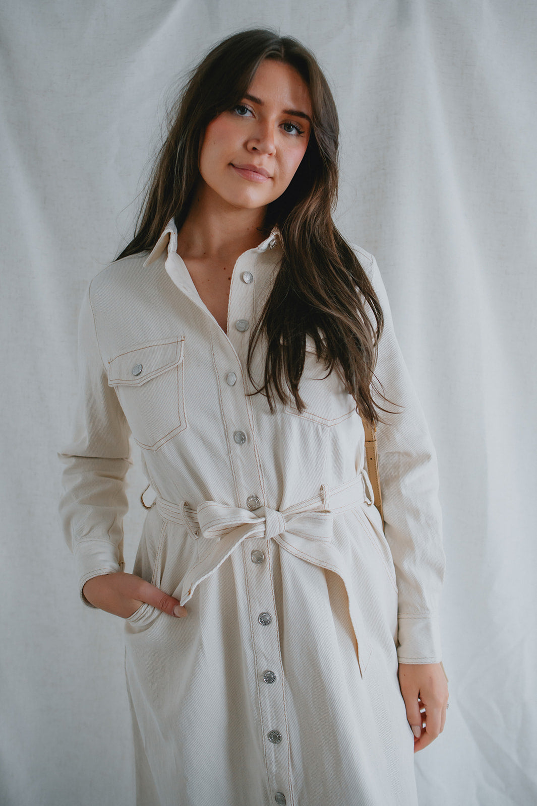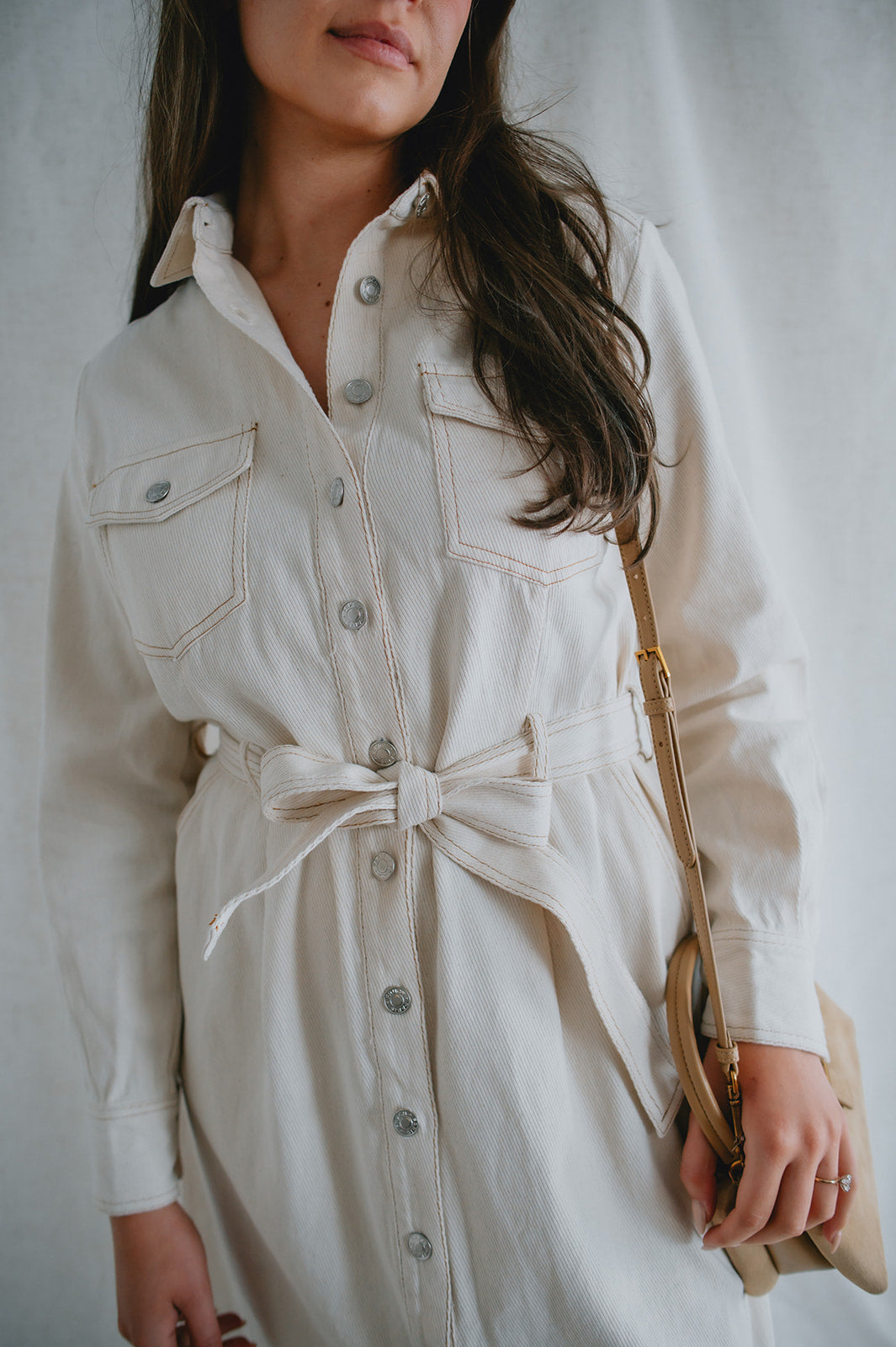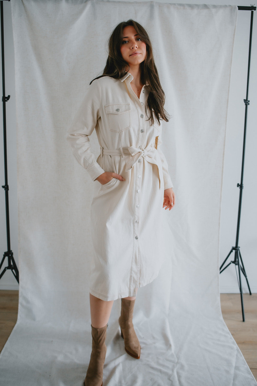 This versatile mid-length shirt dress in denim features stylish chest patch pockets and convenient side pockets. It comes with a removable belt for a customizable fit and is finished with contrasting stitching for a chic, modern look. Perfect for casual outings or dressing up with accessories!