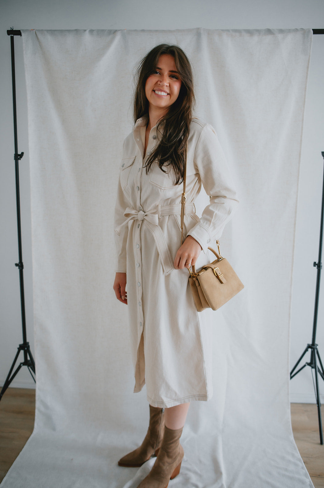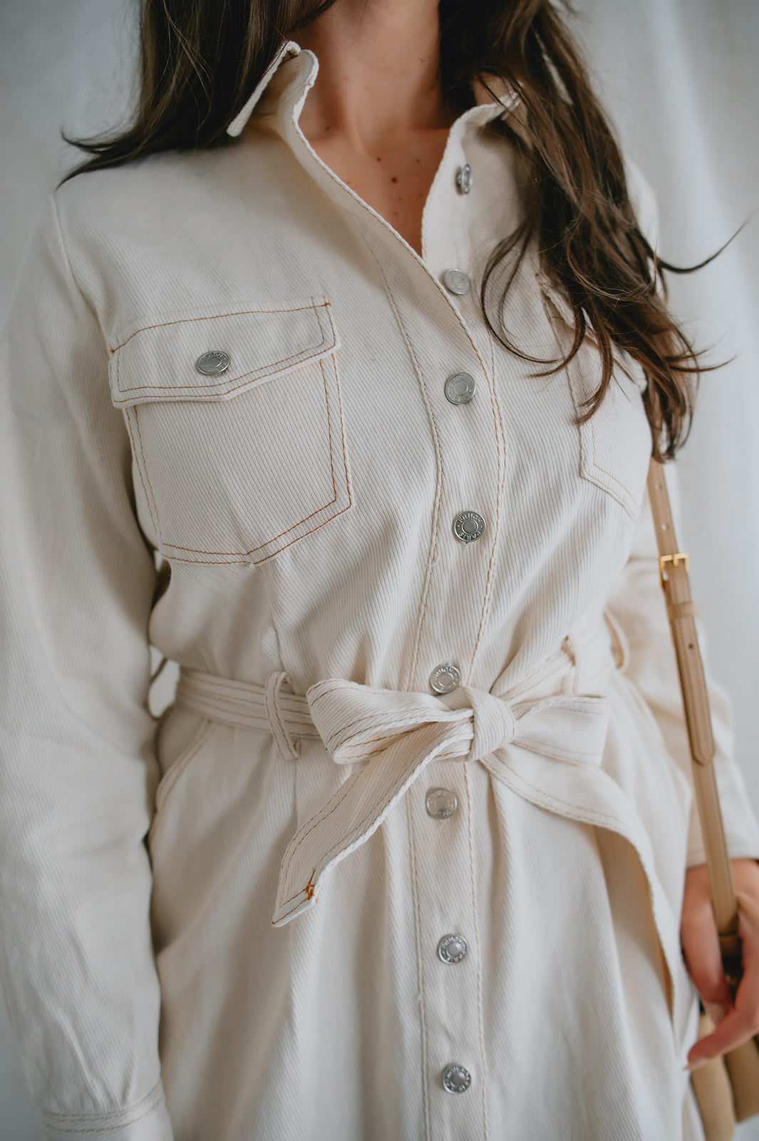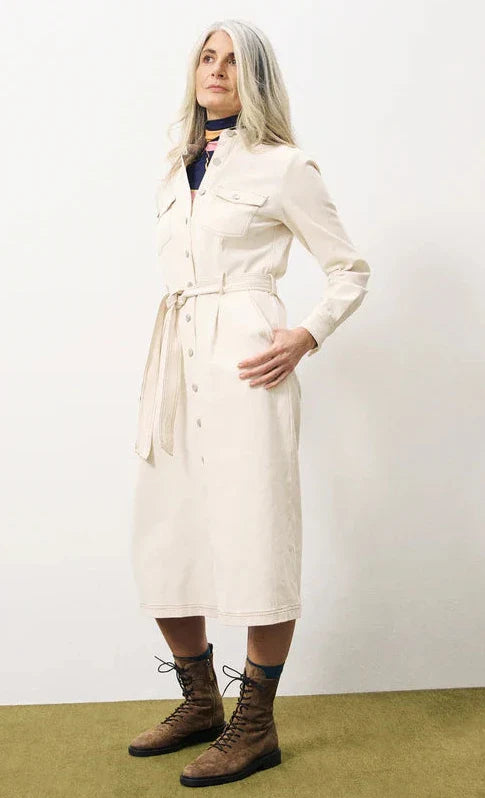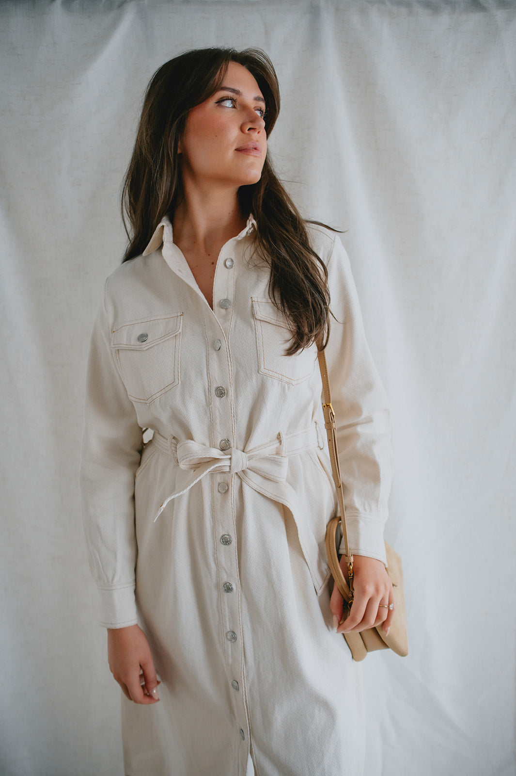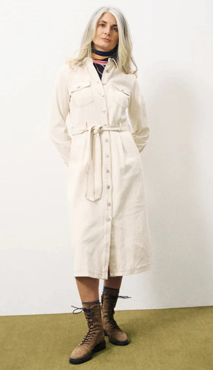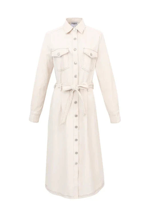 This versatile mid-length shirt dress in denim features stylish chest patch pockets and convenient side pockets. It comes with a removable belt for a customizable fit and is finished with contrasting stitching for a chic, modern look. Perfect for casual outings or dressing up with accessories!