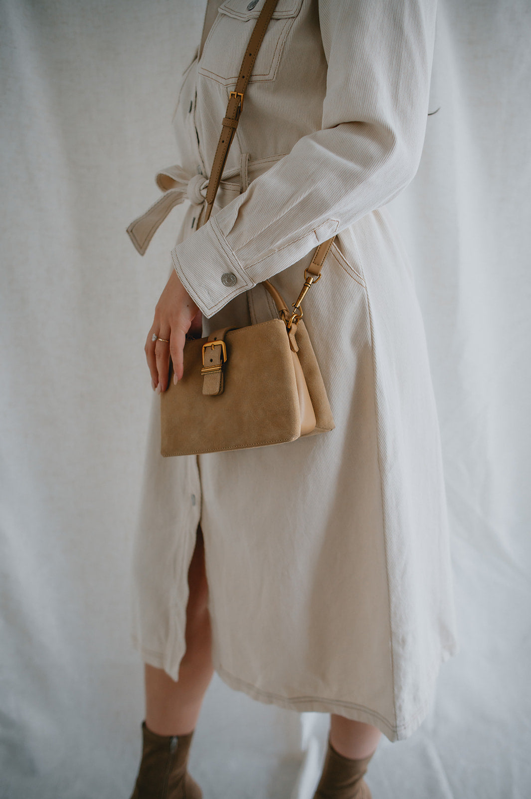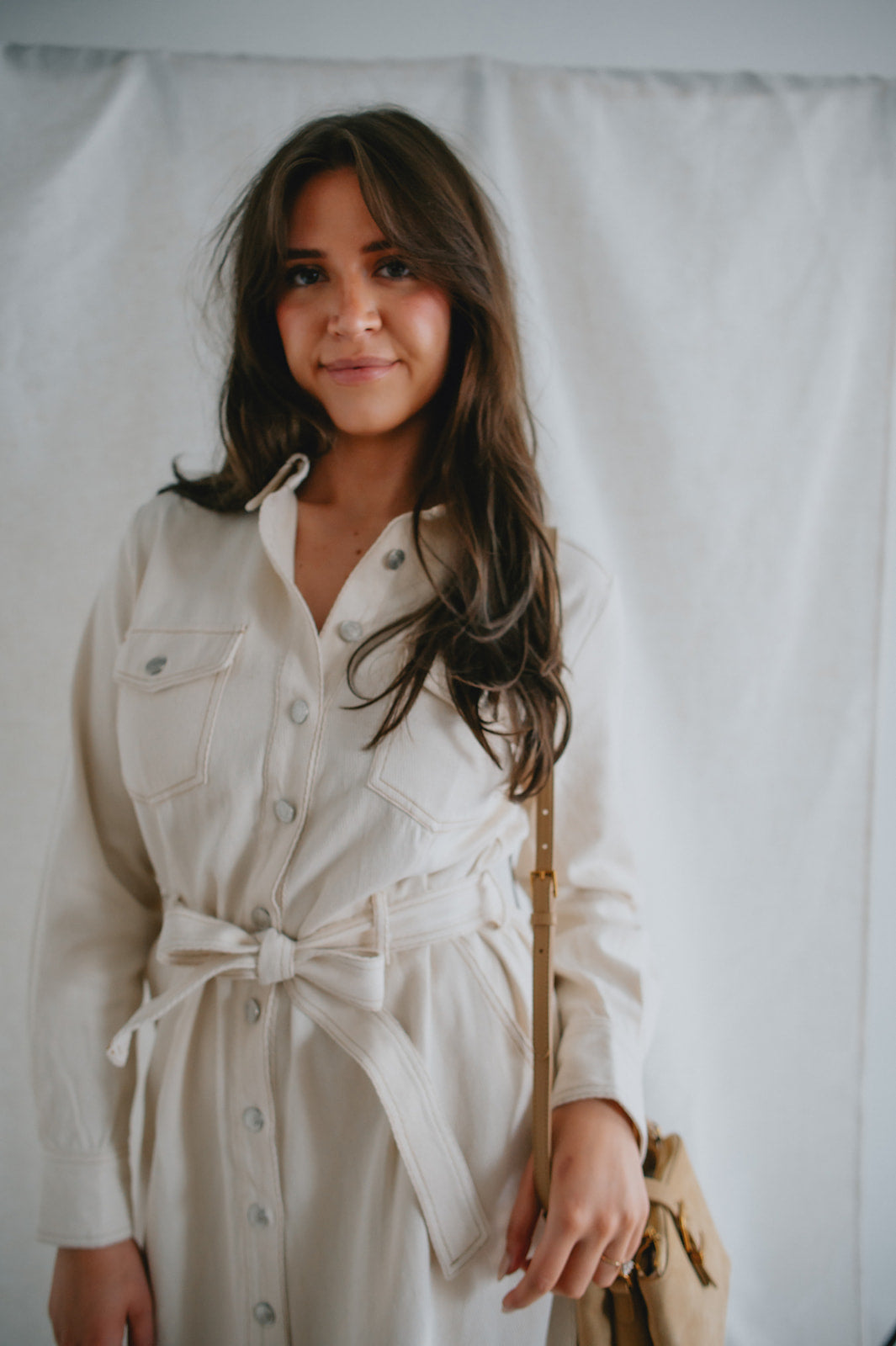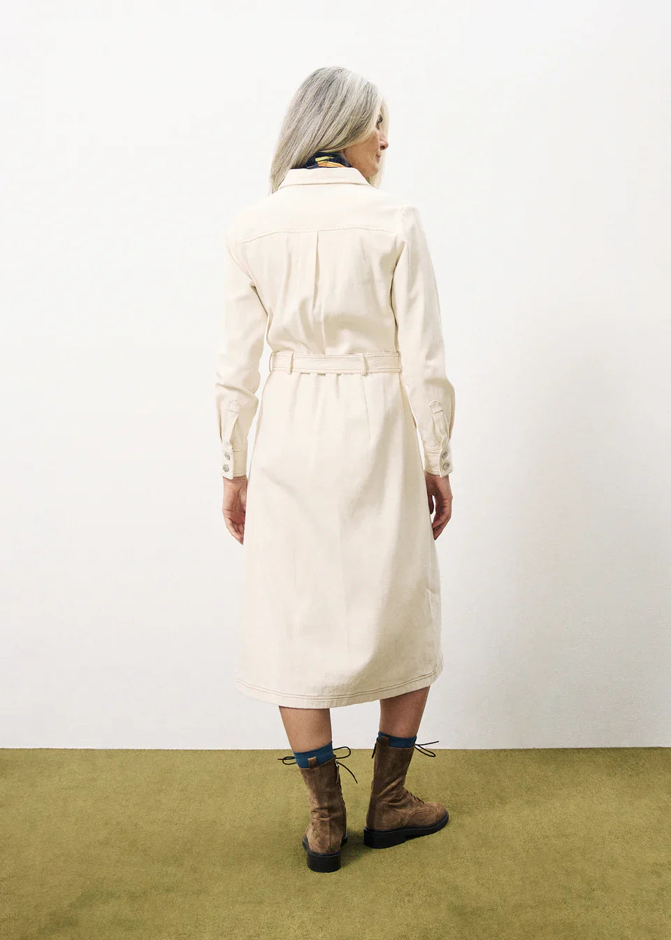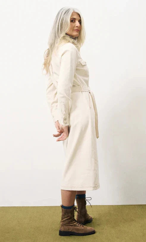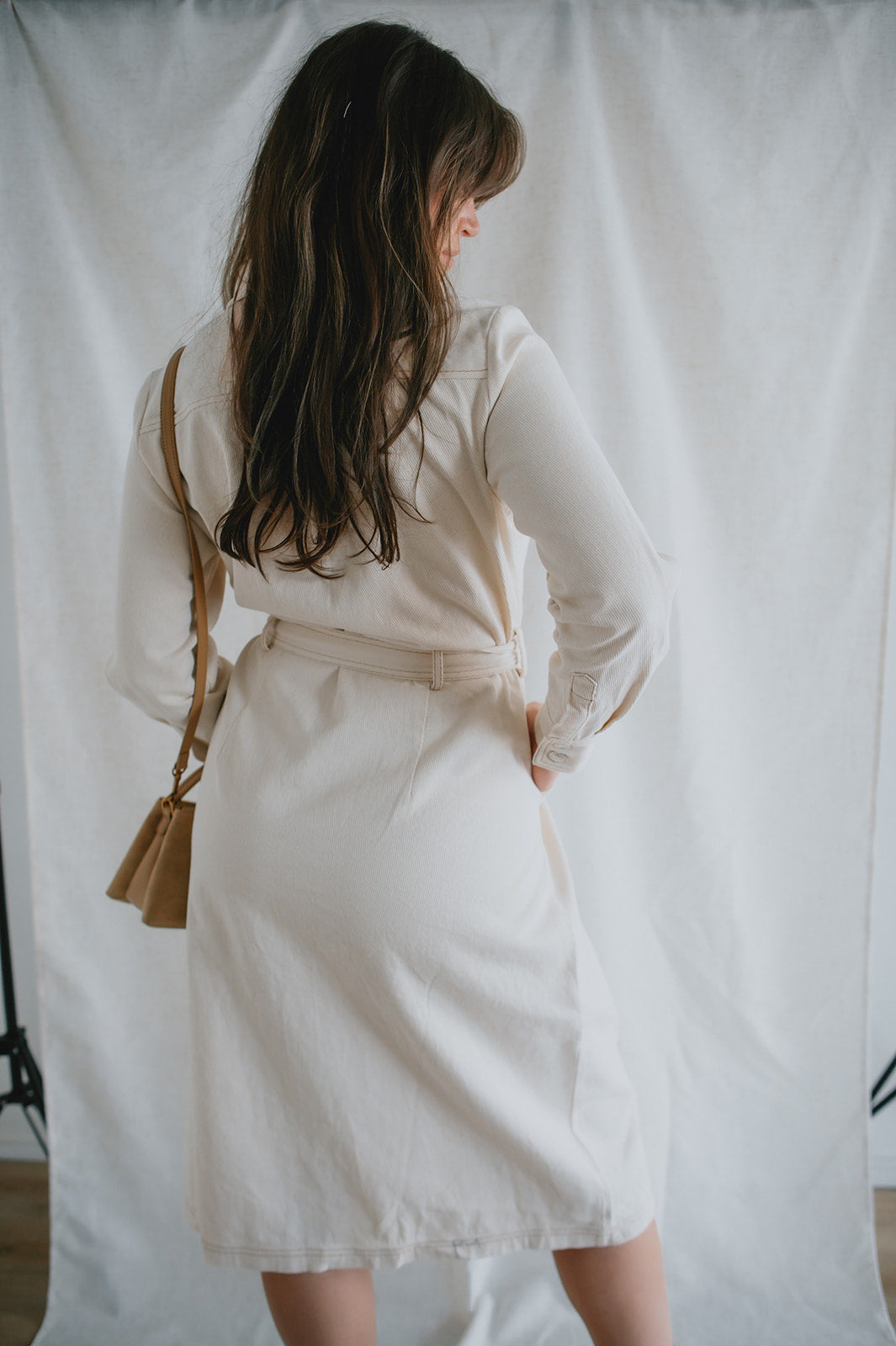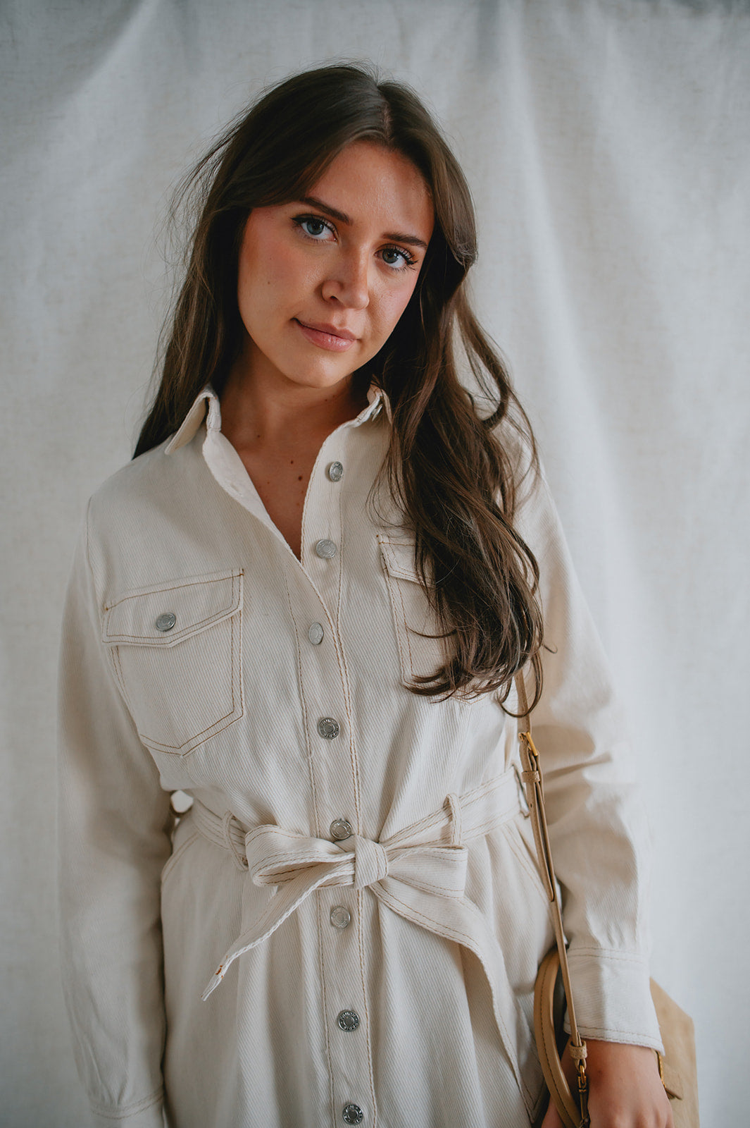 This versatile mid-length shirt dress in denim features stylish chest patch pockets and convenient side pockets. It comes with a removable belt for a customizable fit and is finished with contrasting stitching for a chic, modern look. Perfect for casual outings or dressing up with accessories!