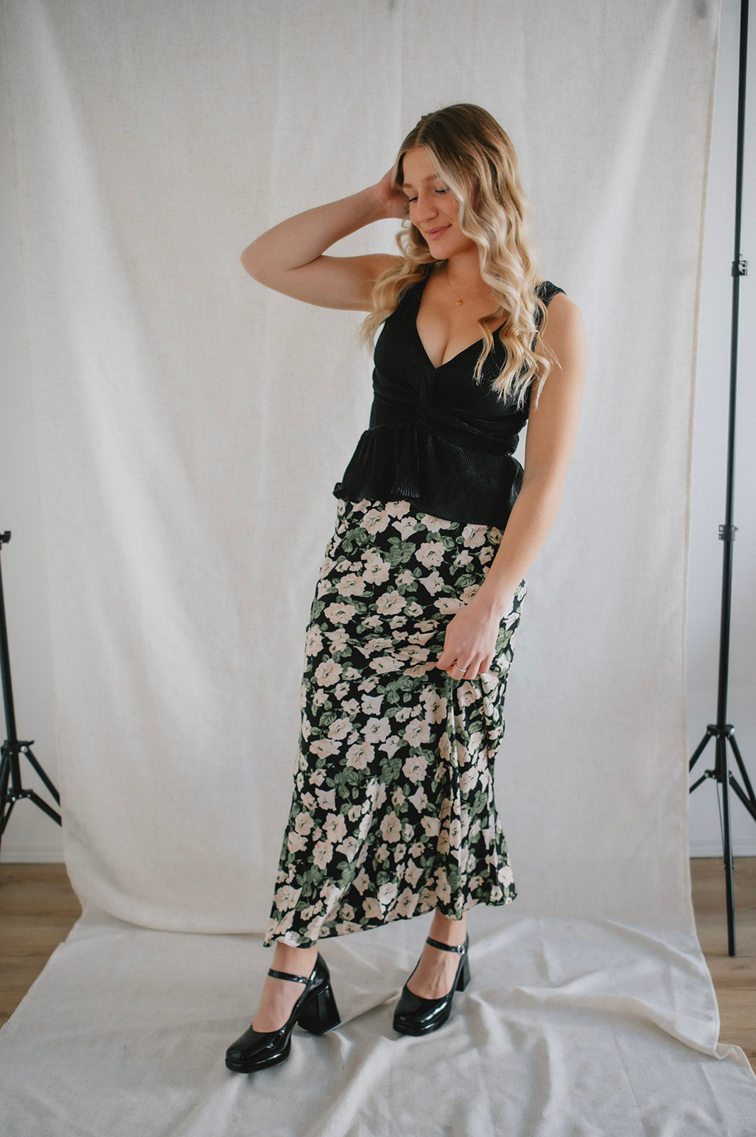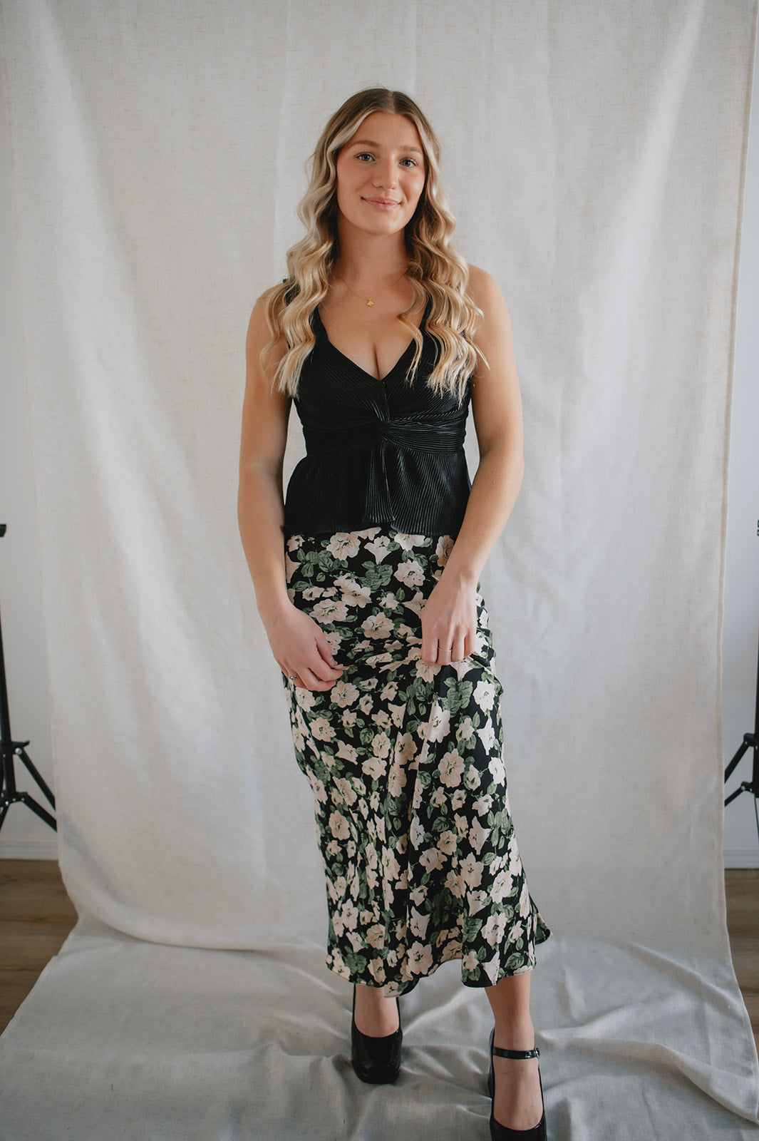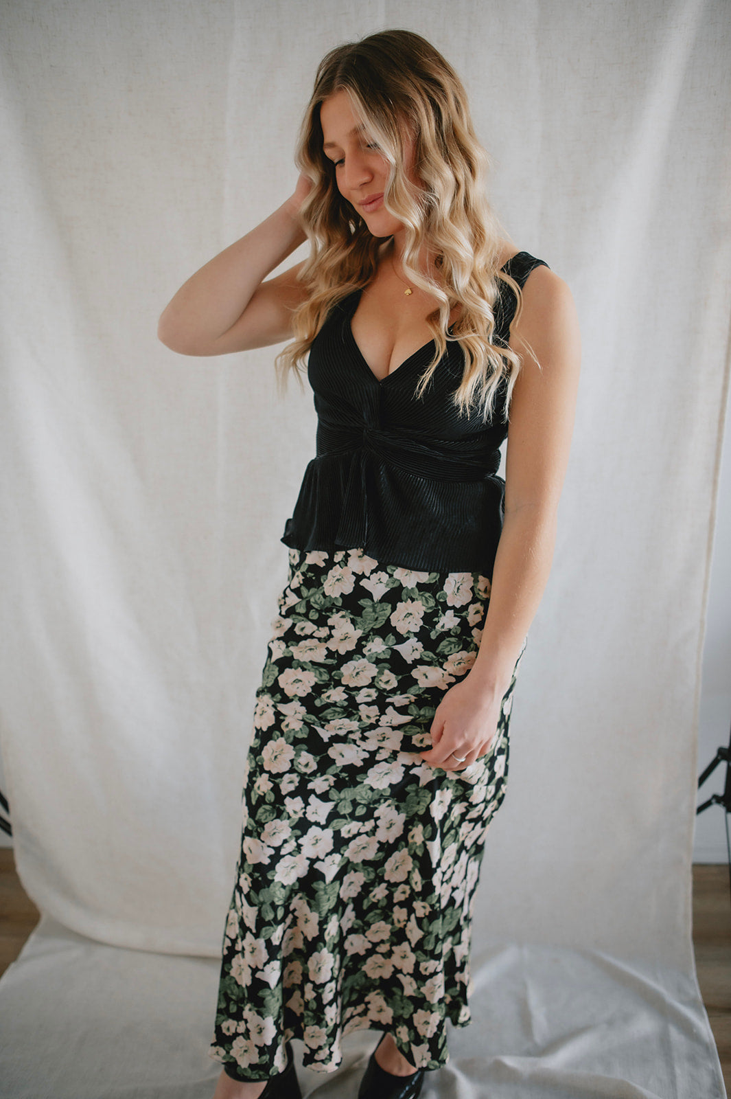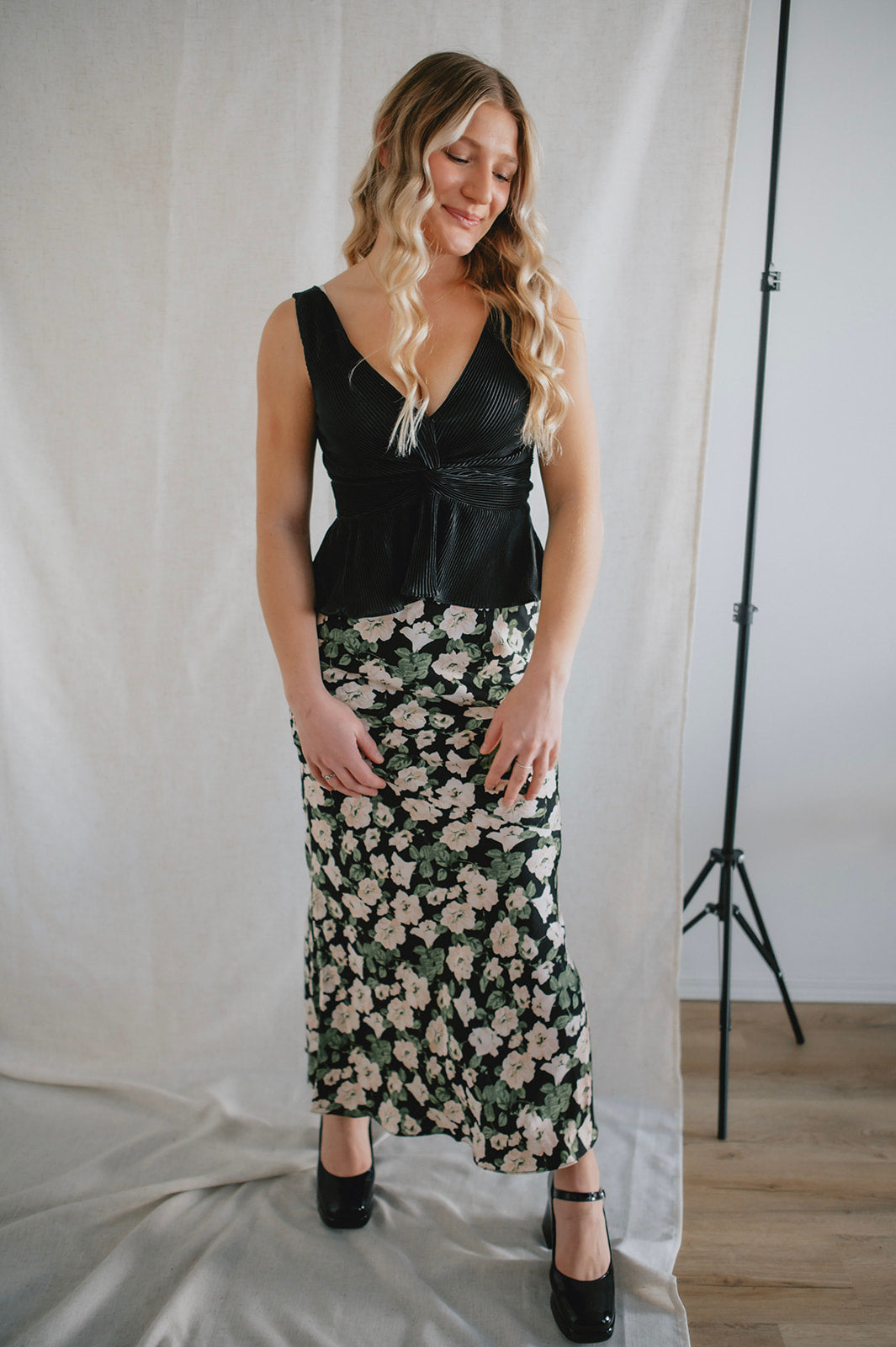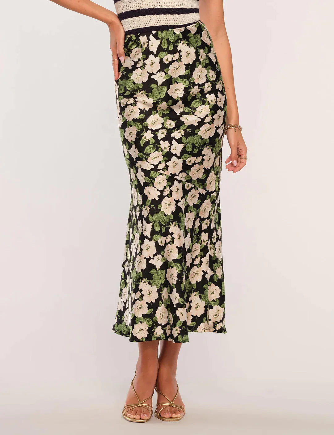 Contouring to the body in our flowery print fabric, the Fiona Skirt is a must-have. It features an hidden elasticized waistband to make it an easy pull-on style.