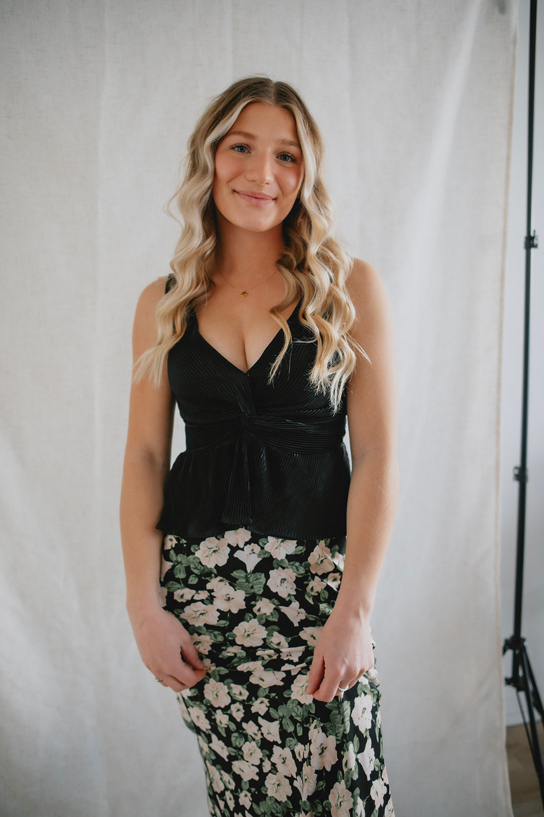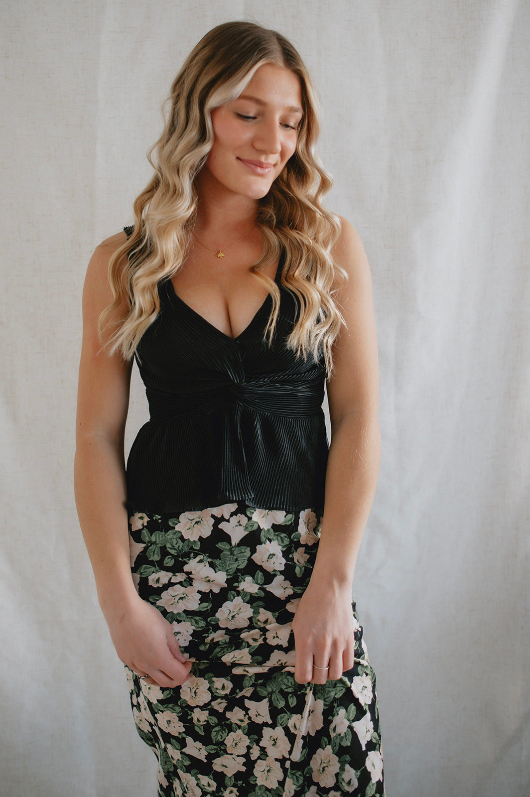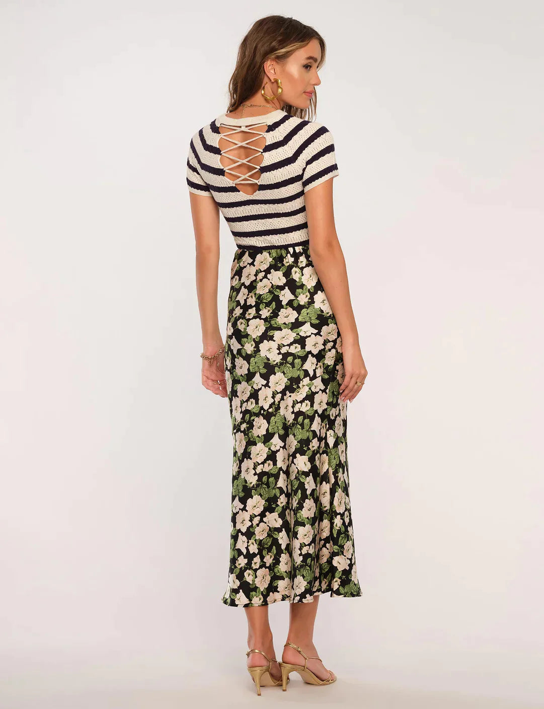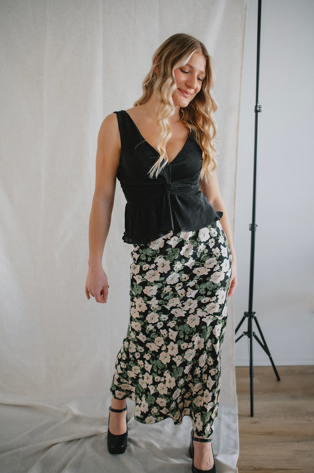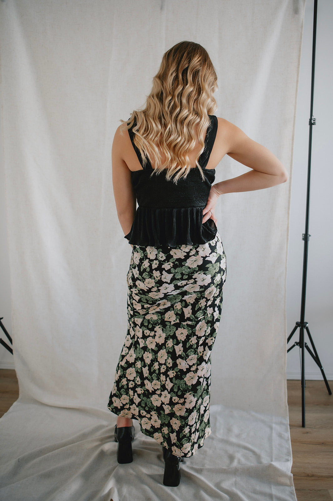 Contouring to the body in our flowery print fabric, the Fiona Skirt is a must-have. It features an hidden elasticized waistband to make it an easy pull-on style.