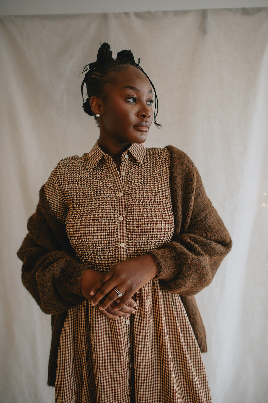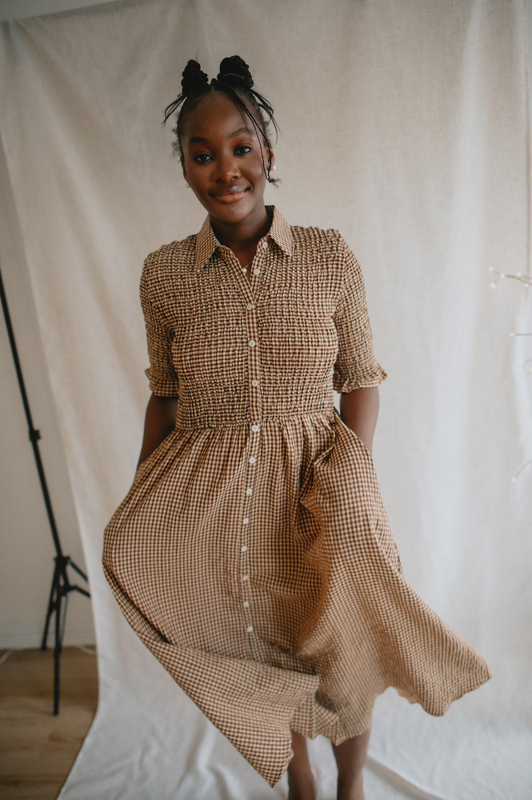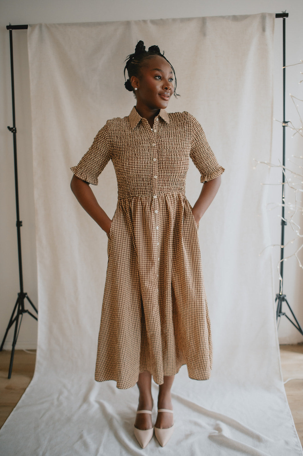 Elevate your everyday style with the Heritage Button-Up Midi Dress, a charming blend of timeless design and modern comfort. Crafted in a warm brown and tan gingham check, this dress features a flattering smocked bodice that offers a snug, flexible fit. The collared neckline adds a classic touch, while the button-down front brings ease and versatility to your wardrobe.