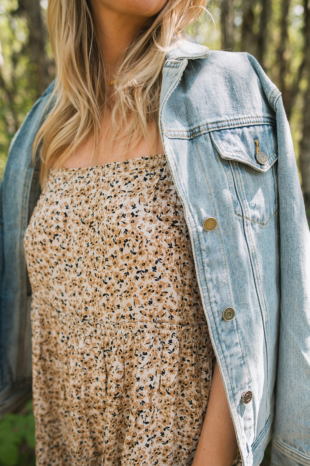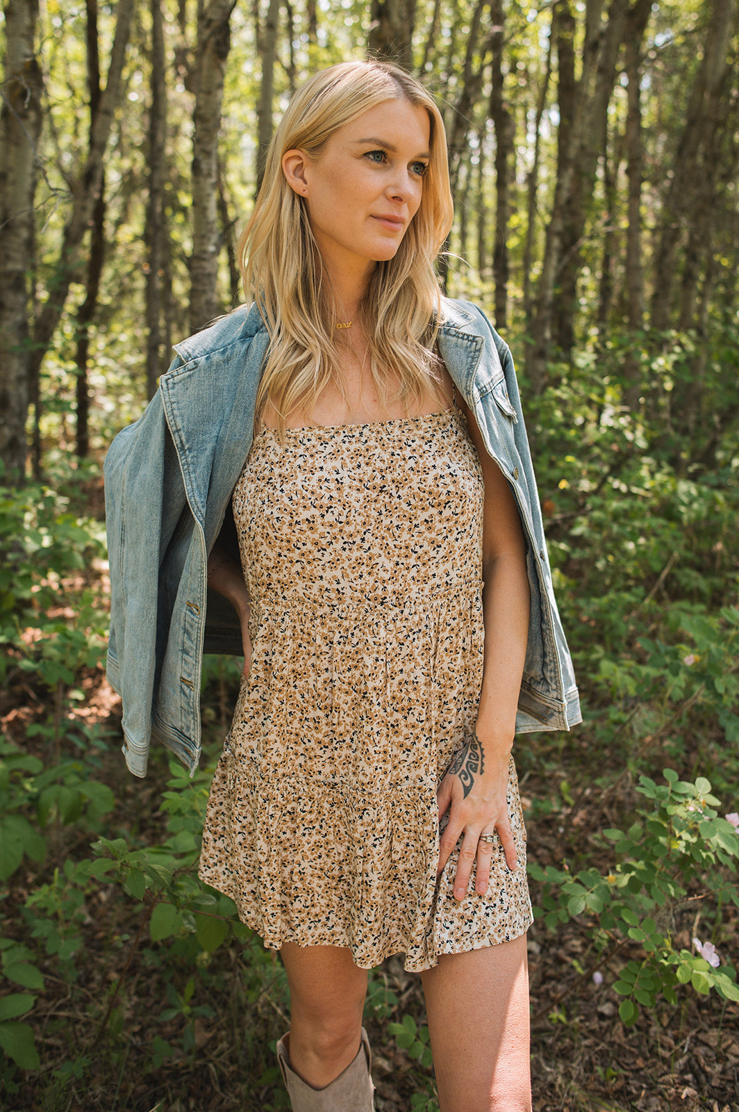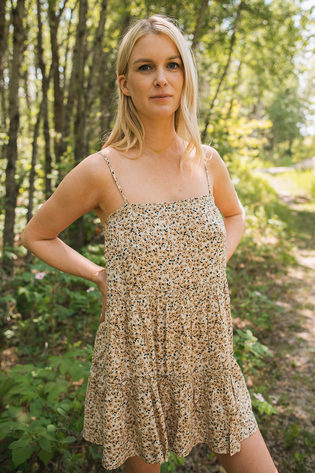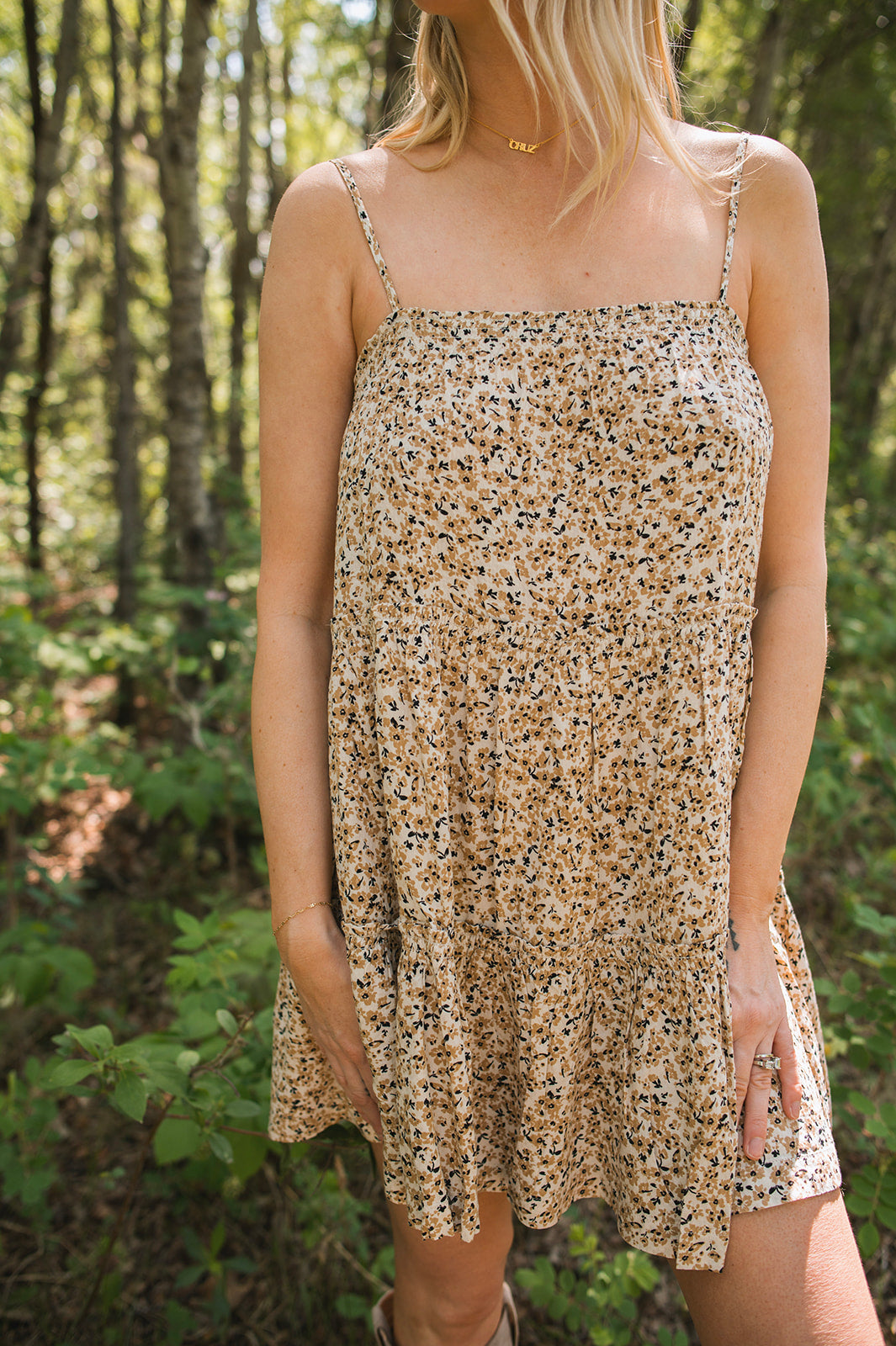The perfect transitional piece! Introduce your spring wardrobe with our short sleeve Jupiter Mini Dress, which features spaghetti straps, a flowy fit, and a gorgeous texture. Pair with a blazer or denim jacket to instantly elevate the look. Natural-coloured florals are a stylish segue into the new season!