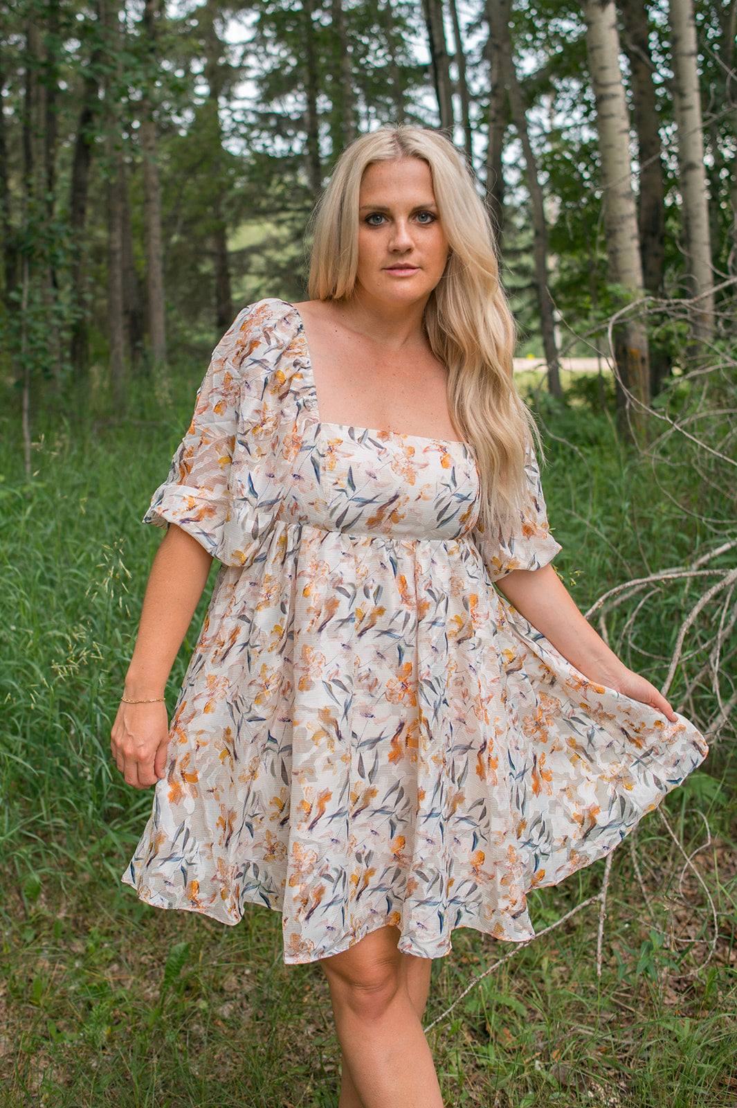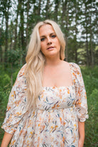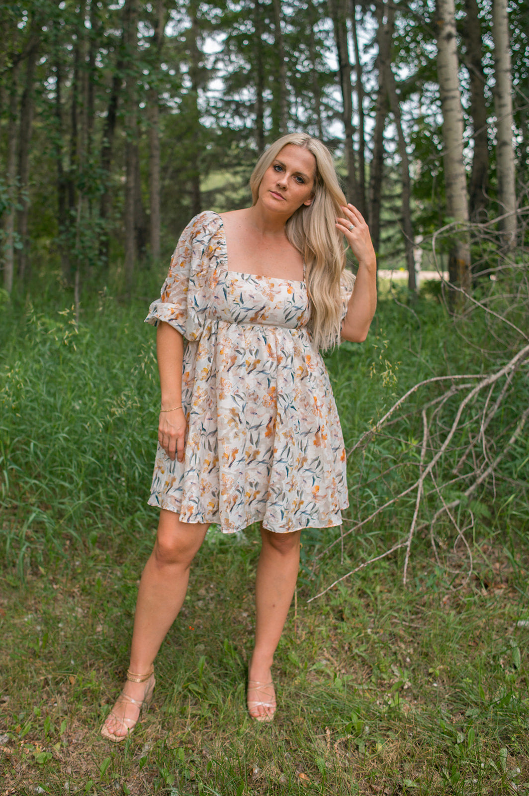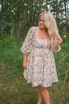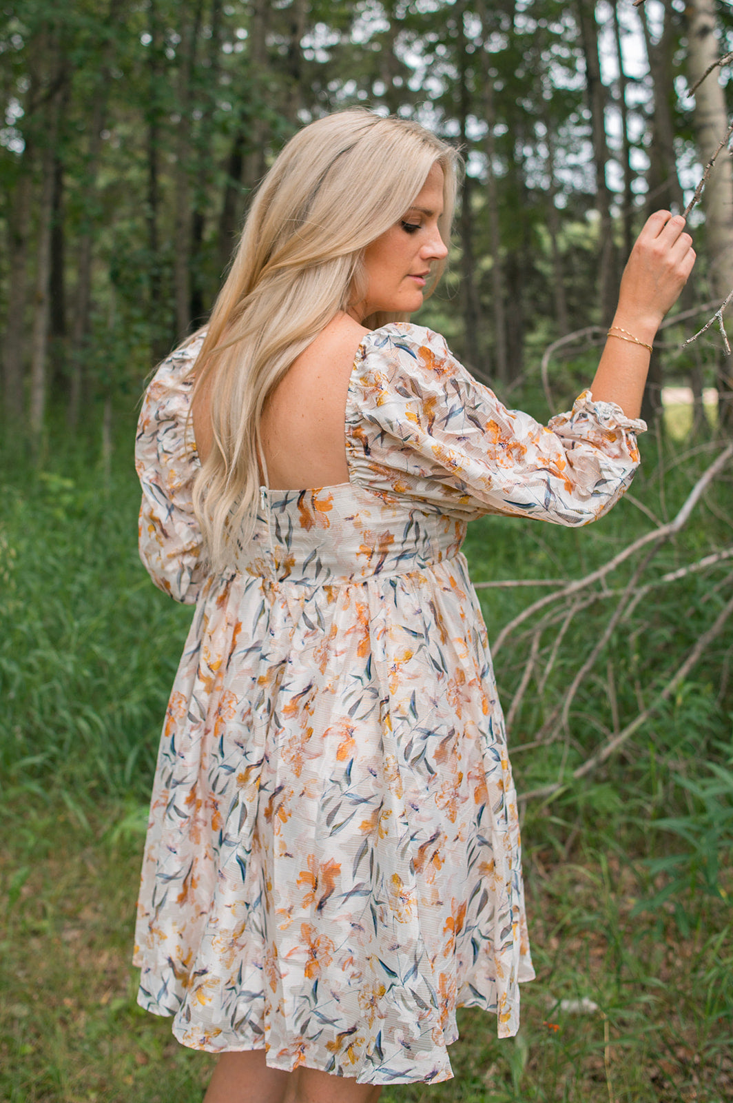 Multi-floral print baby doll mini dress. It reveals a back/front square neckline and oversized 3/4 puffy sleeves with ruffled cuffs. It also exhibits gathering at the waist, a-line lower body, and a back invisible zipper for off/on access.