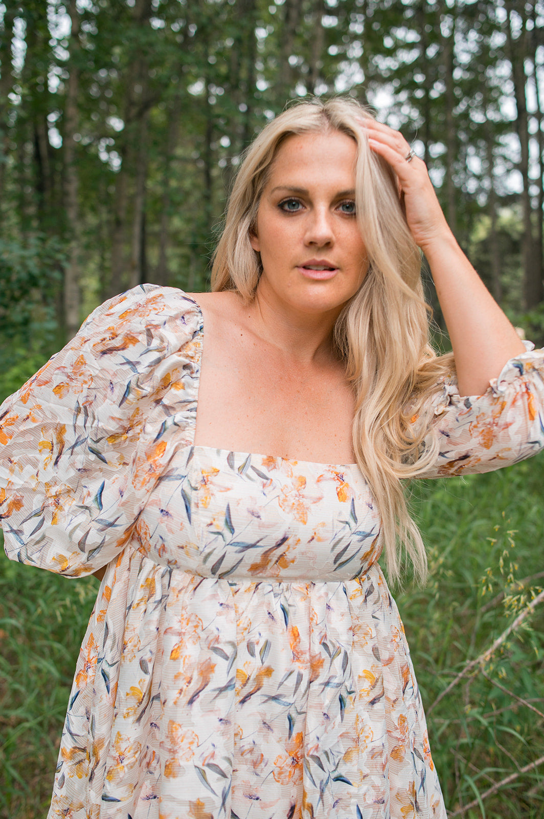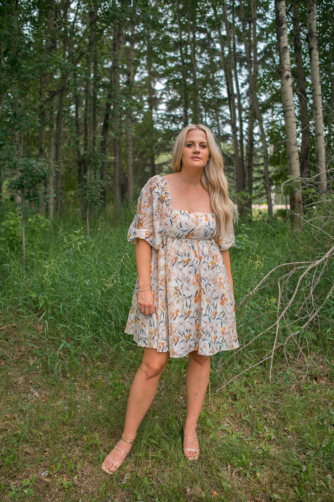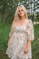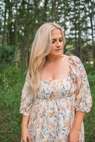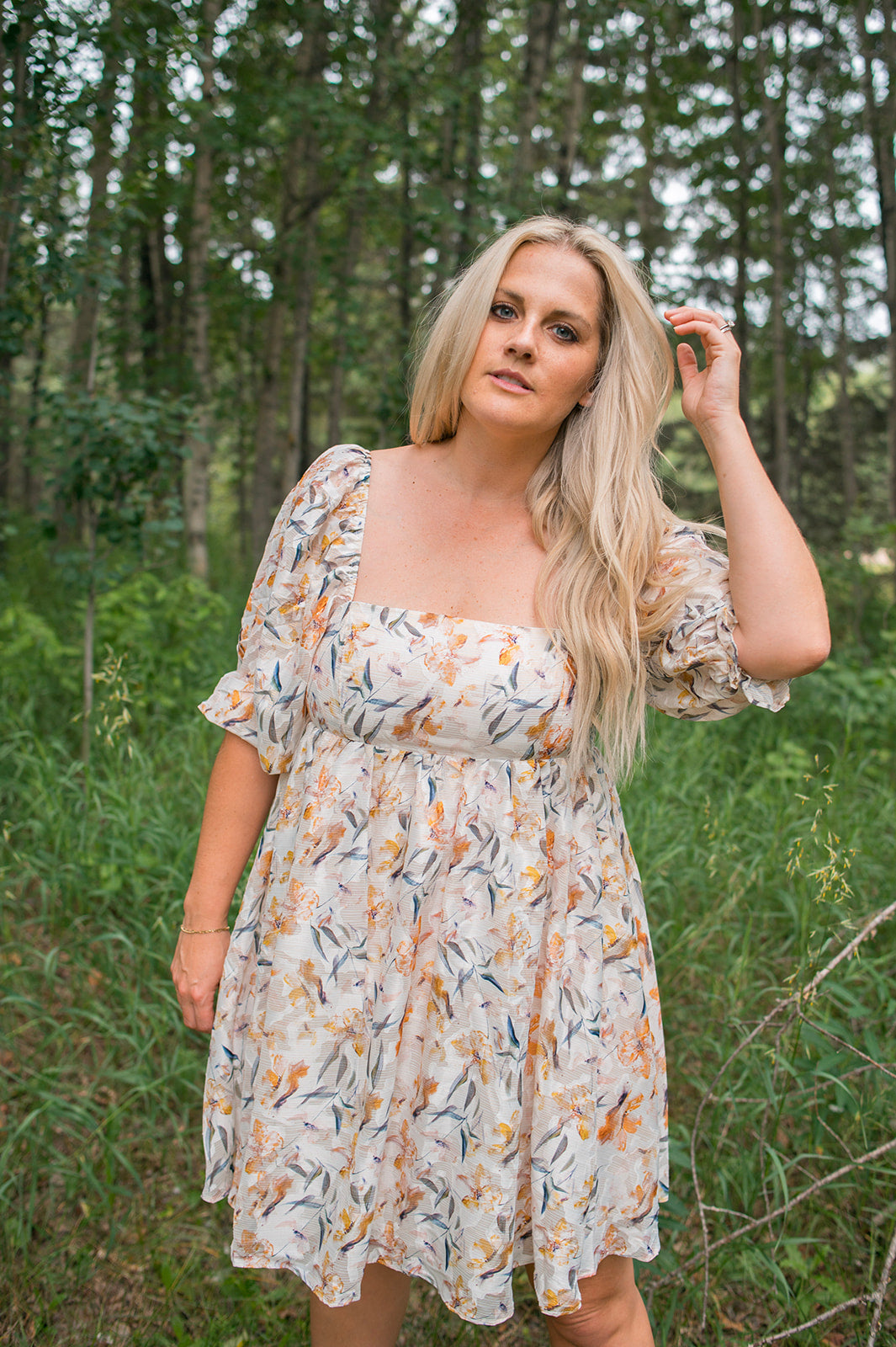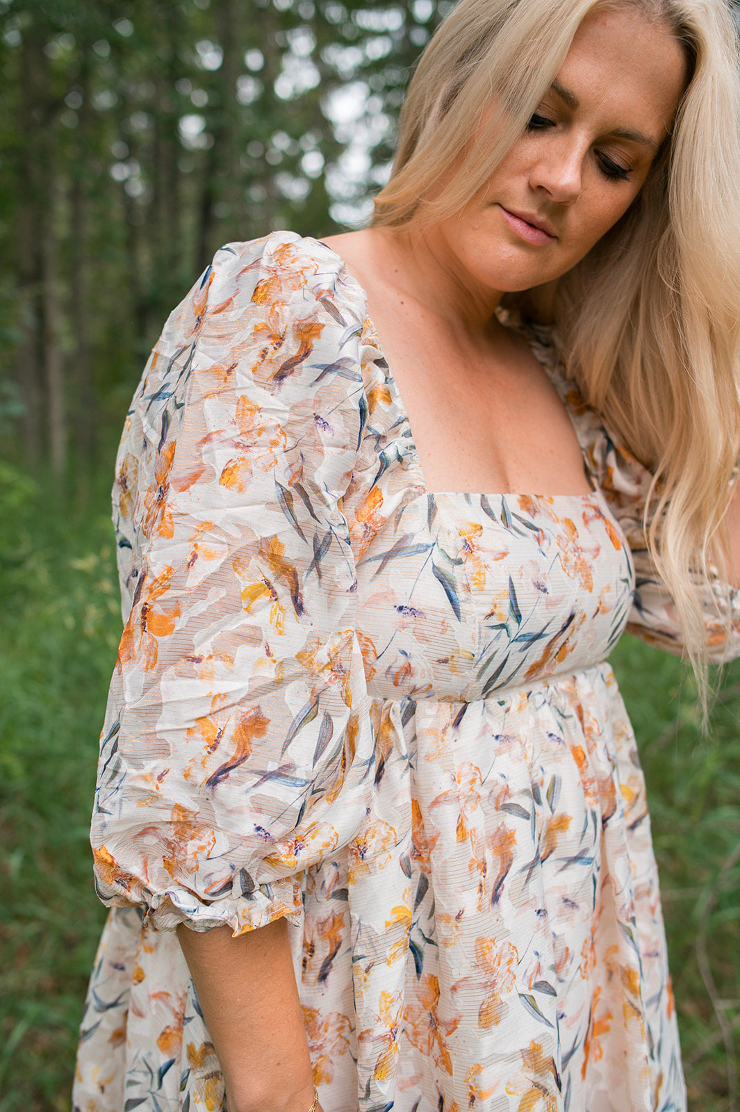 Multi-floral print baby doll mini dress. It reveals a back/front square neckline and oversized 3/4 puffy sleeves with ruffled cuffs. It also exhibits gathering at the waist, a-line lower body, and a back invisible zipper for off/on access.