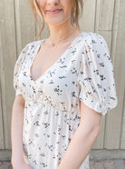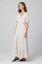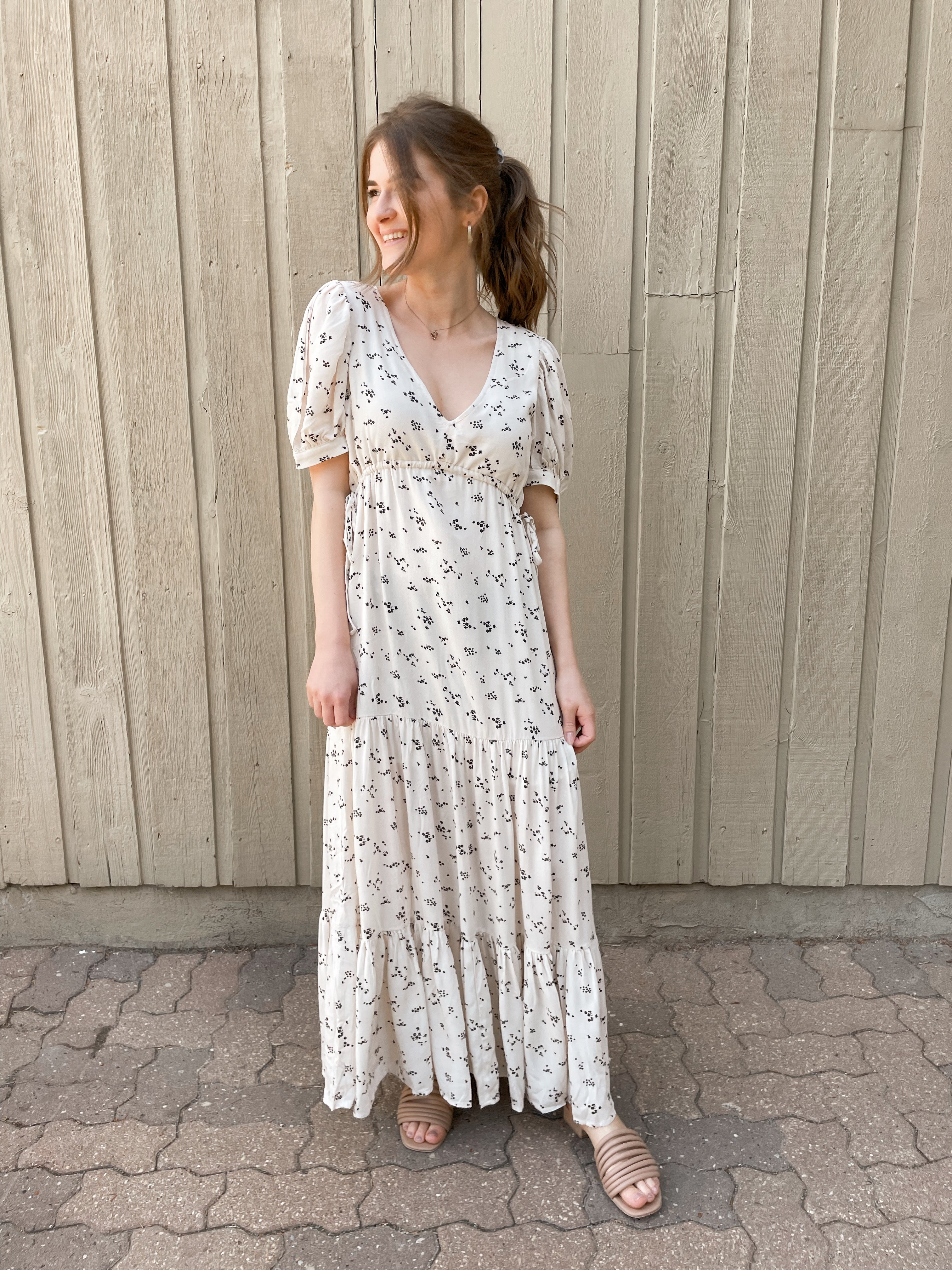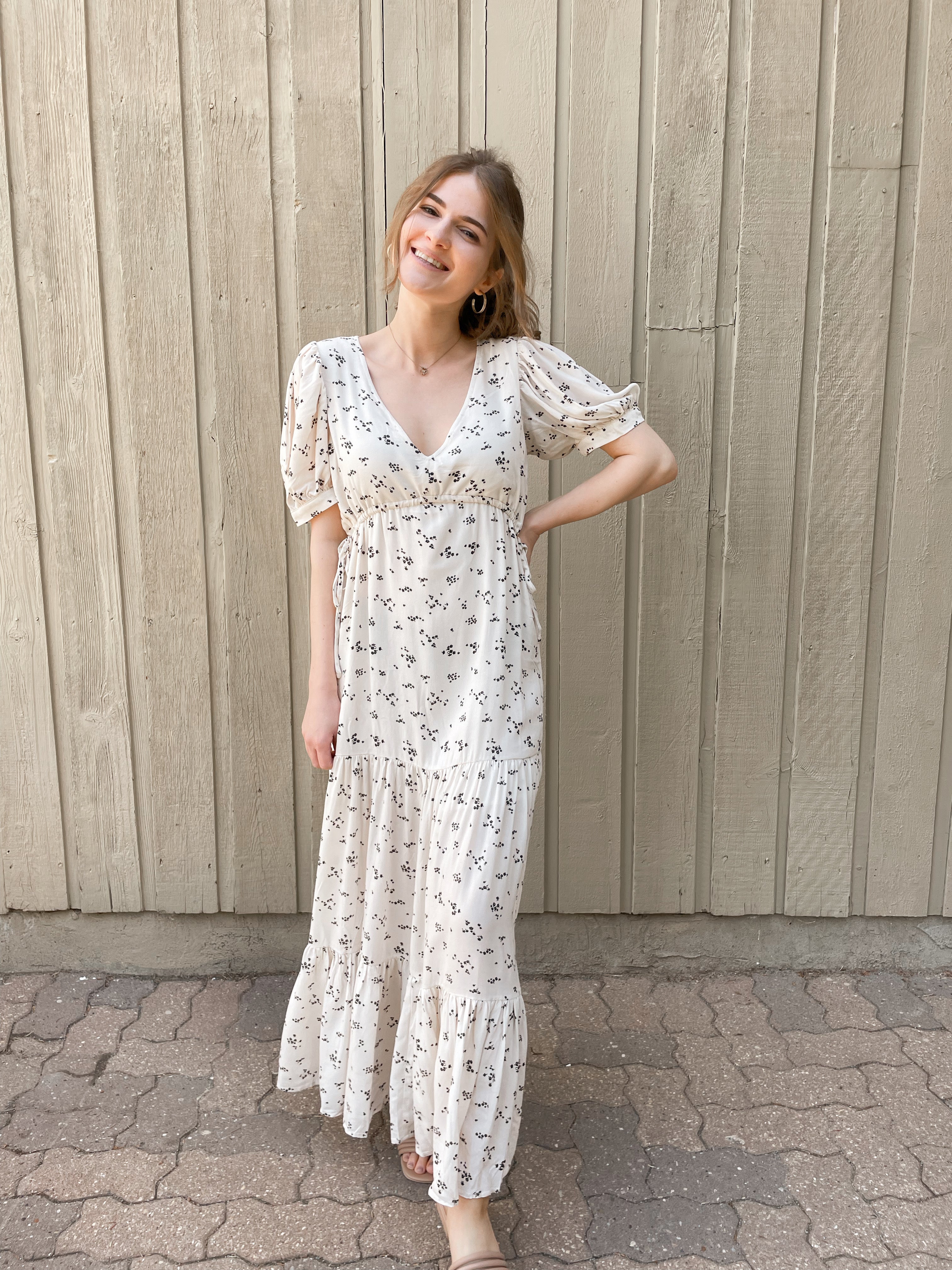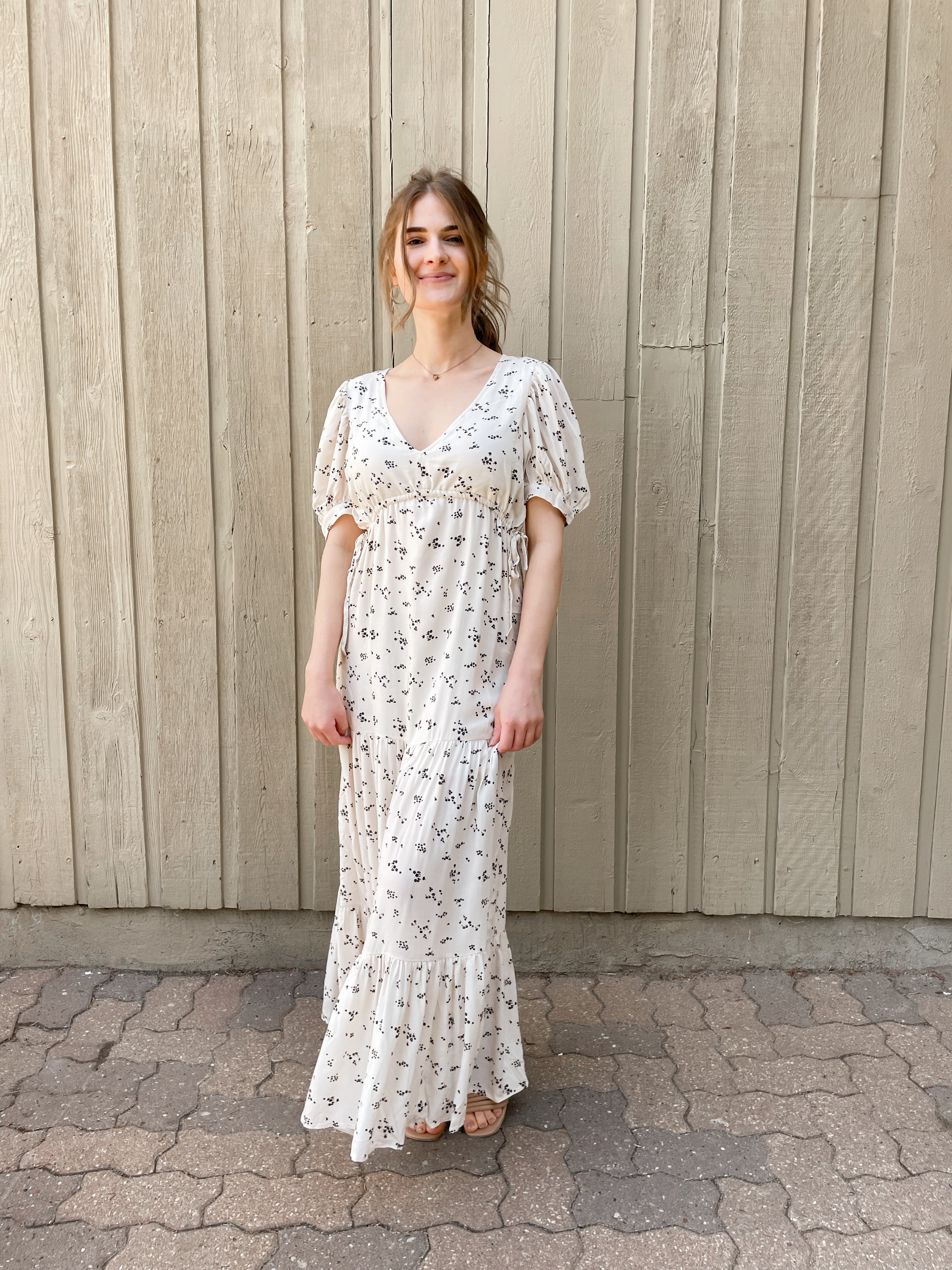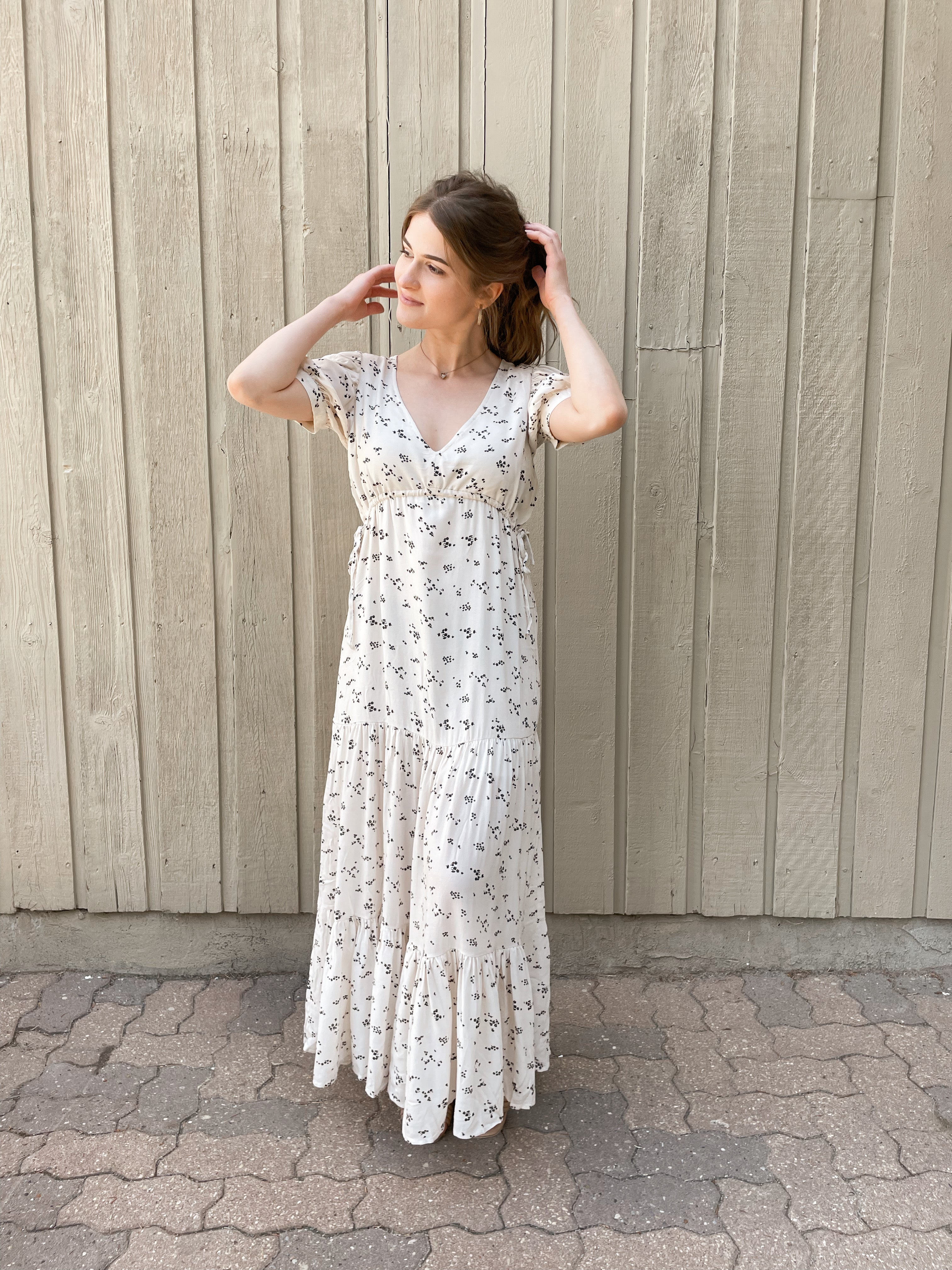 Imported, 100% Recycled Viscose fabric makes up our Leora Short Sleeve Maxi Dress. The lengthy piece features three layers of light ruching, along with tie accents on the front corners of the chest. Pair with strappy sandals for an easy, breezy springtime aesthetic. The scattered floral prints pop on top of the dress' off-white vanilla base!
