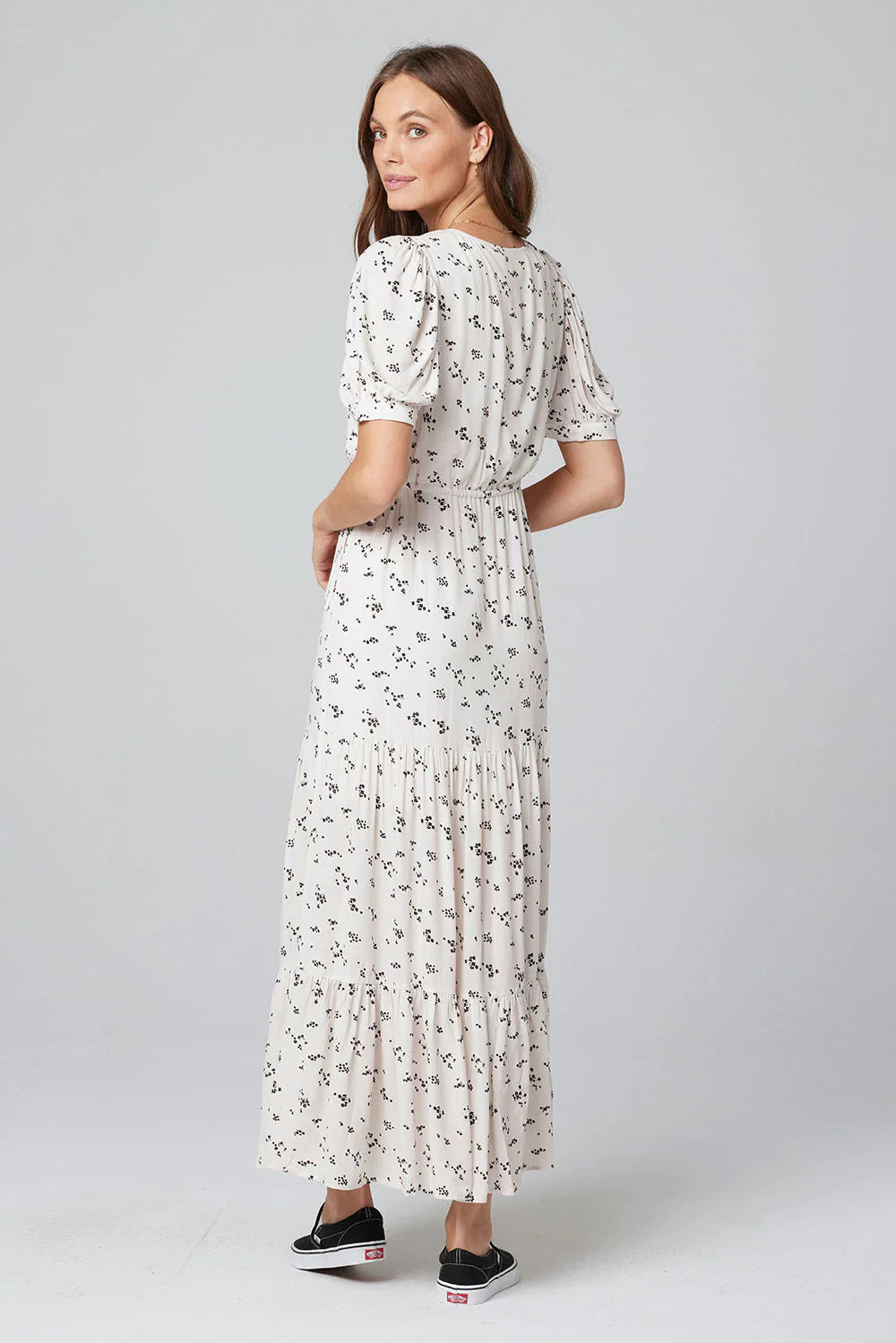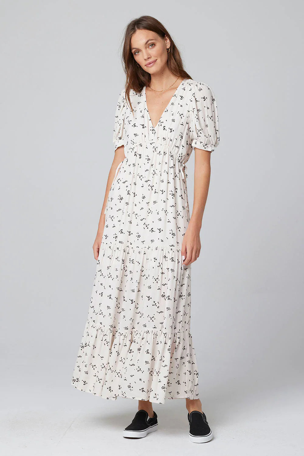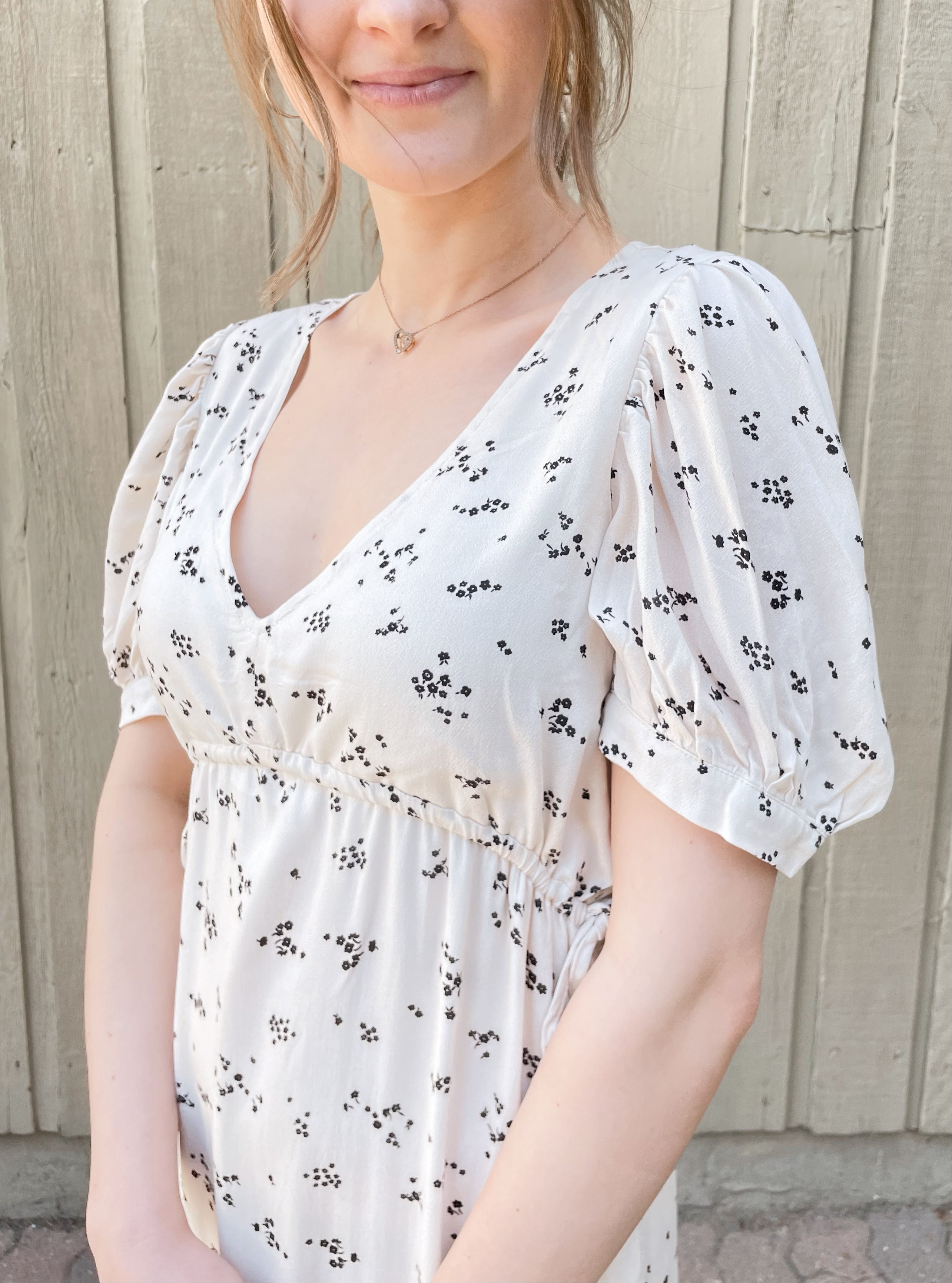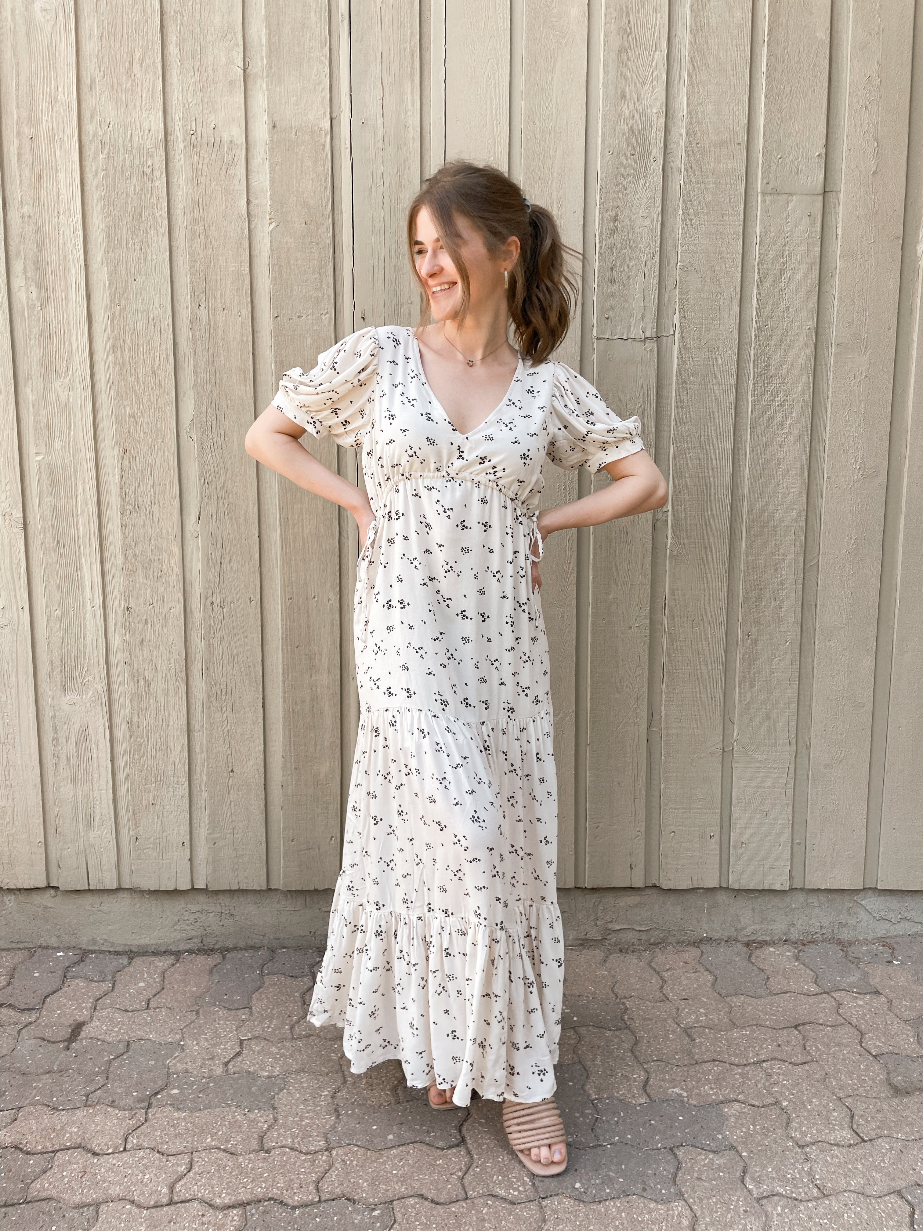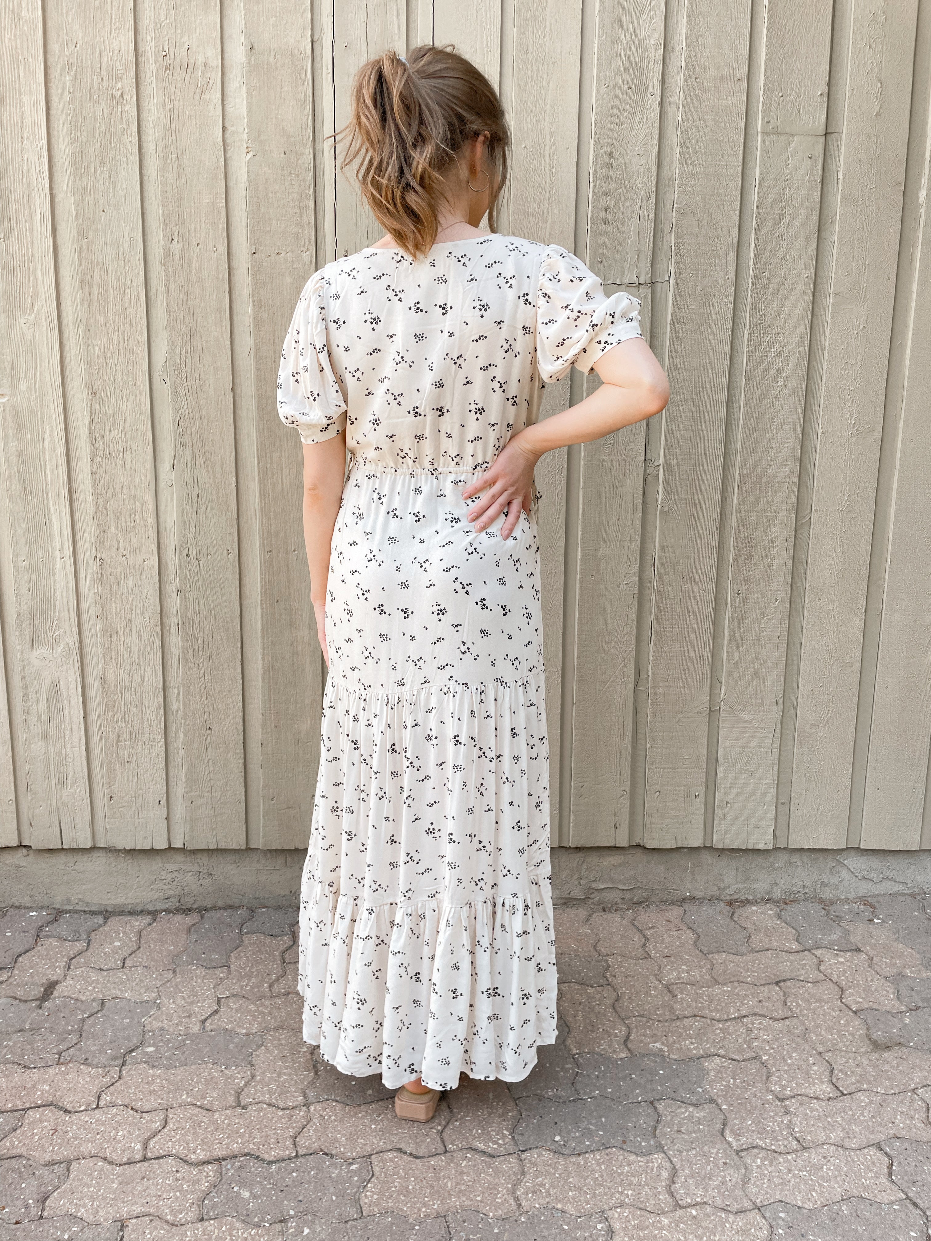Imported, 100% Recycled Viscose fabric makes up our Leora Short Sleeve Maxi Dress. The lengthy piece features three layers of light ruching, along with tie accents on the front corners of the chest. Pair with strappy sandals for an easy, breezy springtime aesthetic. The scattered floral prints pop on top of the dress' off-white vanilla base!