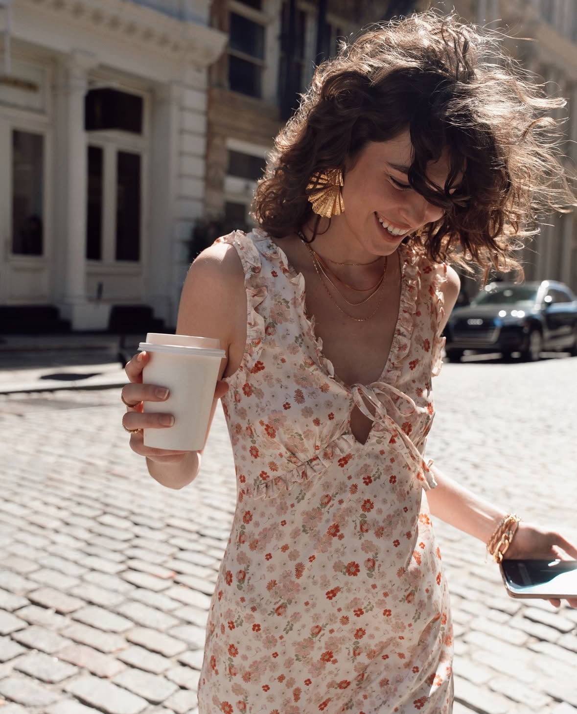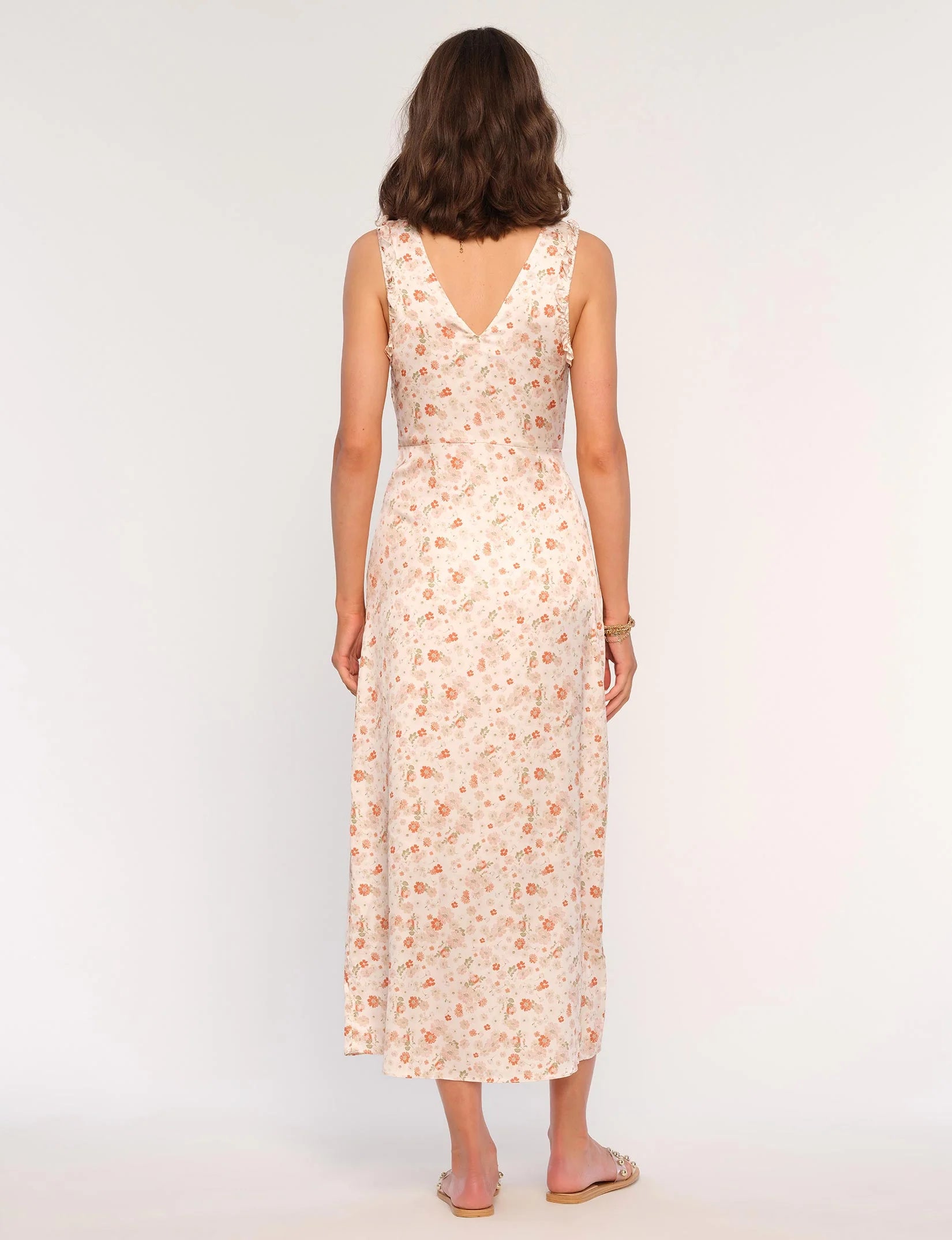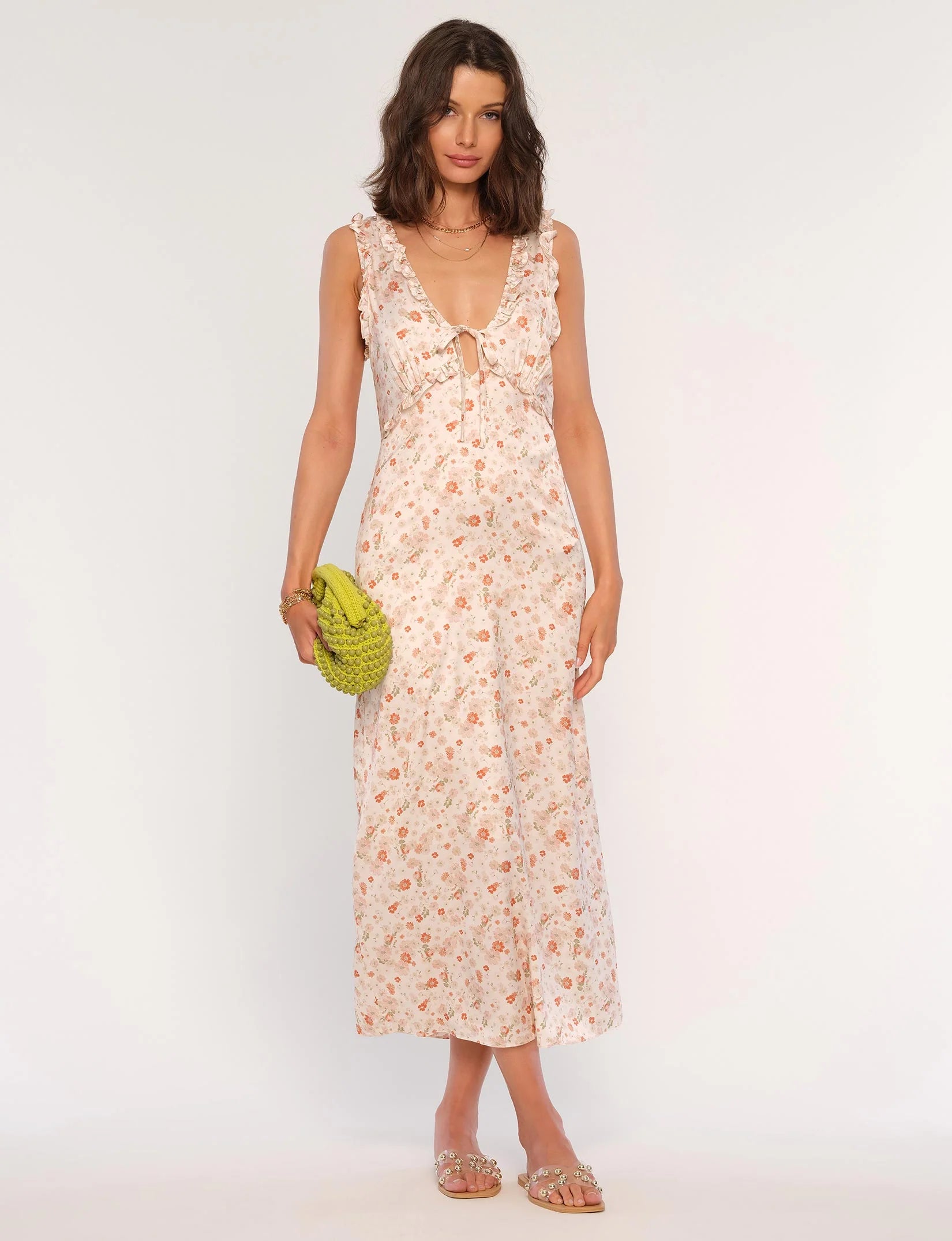 The Marli Dress is cut from our printed crepe de chine. It's sexy yet subtle. It features delicate self ruffles around the neck, armhole and waist with a self tie at centre front. Pair it with a cardigan and slides for a casual day look.