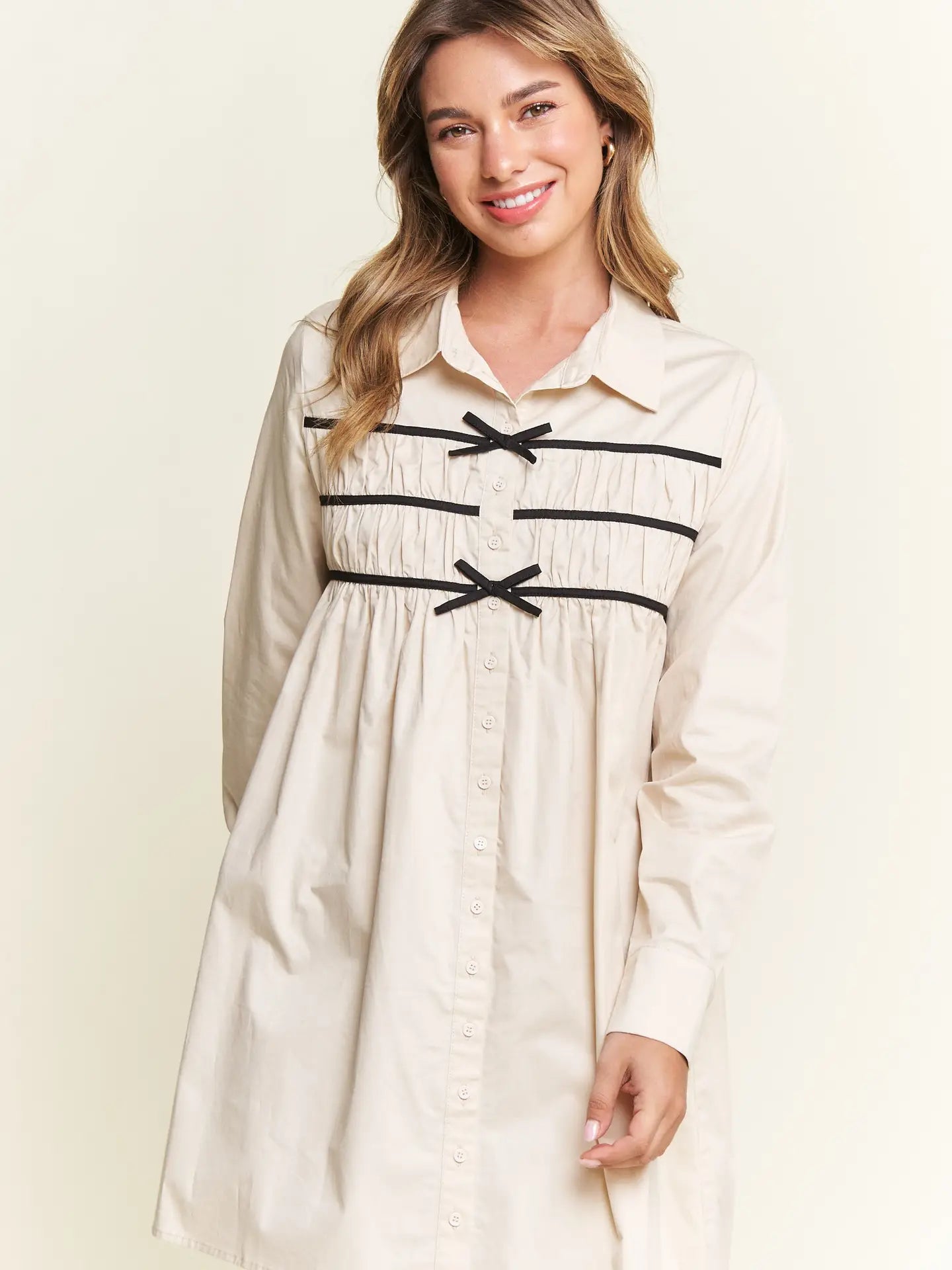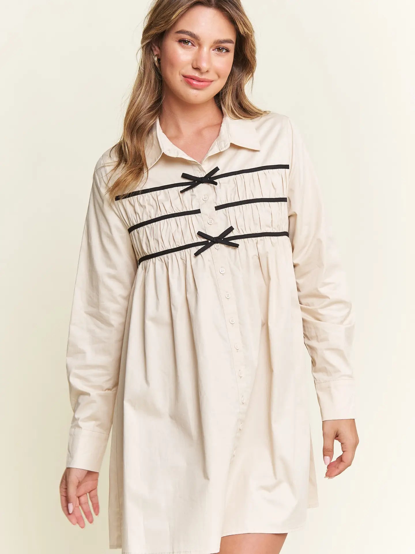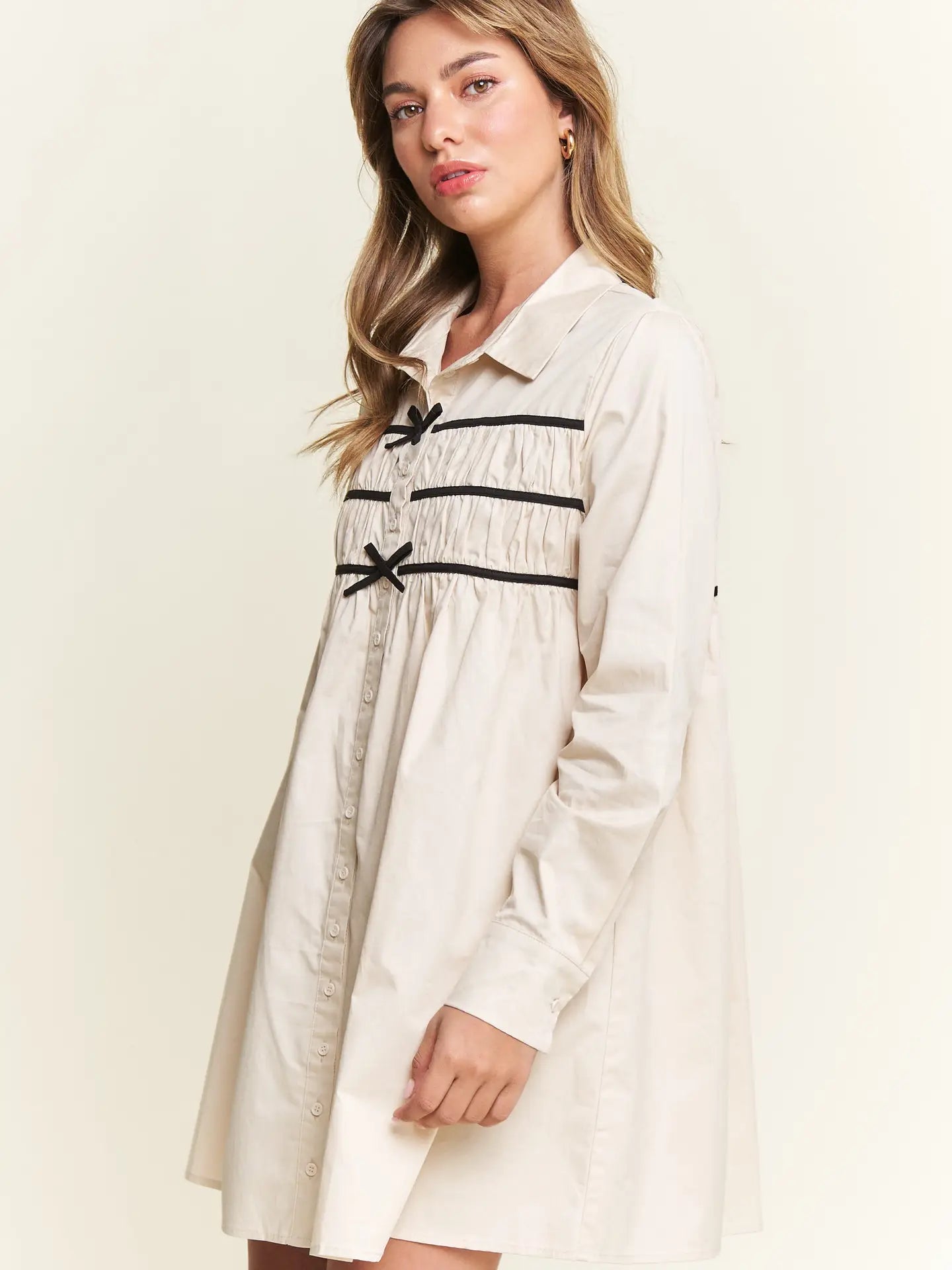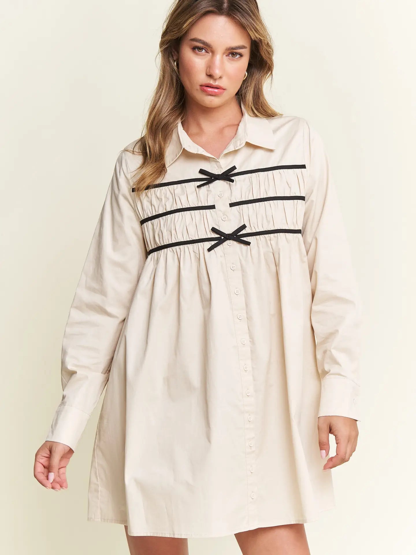 Effortlessly chic with a touch of charm, The Milah Contrast Bow Mini Shirtdress brings a fresh twist to a timeless classic. This ivory button-up style features a crisp collar, long sleeves, and feminine gathering across the chest, accented by delicate black contrast bows. Tailored through the shoulders and softly flared through the skirt, it offers a flattering mini-length silhouette with undeniable French-girl appeal.