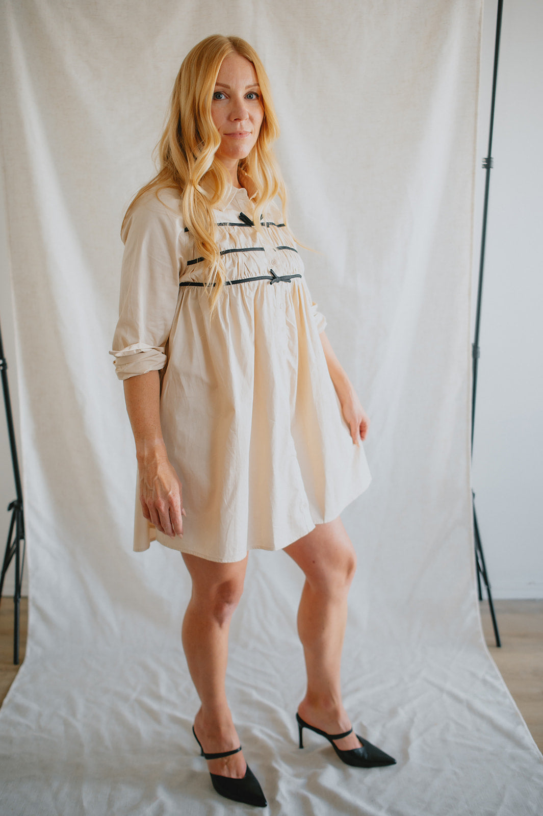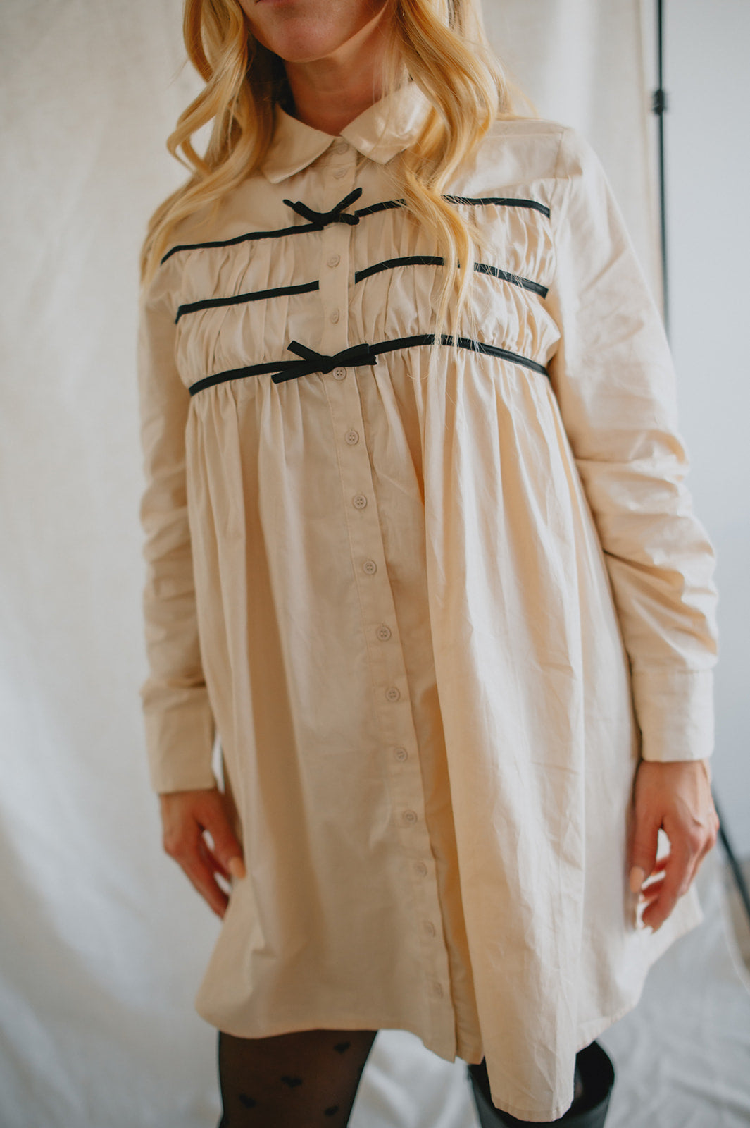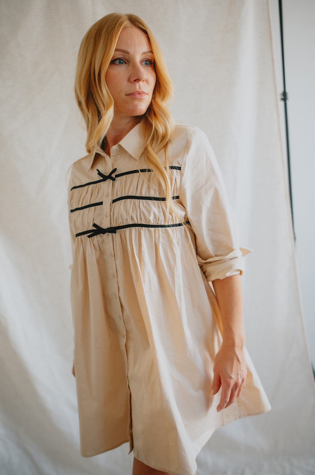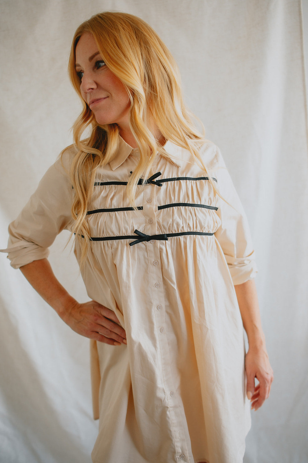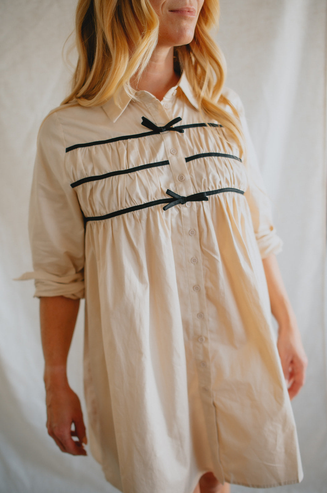 Effortlessly chic with a touch of charm, The Milah Contrast Bow Mini Shirtdress brings a fresh twist to a timeless classic. This ivory button-up style features a crisp collar, long sleeves, and feminine gathering across the chest, accented by delicate black contrast bows. Tailored through the shoulders and softly flared through the skirt, it offers a flattering mini-length silhouette with undeniable French-girl appeal.