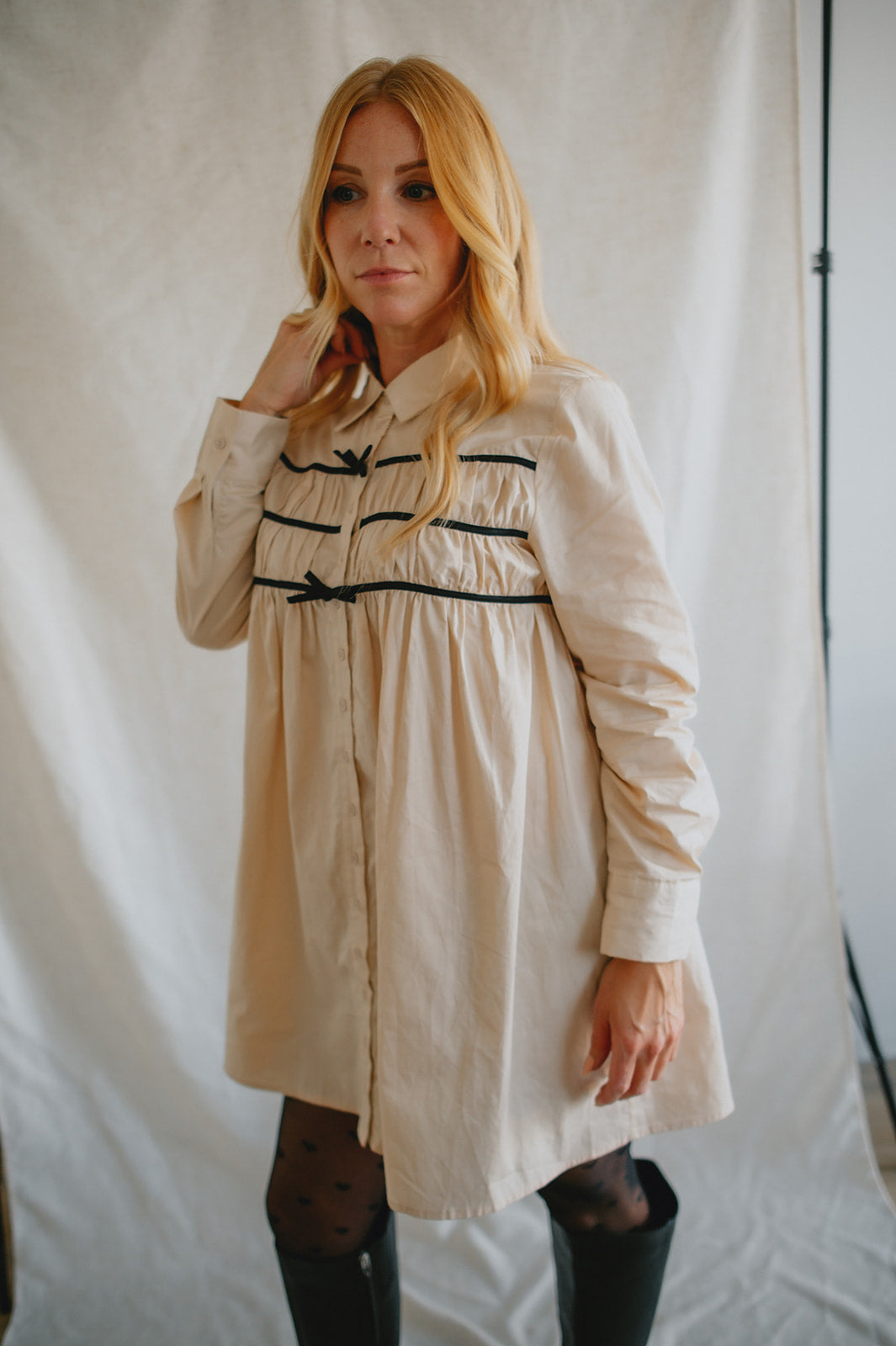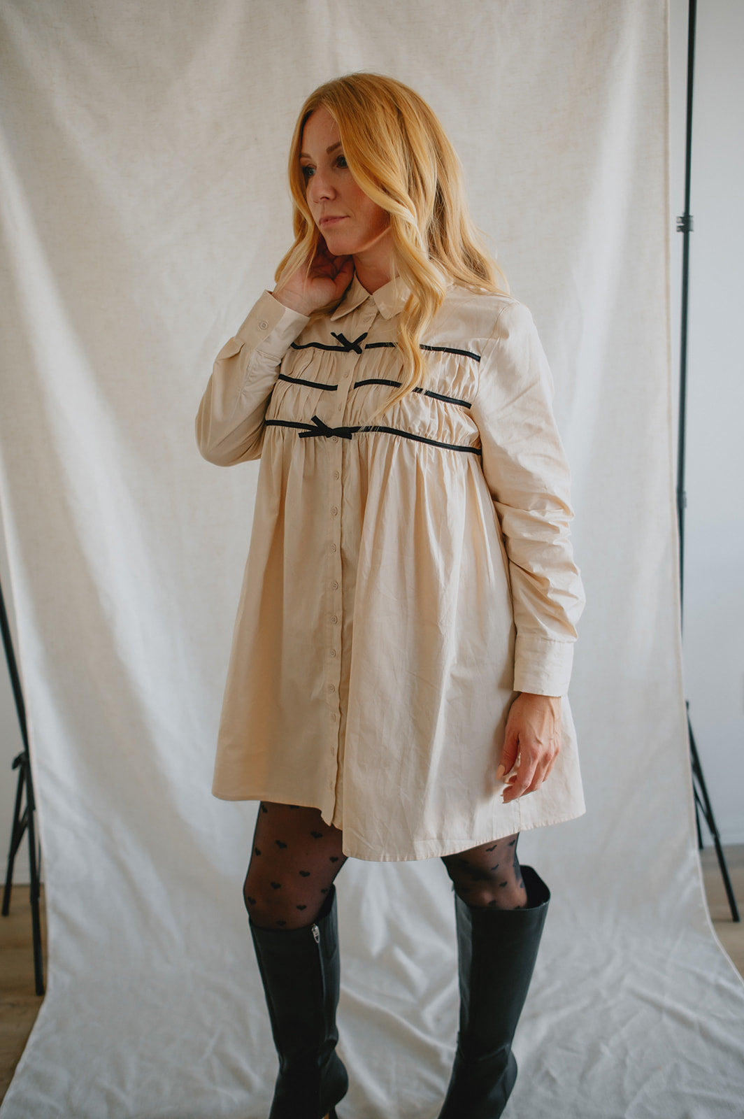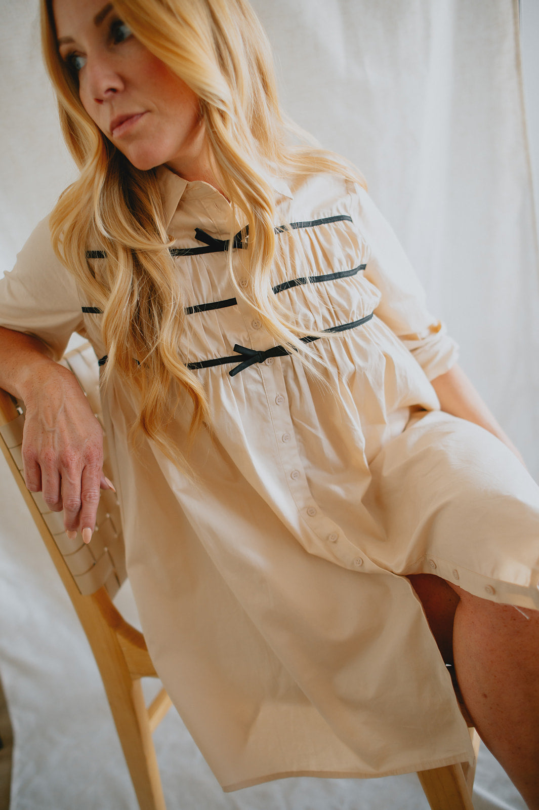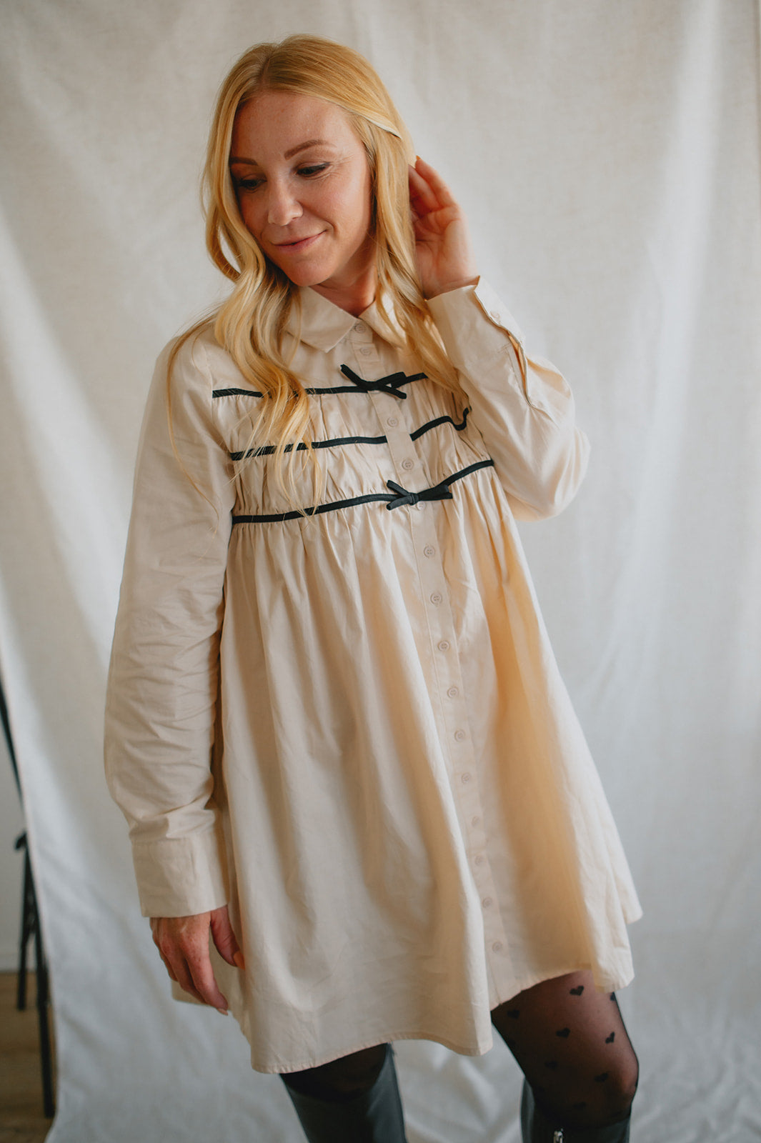 Effortlessly chic with a touch of charm, The Milah Contrast Bow Mini Shirtdress brings a fresh twist to a timeless classic. This ivory button-up style features a crisp collar, long sleeves, and feminine gathering across the chest, accented by delicate black contrast bows. Tailored through the shoulders and softly flared through the skirt, it offers a flattering mini-length silhouette with undeniable French-girl appeal.