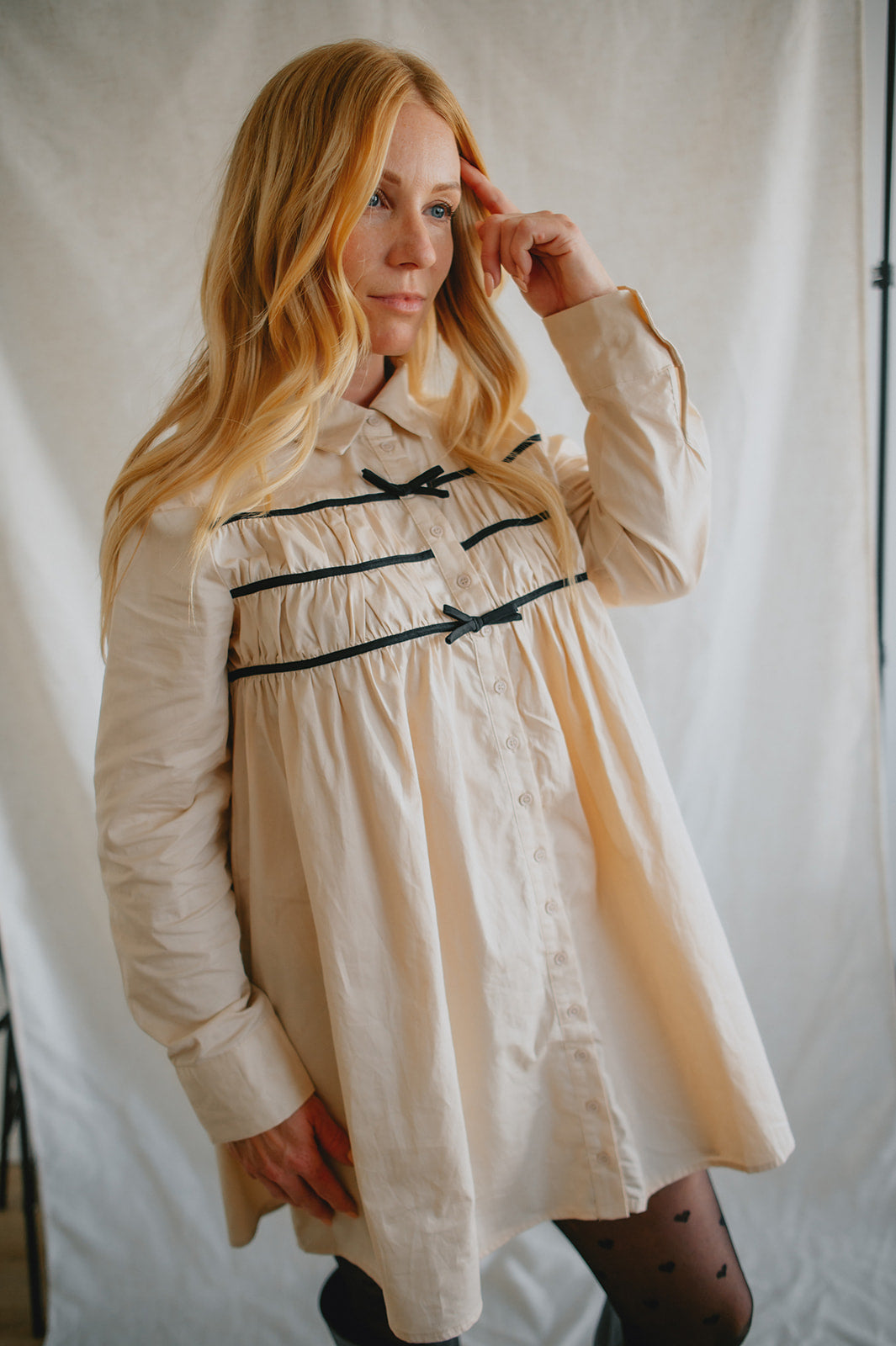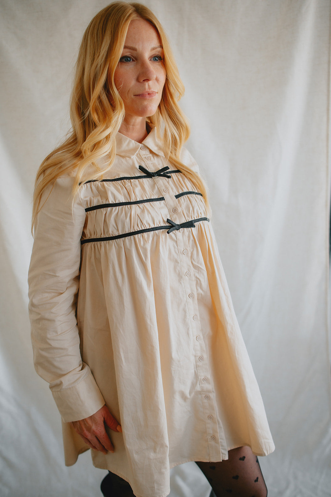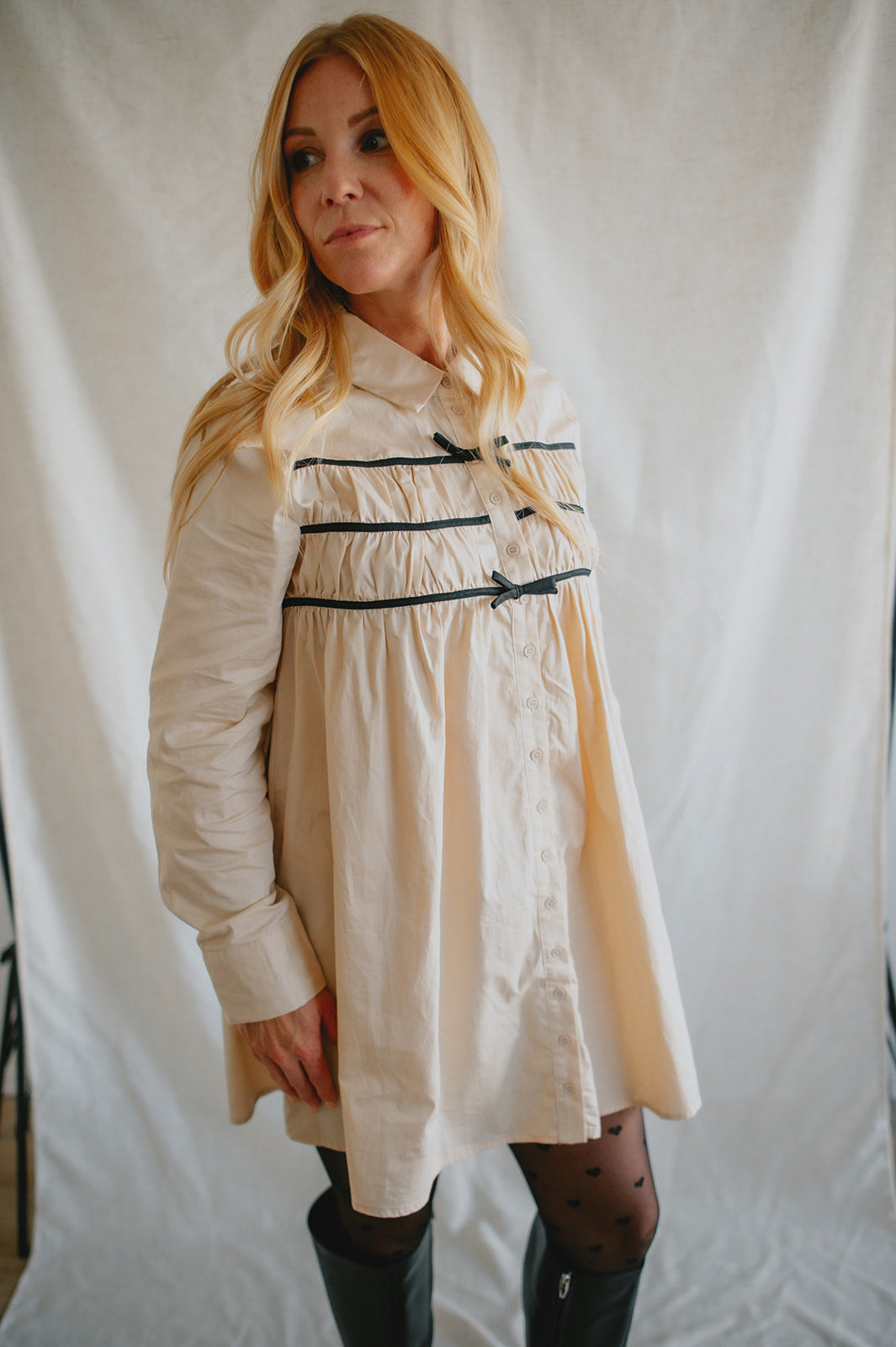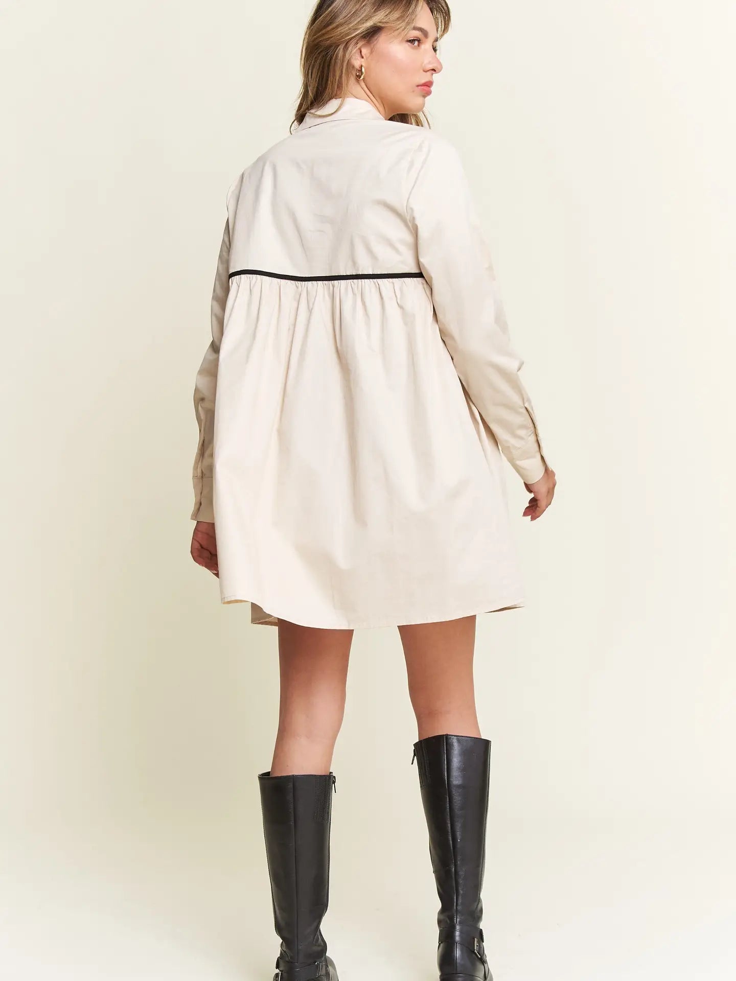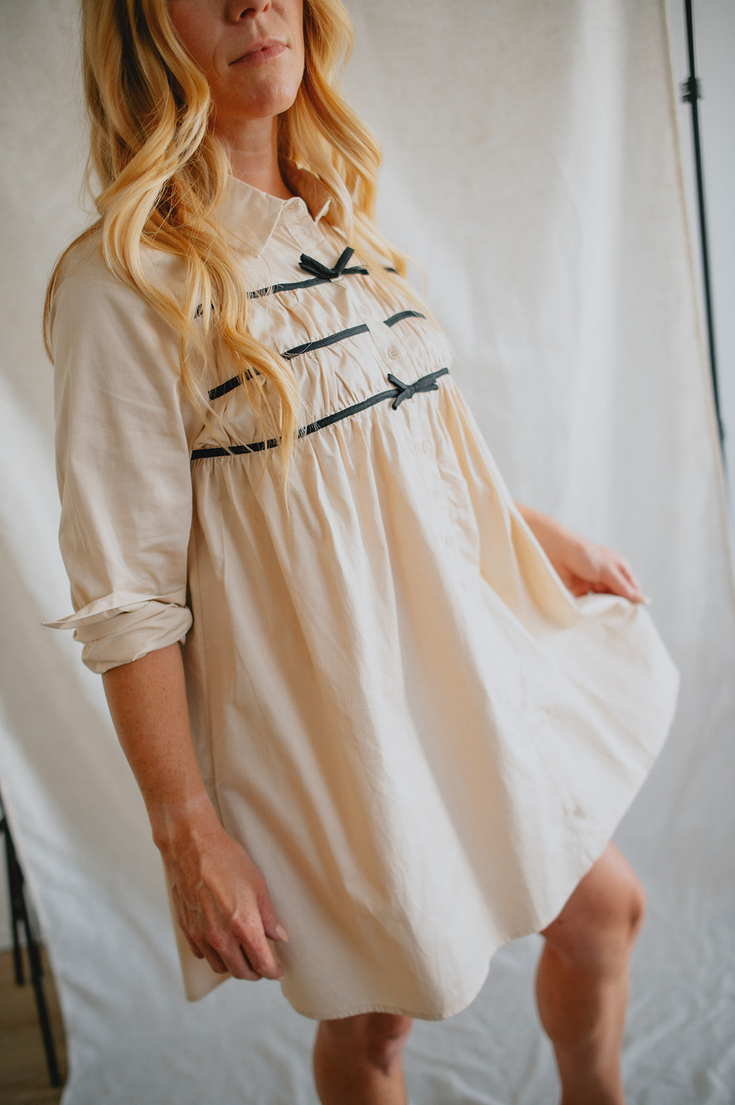 Effortlessly chic with a touch of charm, The Milah Contrast Bow Mini Shirtdress brings a fresh twist to a timeless classic. This ivory button-up style features a crisp collar, long sleeves, and feminine gathering across the chest, accented by delicate black contrast bows. Tailored through the shoulders and softly flared through the skirt, it offers a flattering mini-length silhouette with undeniable French-girl appeal.