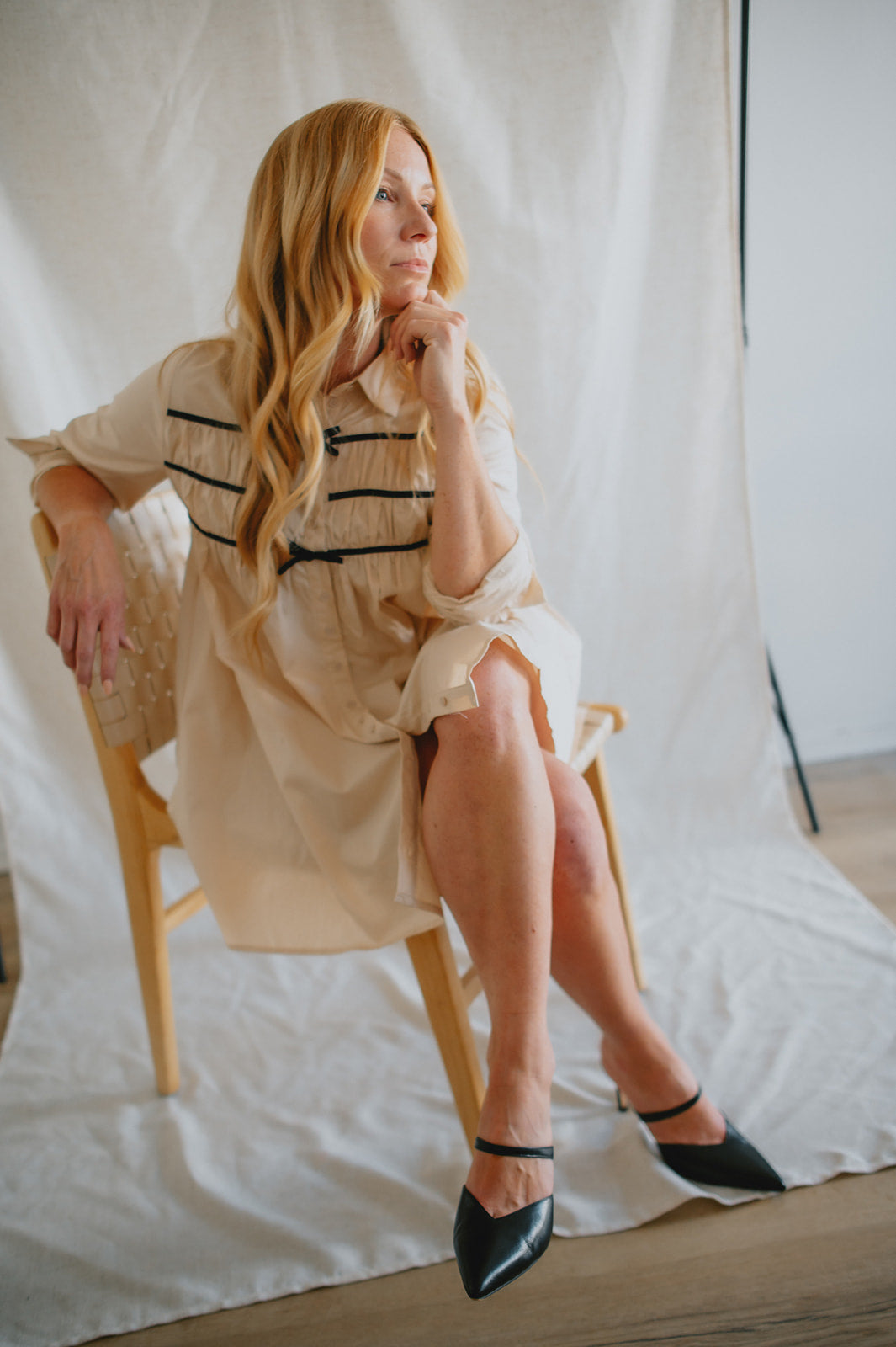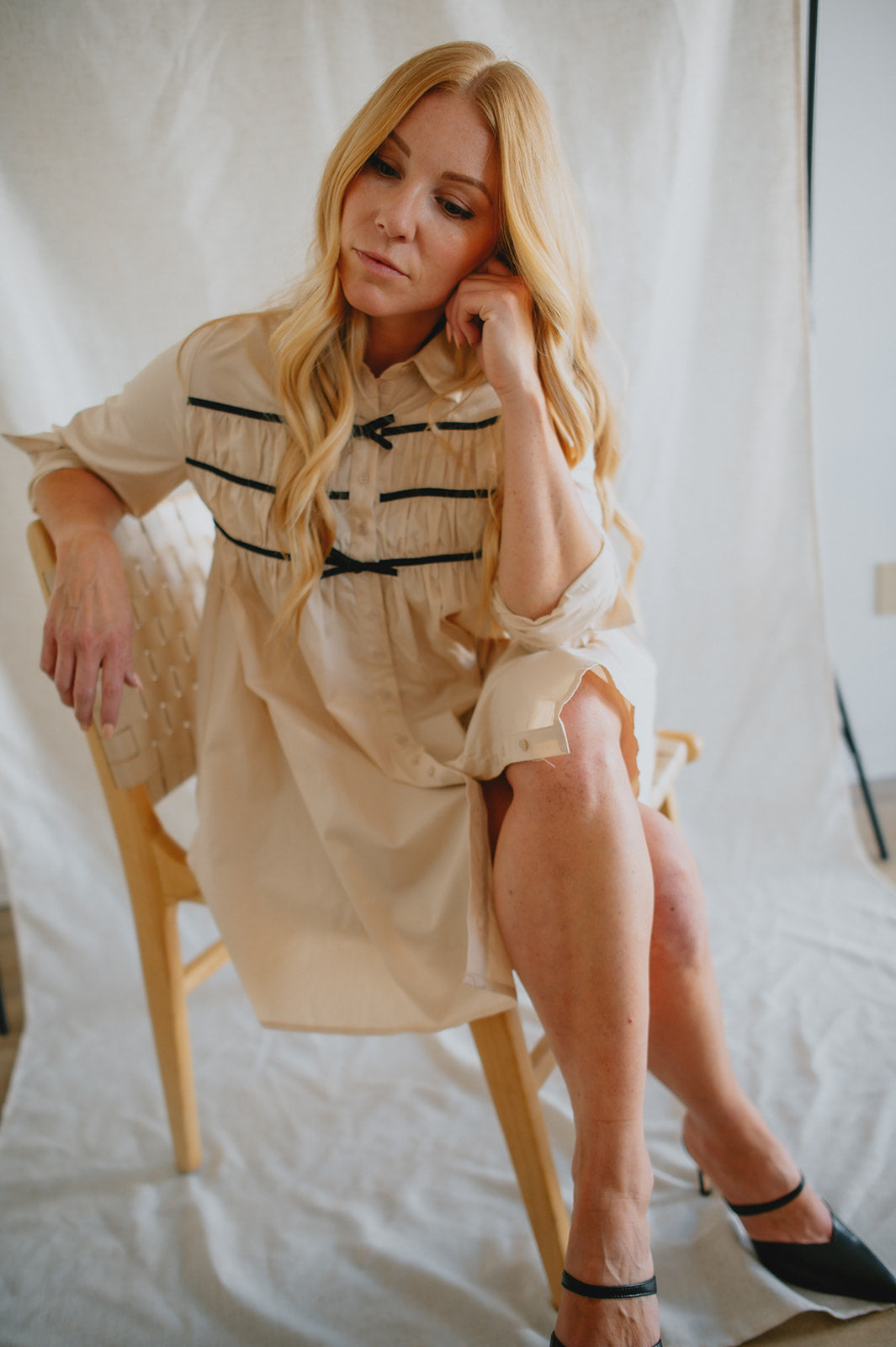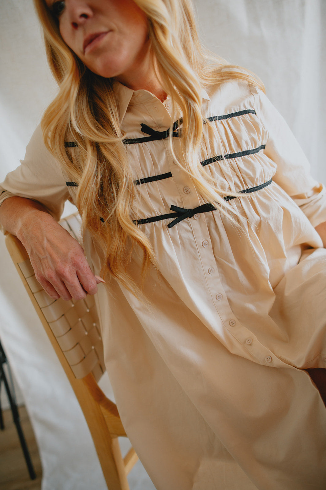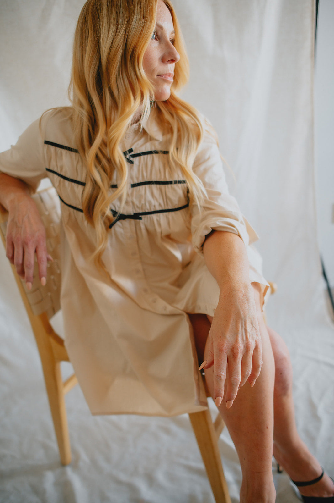 Effortlessly chic with a touch of charm, The Milah Contrast Bow Mini Shirtdress brings a fresh twist to a timeless classic. This ivory button-up style features a crisp collar, long sleeves, and feminine gathering across the chest, accented by delicate black contrast bows. Tailored through the shoulders and softly flared through the skirt, it offers a flattering mini-length silhouette with undeniable French-girl appeal.