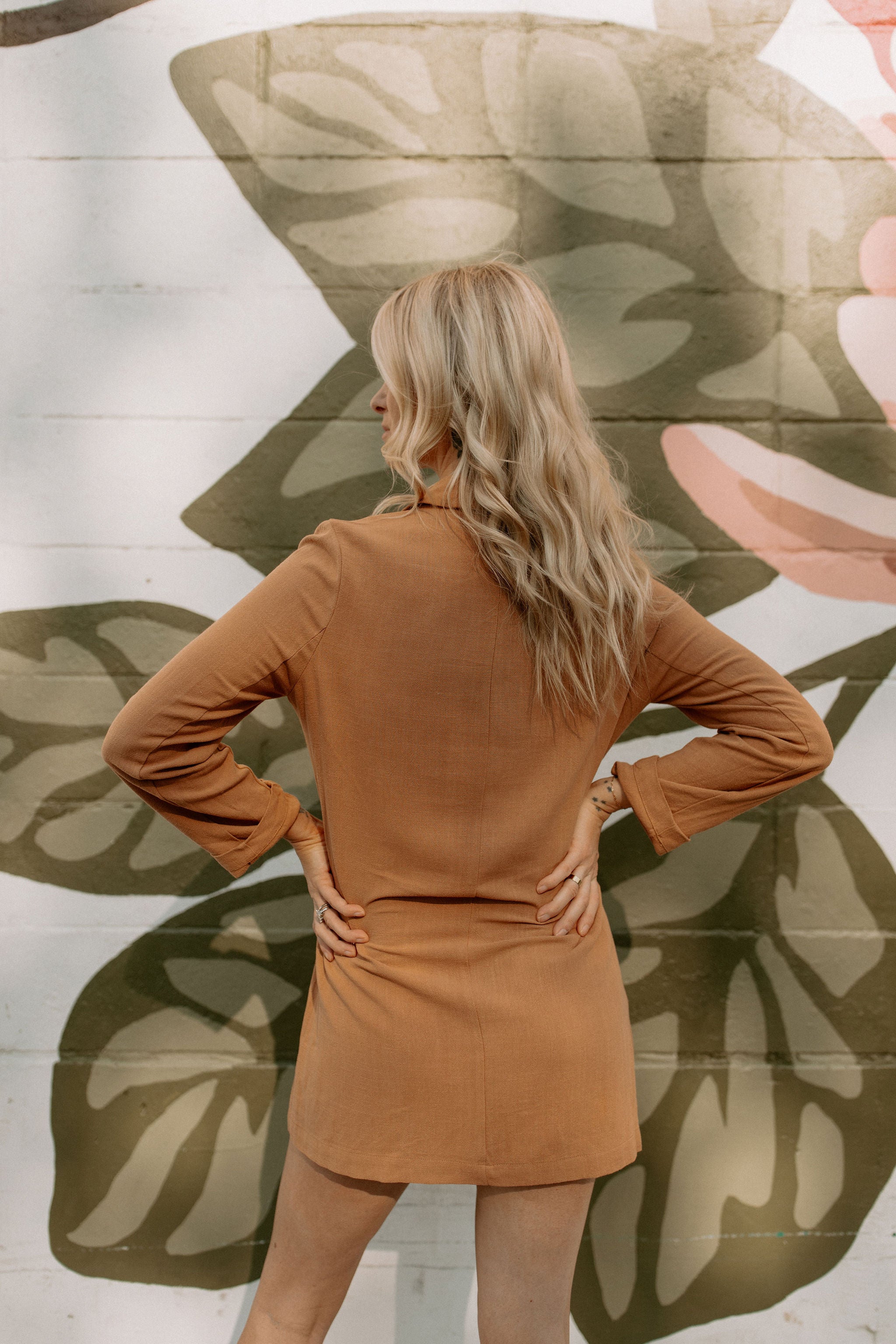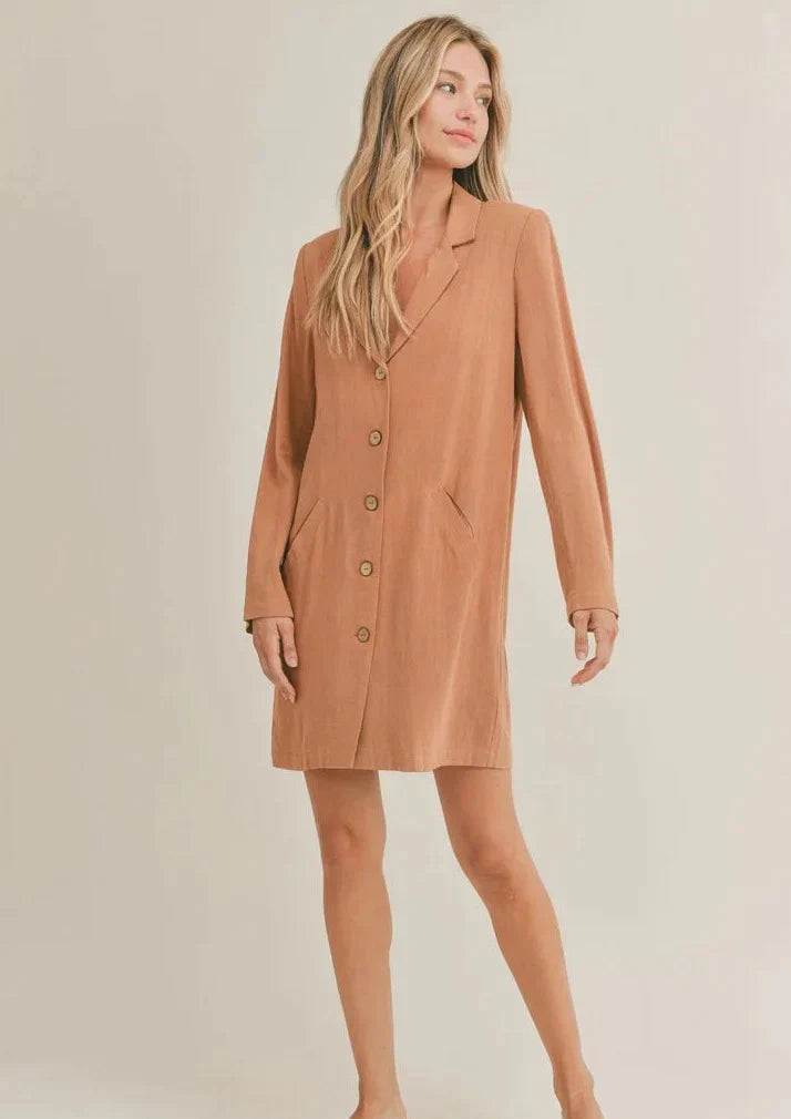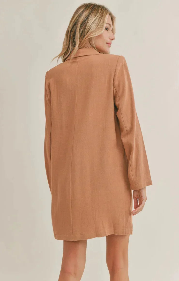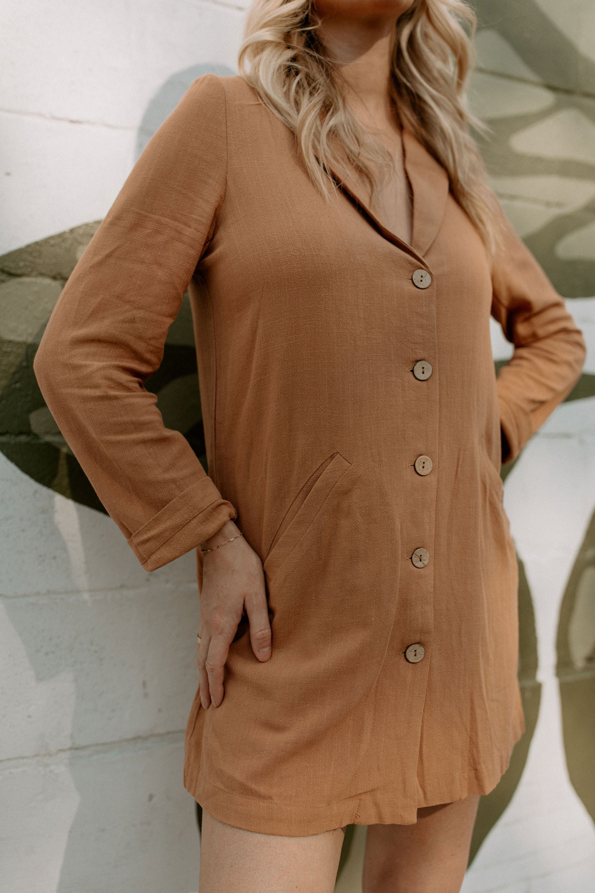 It looks great over a dress and can fancy up any outfit with it's tailored look. We are loving the extra long length, the pockets and this great tan colour.