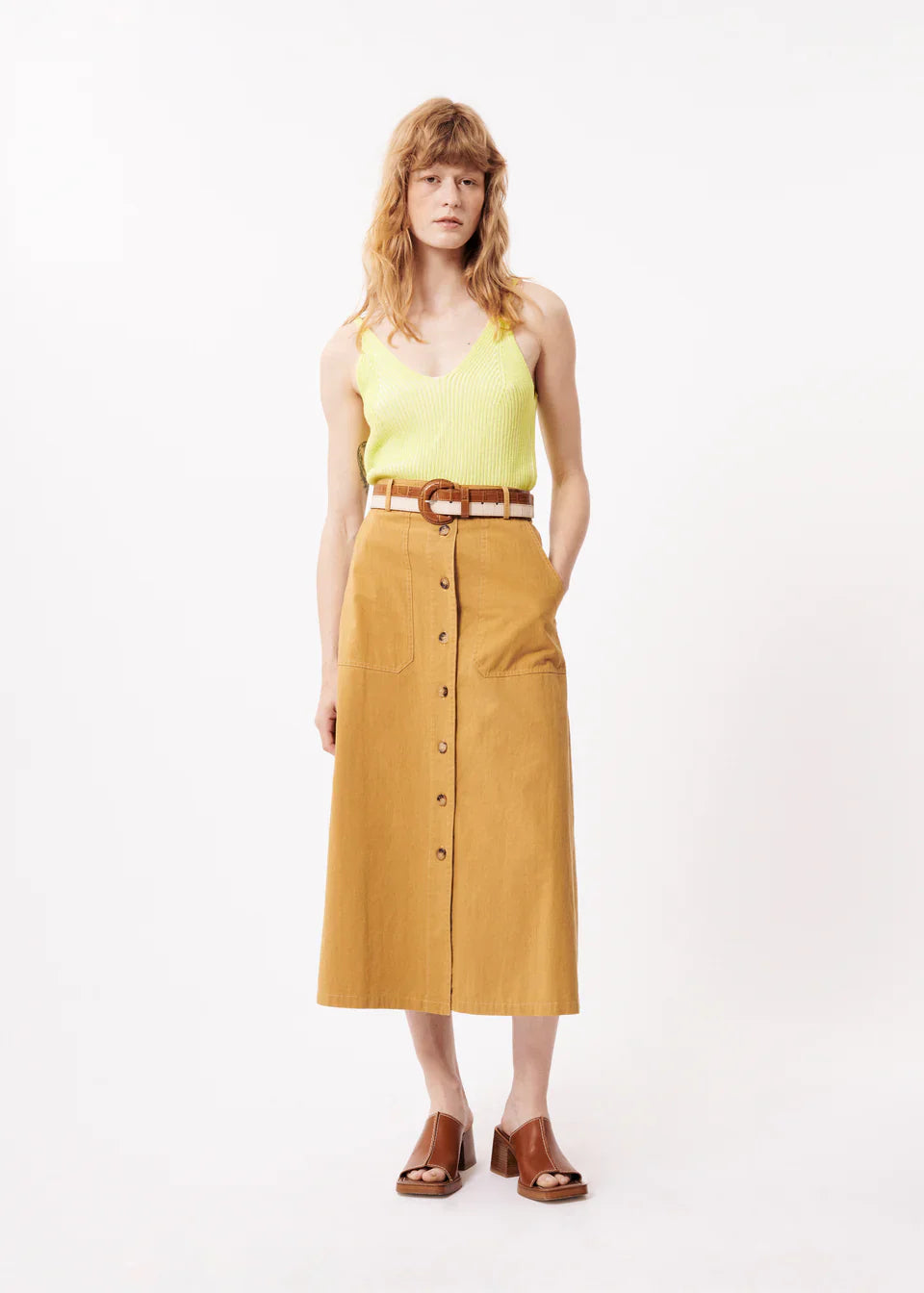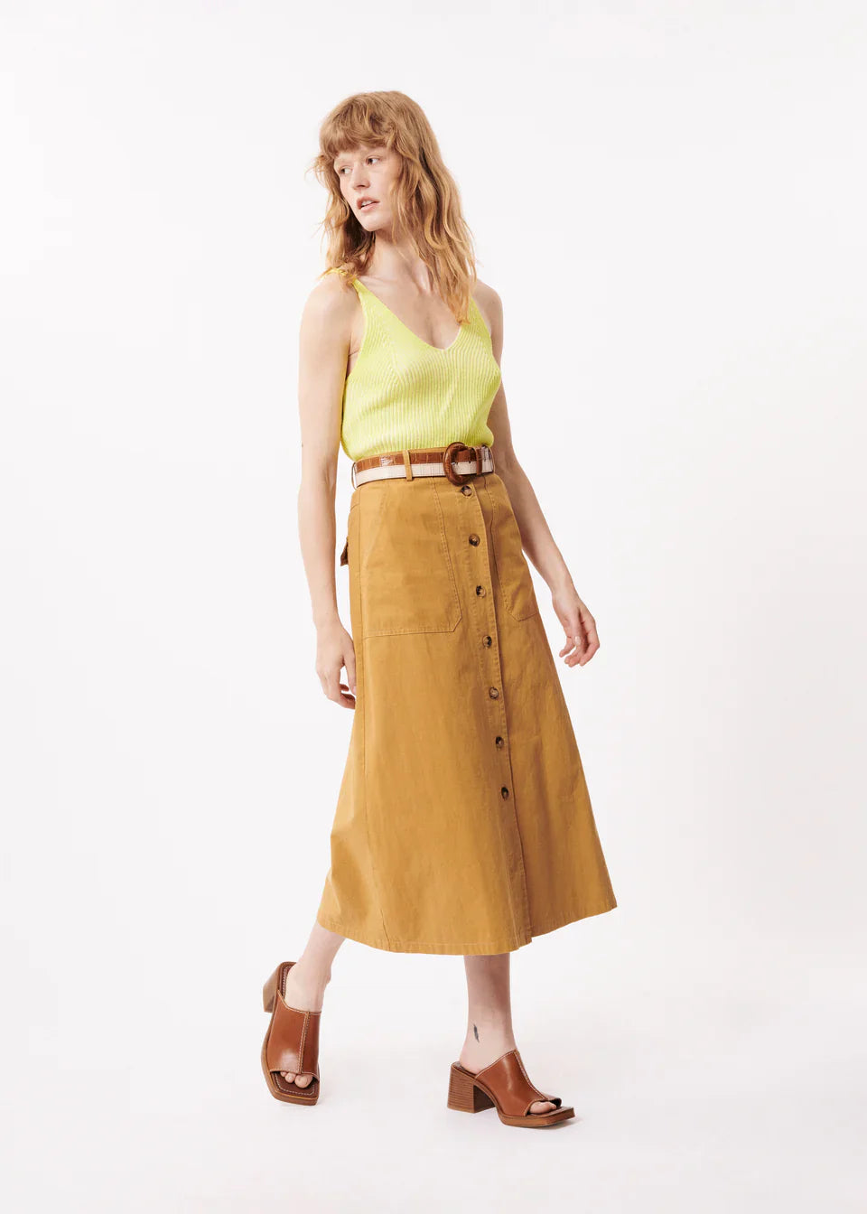 The Pinar Skirt by FRNCH oozes class. A midi length skirt, ideal for any occasion. Dress her up or down, she can do it all. With Exposed pockets and buttons down the front.