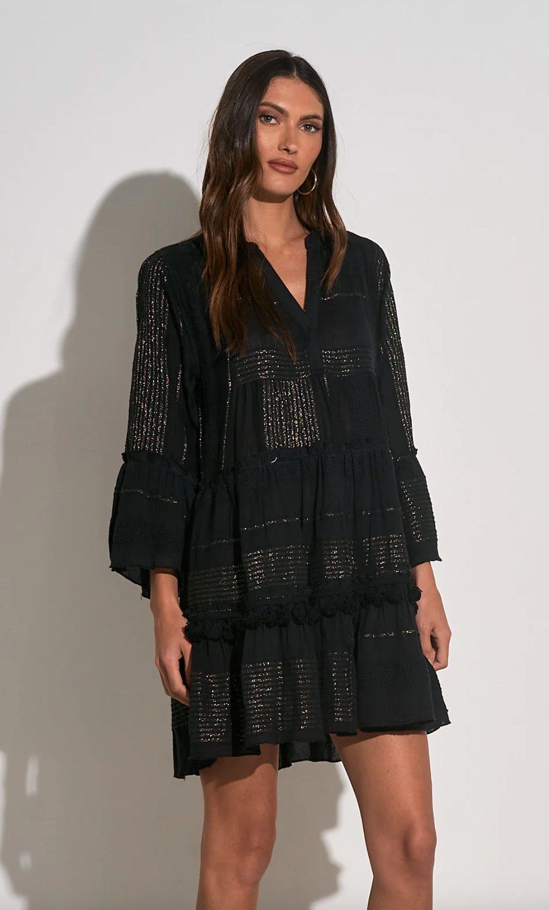 Featuring beauty and movement, the Suave midi dress is a resort romance. Designed with ruffle tiering for dimension, v-neckline and 3/4 airy sleeves for a charming look.