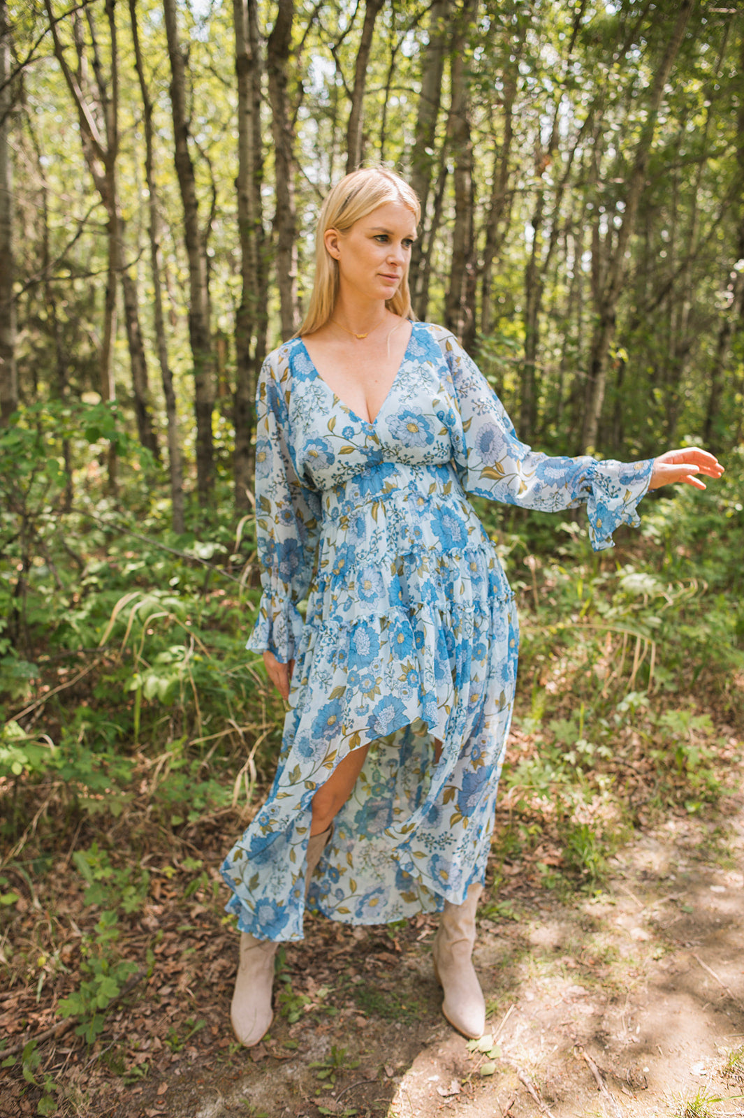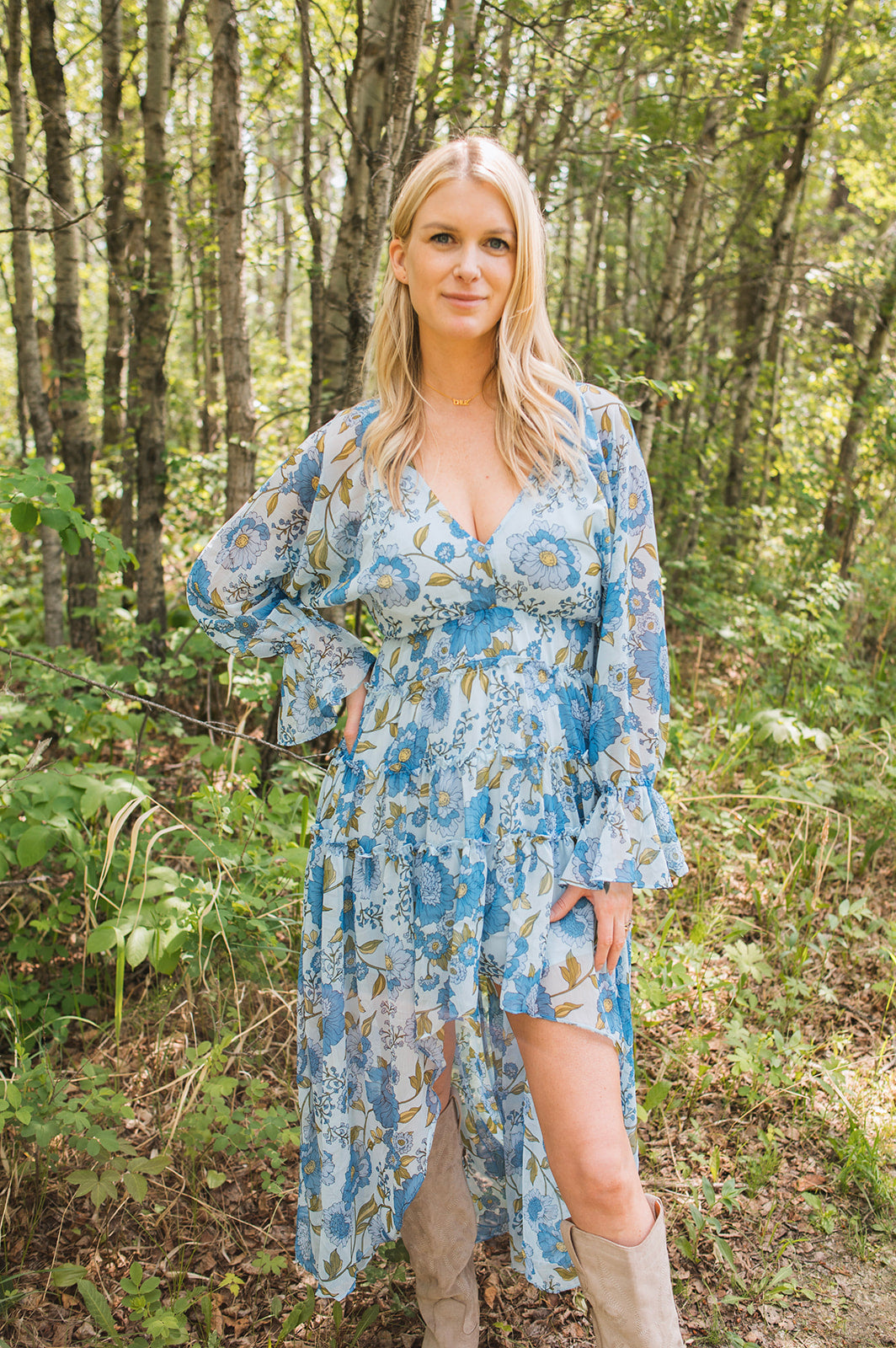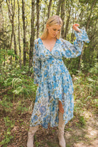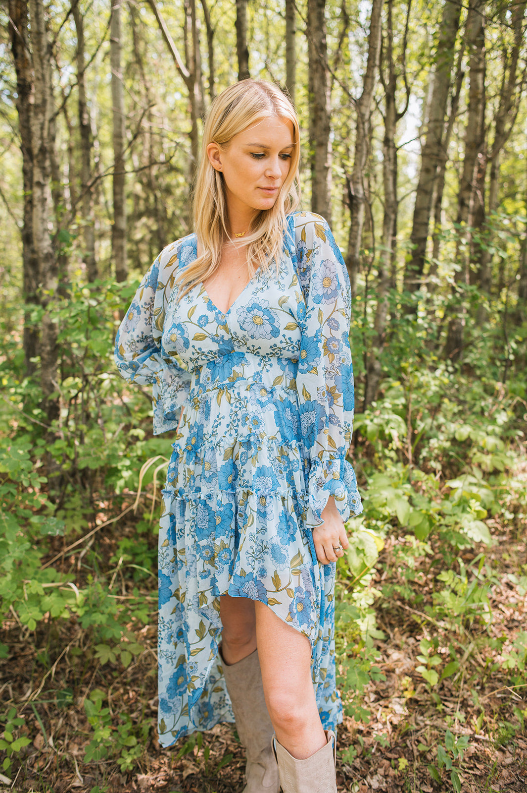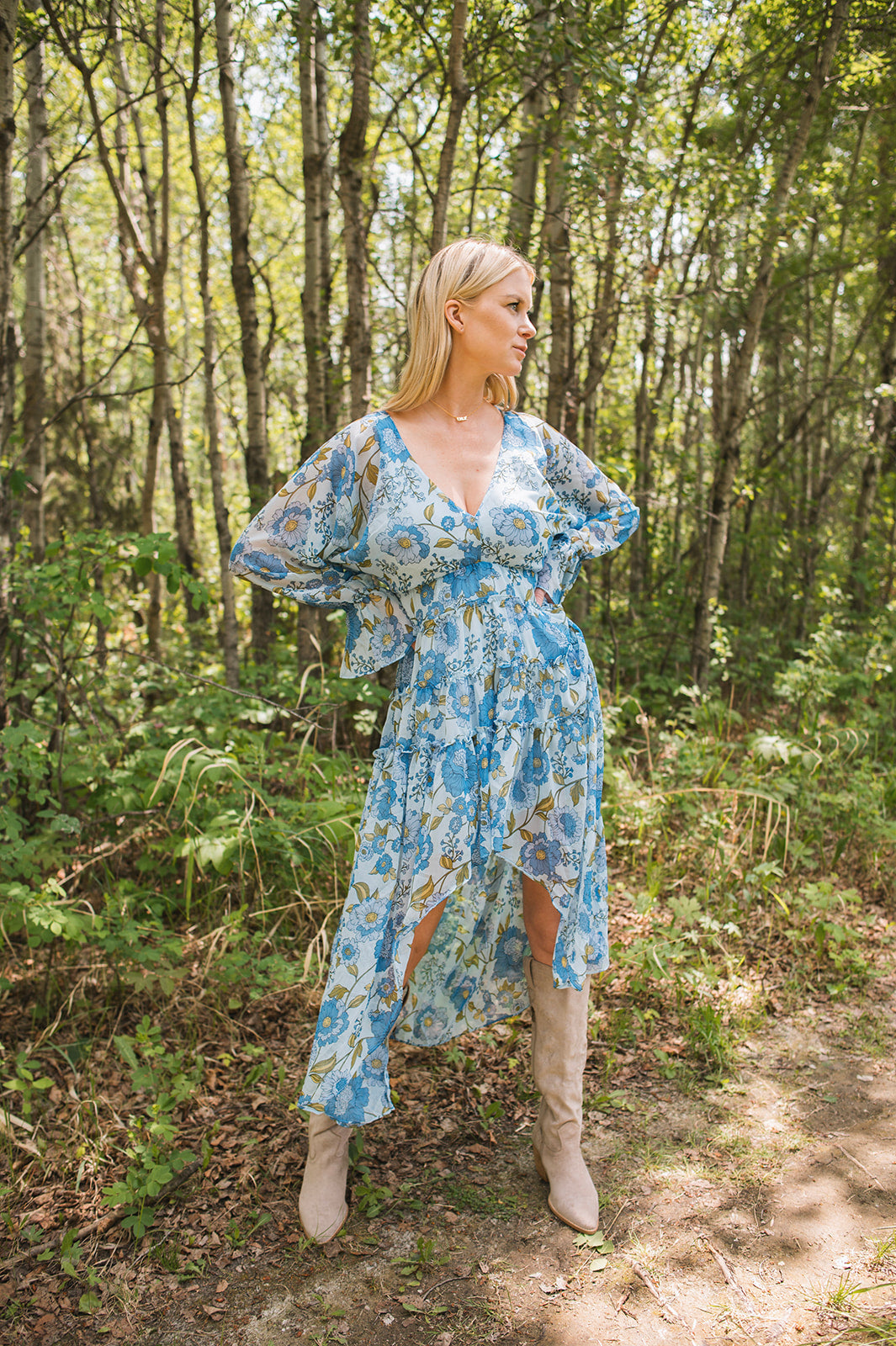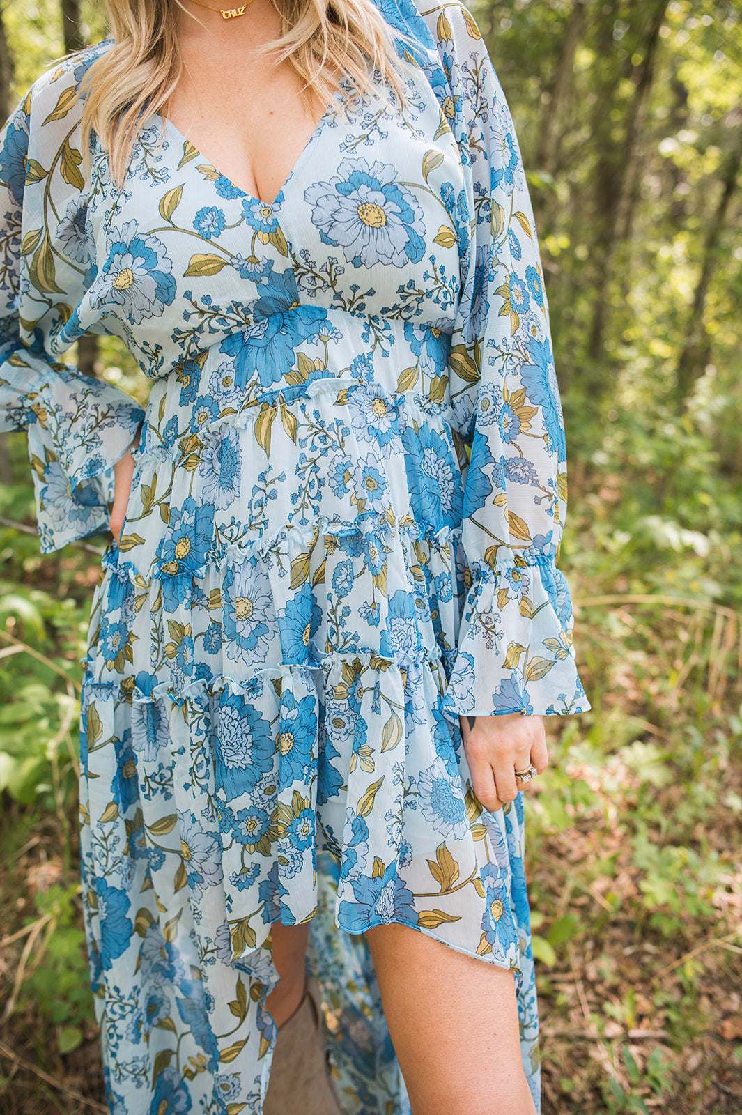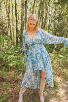 This light weight floral dress is a gorgeous addition to your closet for the warm weather. This dress features a high-low bottom and loose sleeves that cinch in on the wrists along with at the waist. The perfect dress for the warm weather!