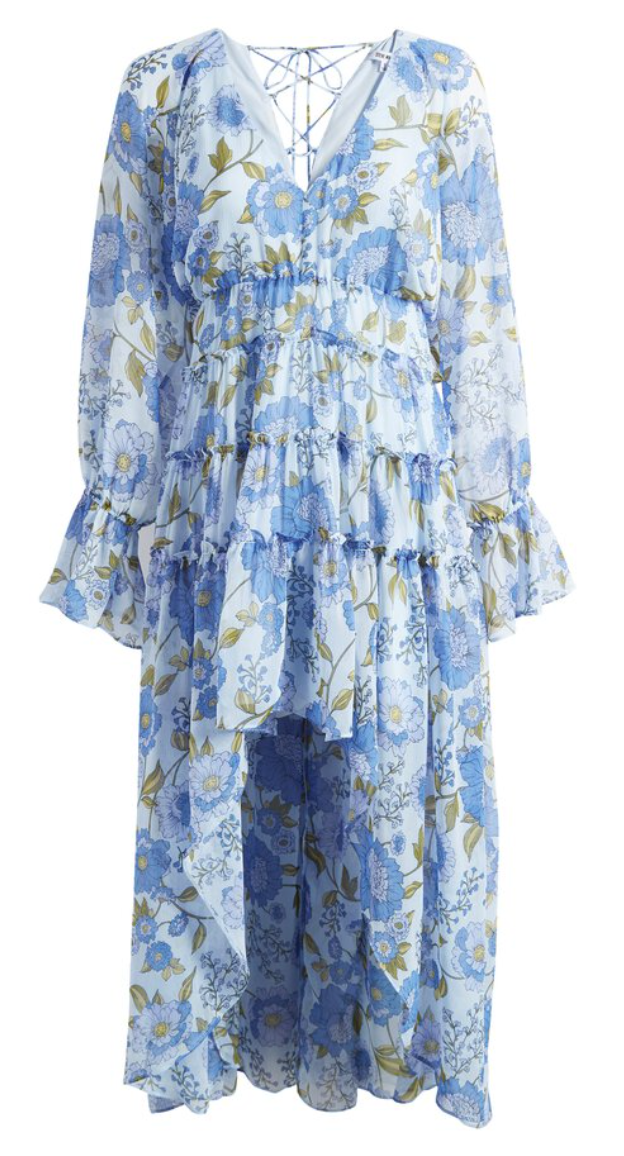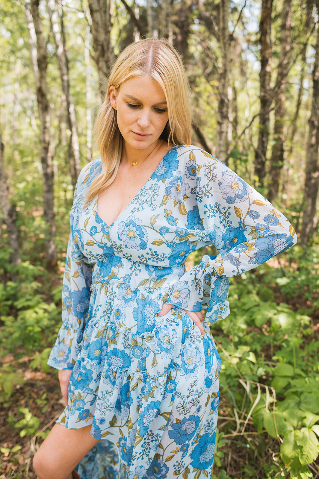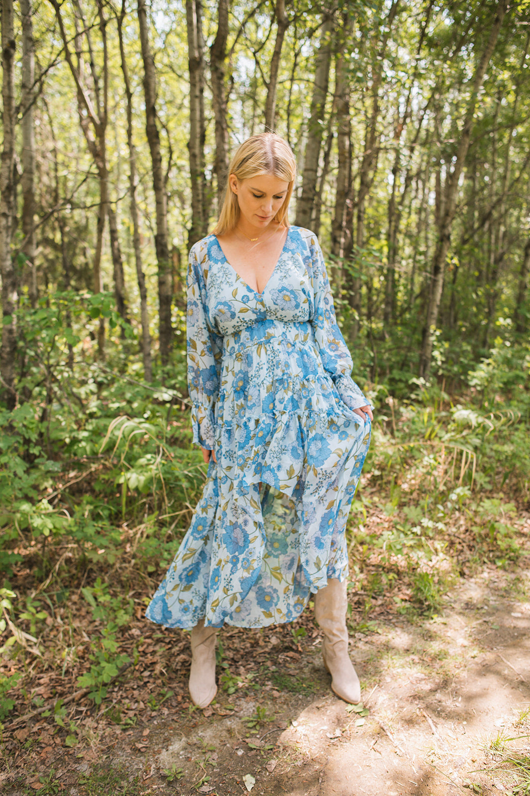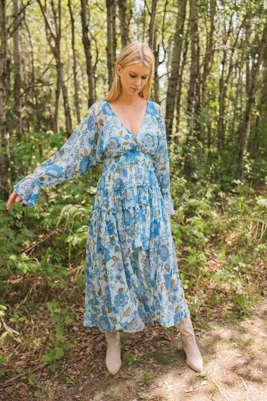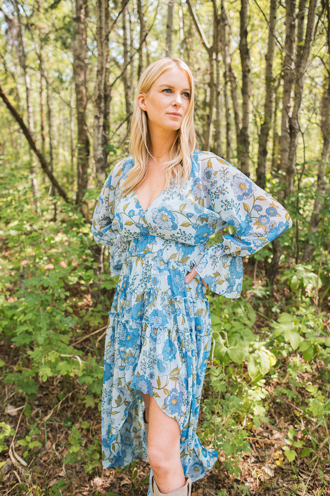 This light weight floral dress is a gorgeous addition to your closet for the warm weather. This dress features a high-low bottom and loose sleeves that cinch in on the wrists along with at the waist. The perfect dress for the warm weather!