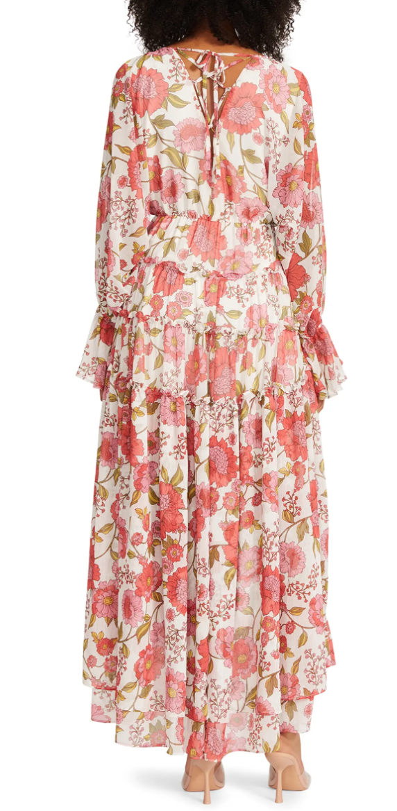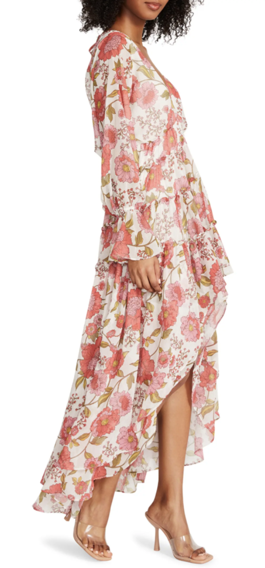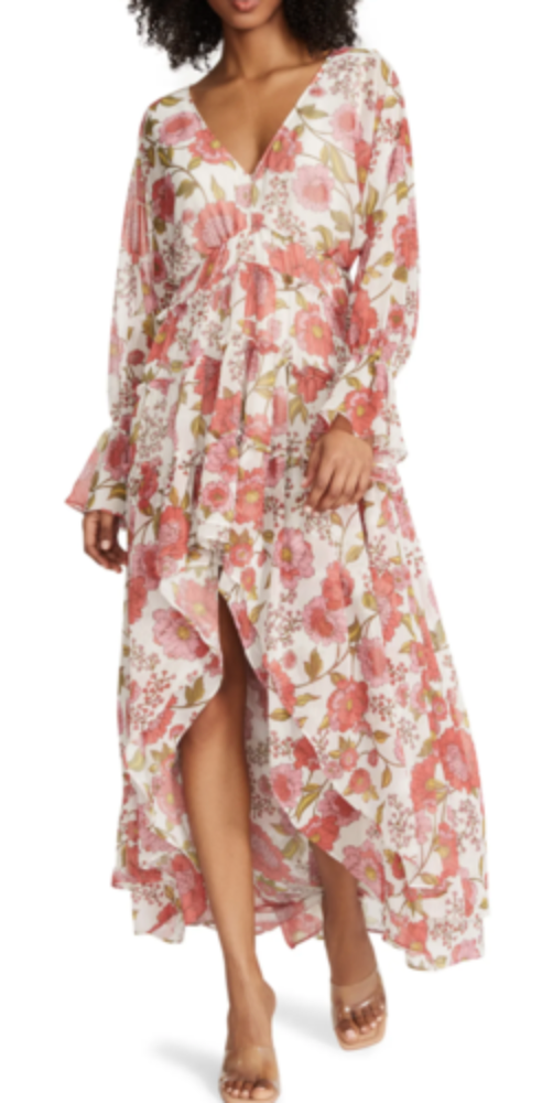 This light weight floral dress is a gorgeous addition to your closet for the warm weather. This dress features a high-low bottom and loose sleeves that cinch in on the wrists along with at the waist. The perfect dress for the warm weather!