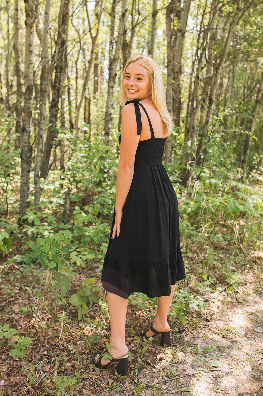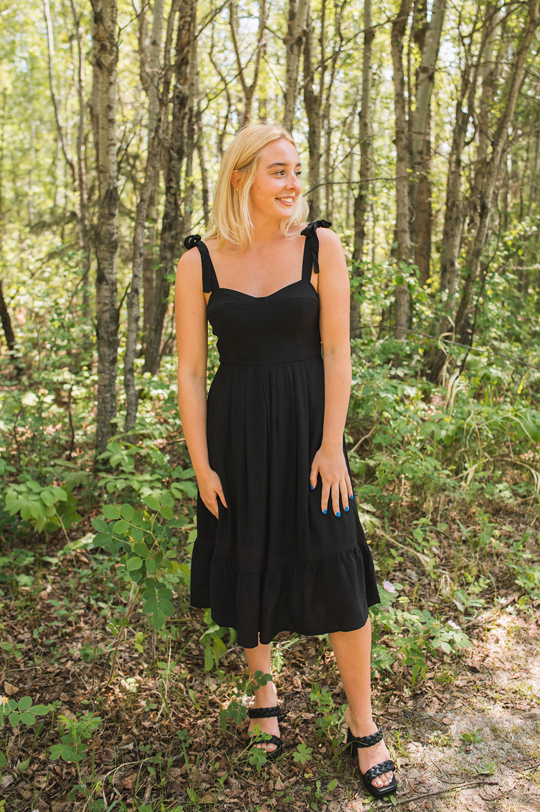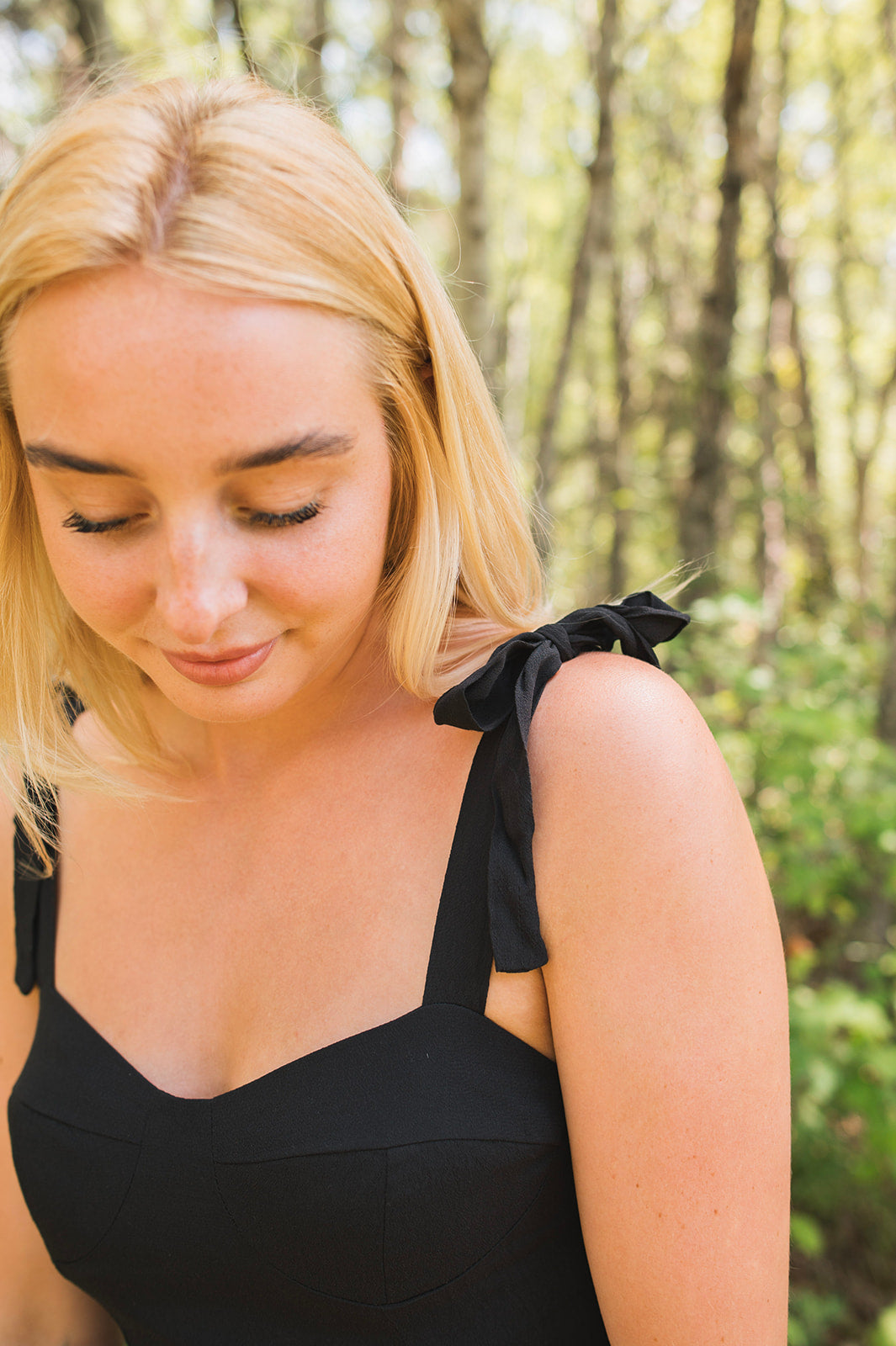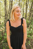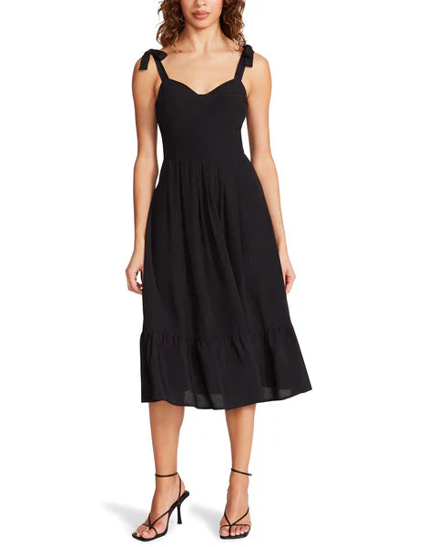This breezy crepe midi dress offers sweet style with tie straps, a bustier-inspired bodice and playfully flounced hem. A great basic to add to your closet!