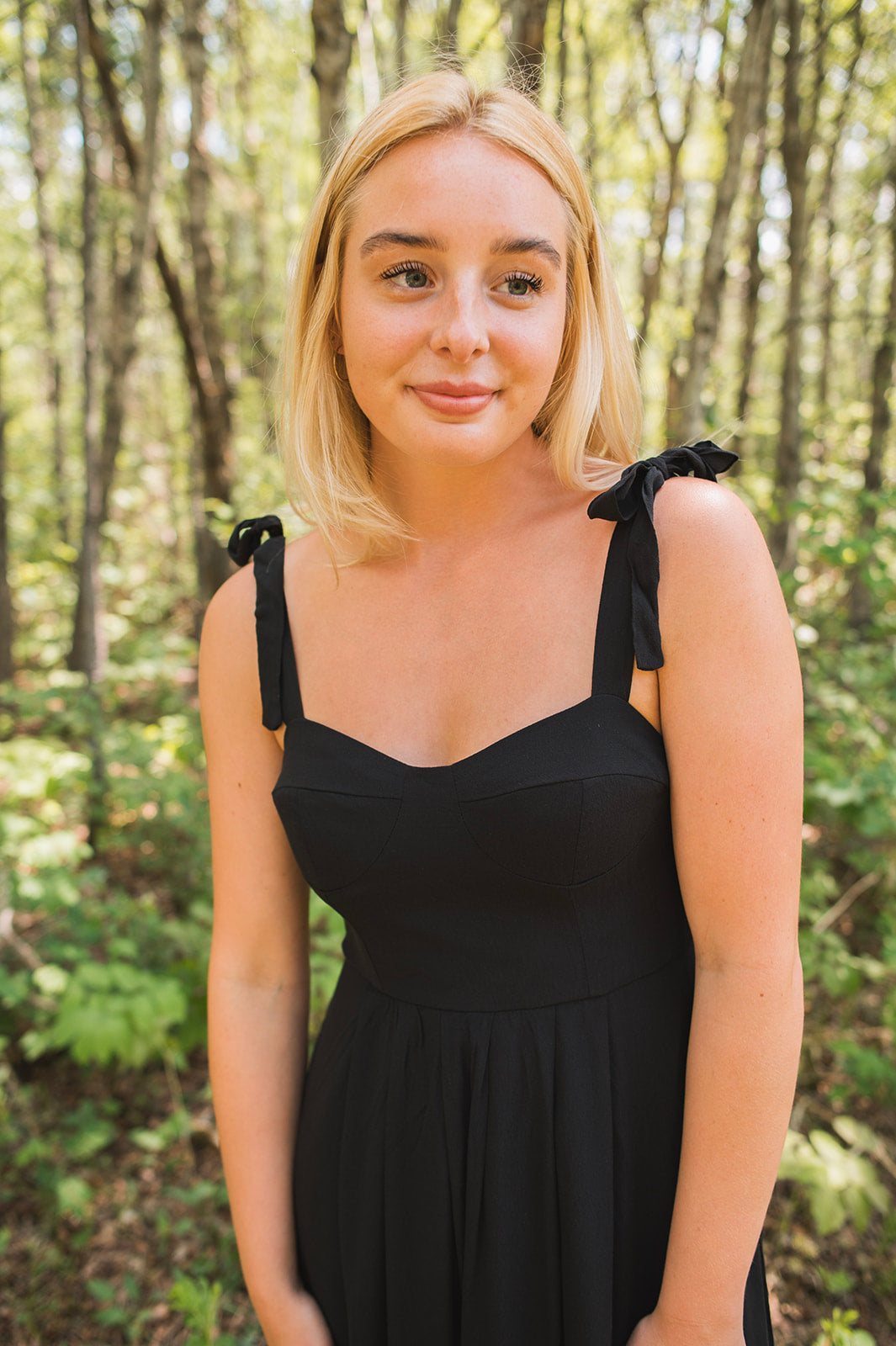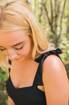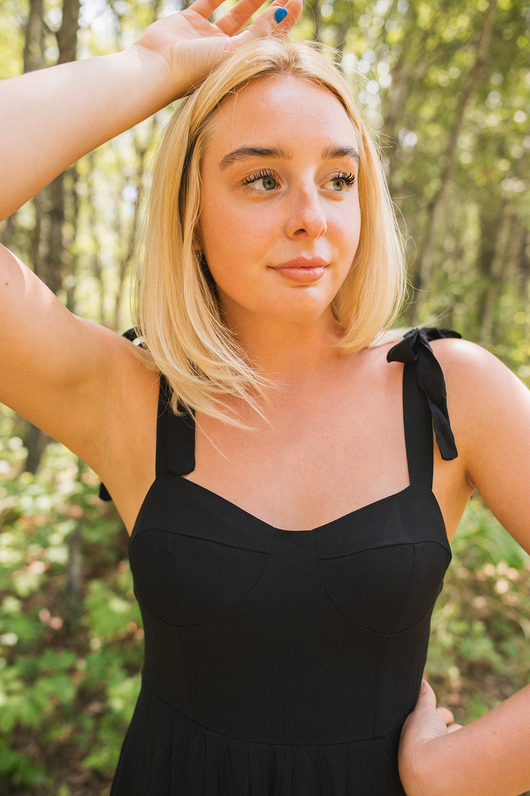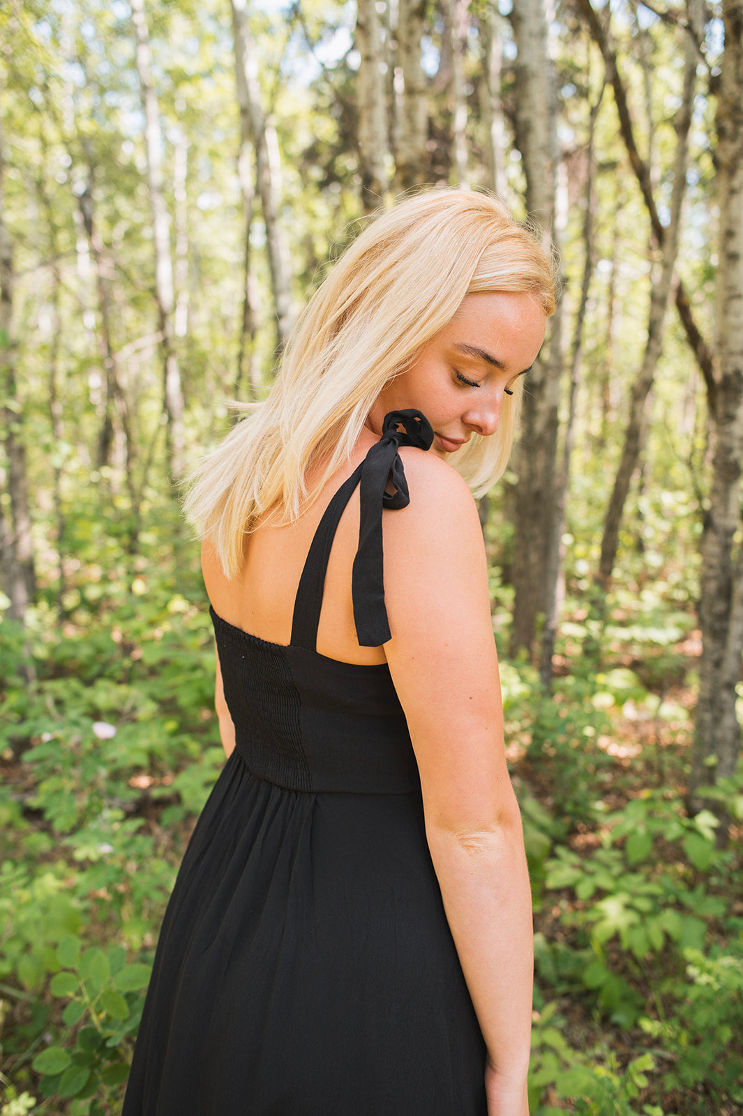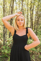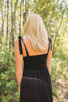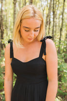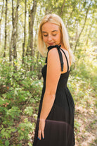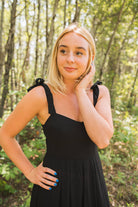 This breezy crepe midi dress offers sweet style with tie straps, a bustier-inspired bodice and playfully flounced hem. A great basic to add to your closet!