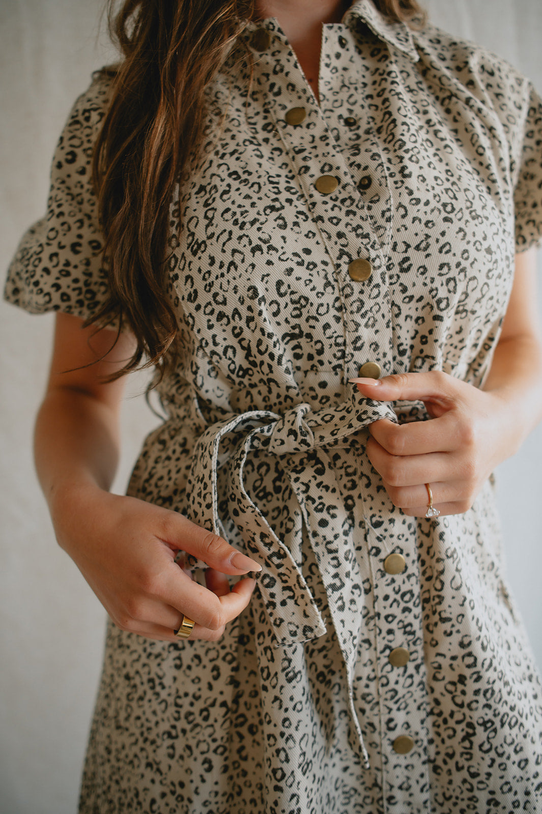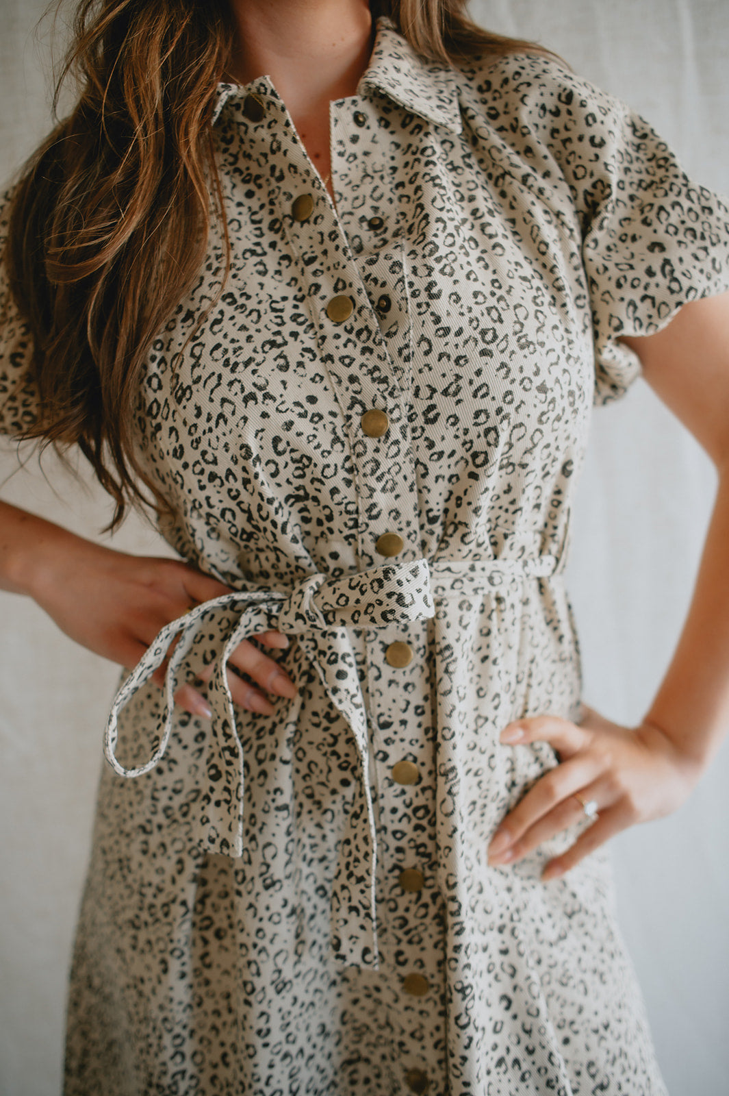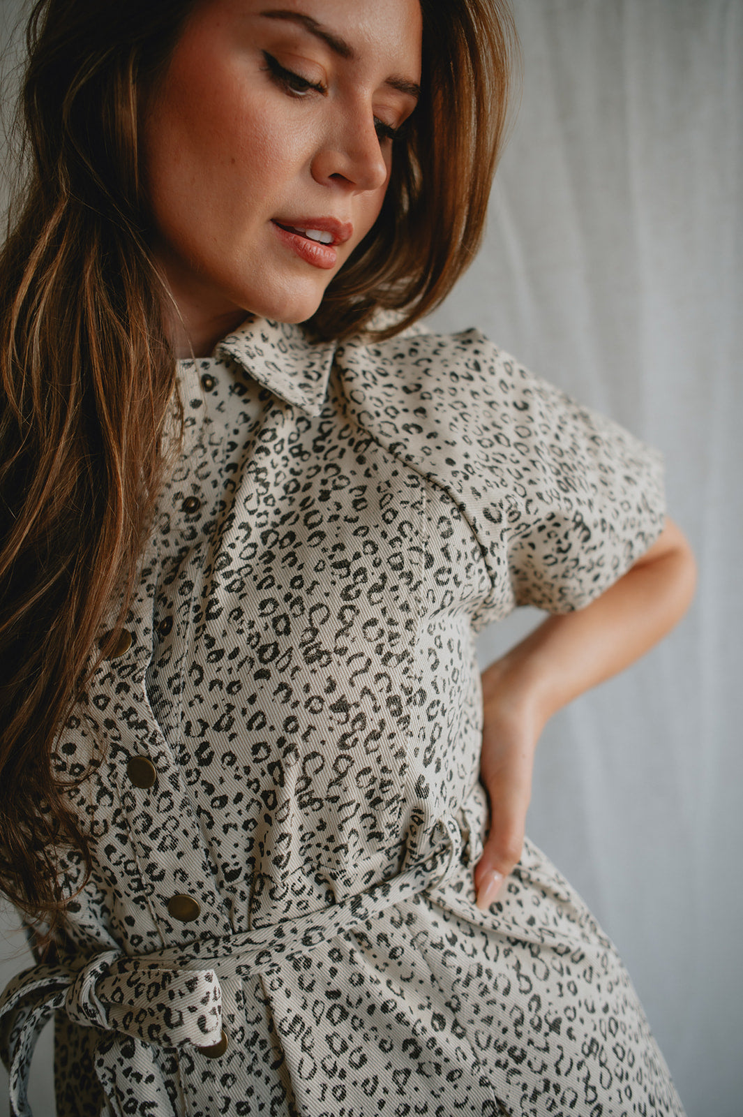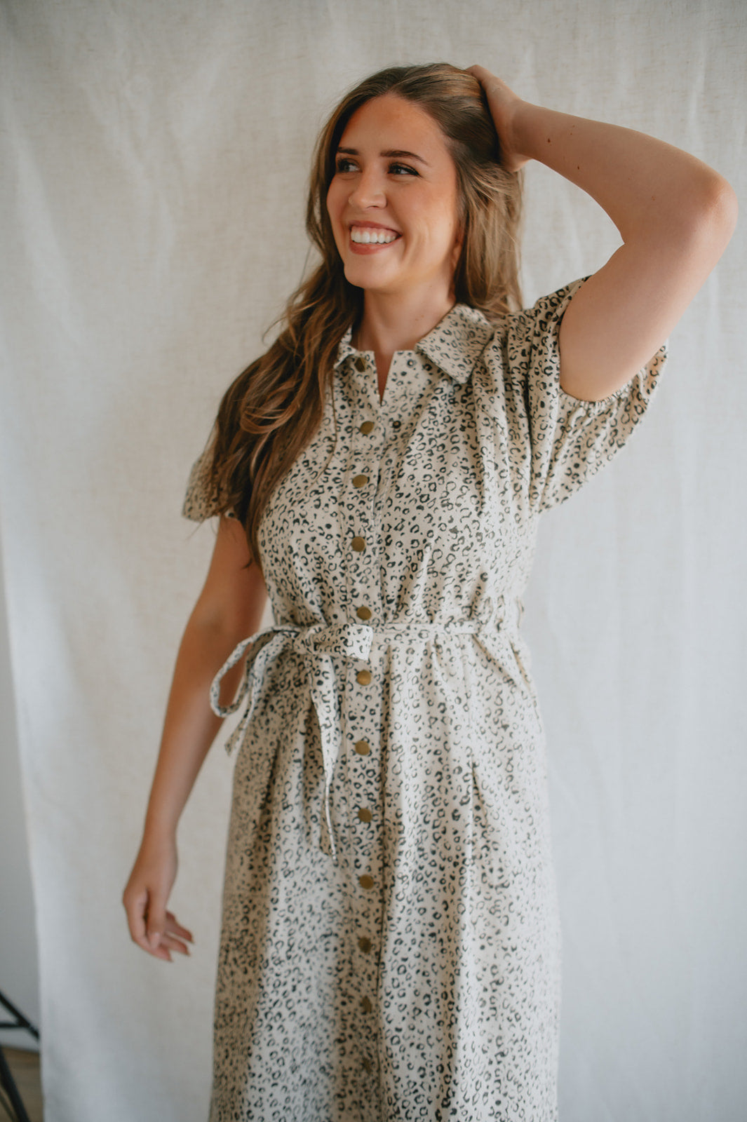 Make a bold statement with this effortlessly chic leopard print midi dress. Designed with a structured collared neckline and a full button-down front, it blends classic shirting details with standout style. A self-tie waist cinches the silhouette for a flattering, customizable fit, while elasticated sleeve cuffs add soft volume and comfort.
