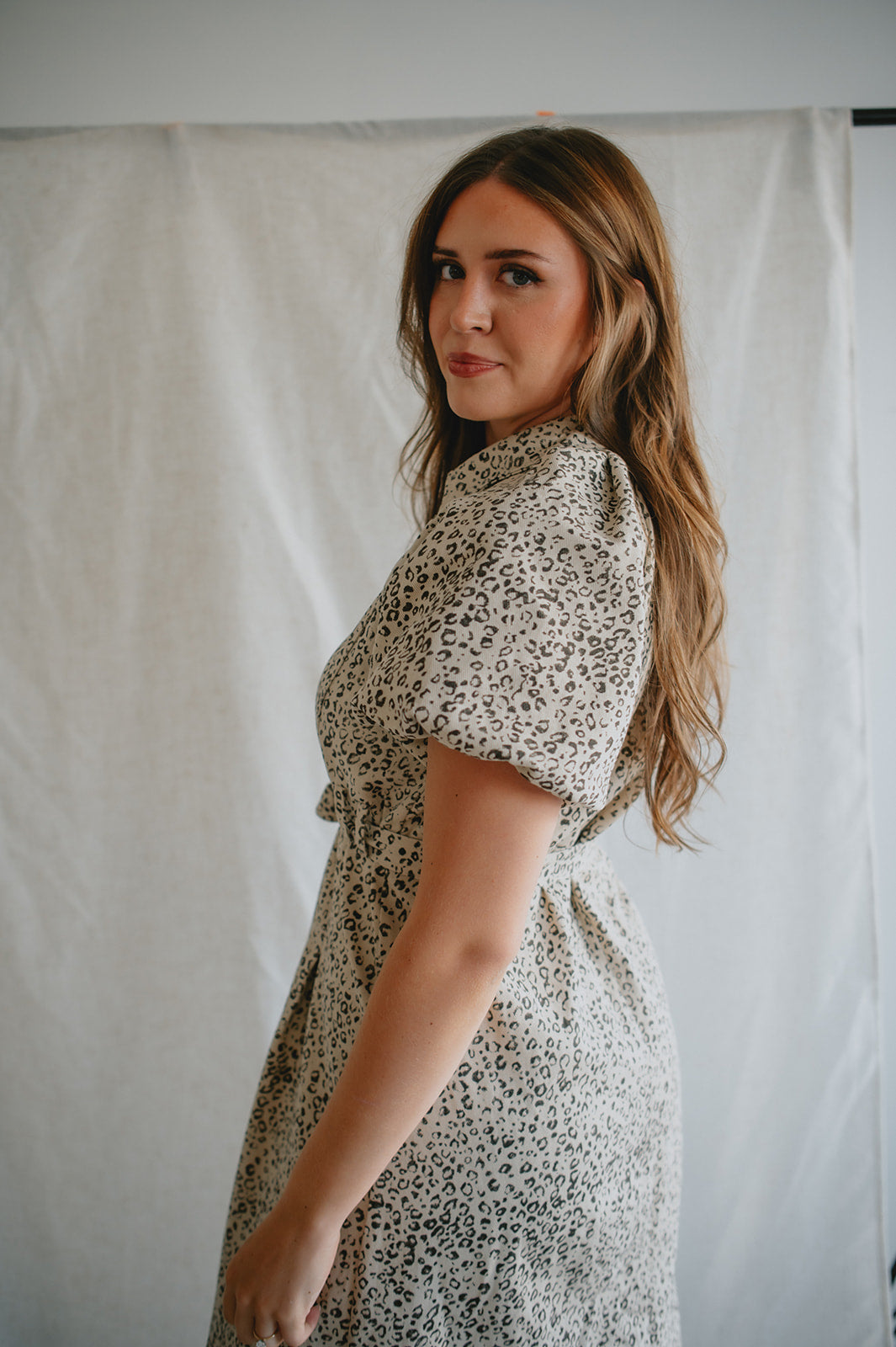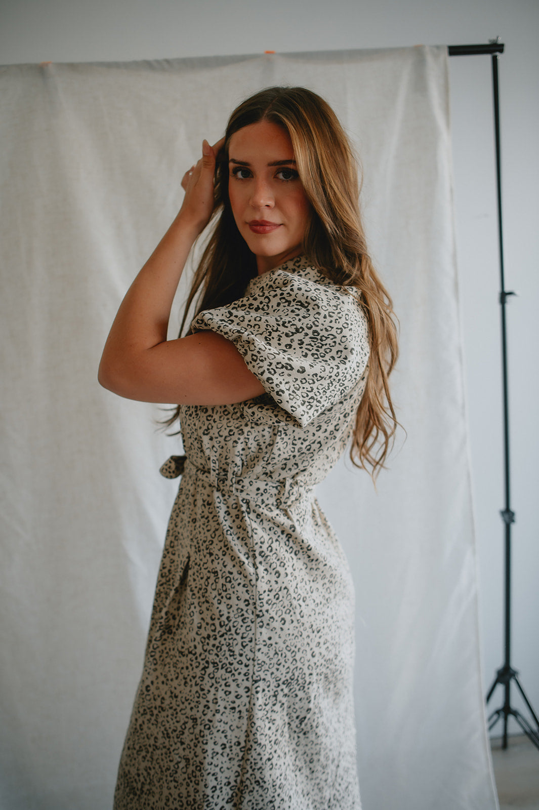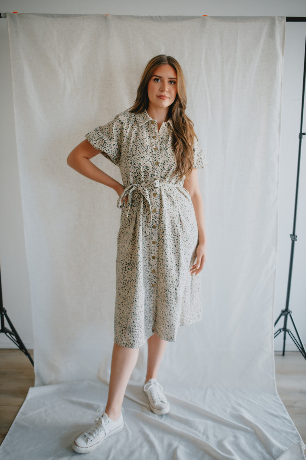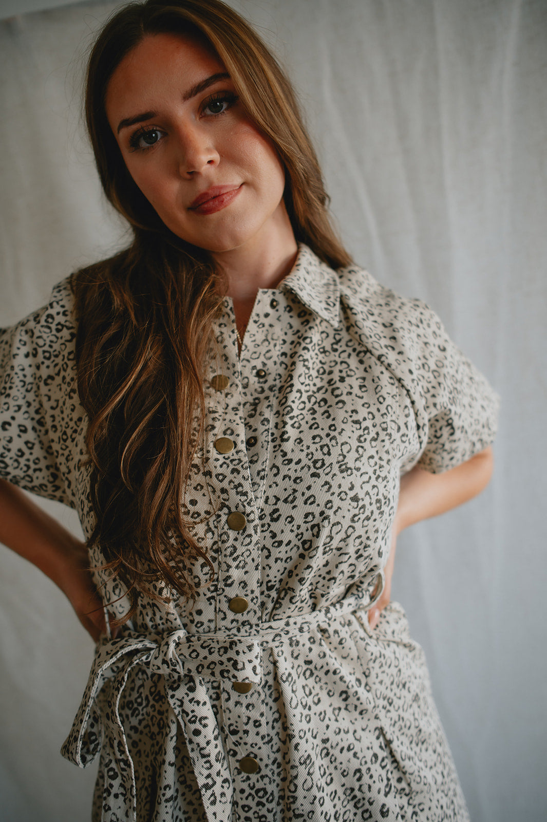 Make a bold statement with this effortlessly chic leopard print midi dress. Designed with a structured collared neckline and a full button-down front, it blends classic shirting details with standout style. A self-tie waist cinches the silhouette for a flattering, customizable fit, while elasticated sleeve cuffs add soft volume and comfort.