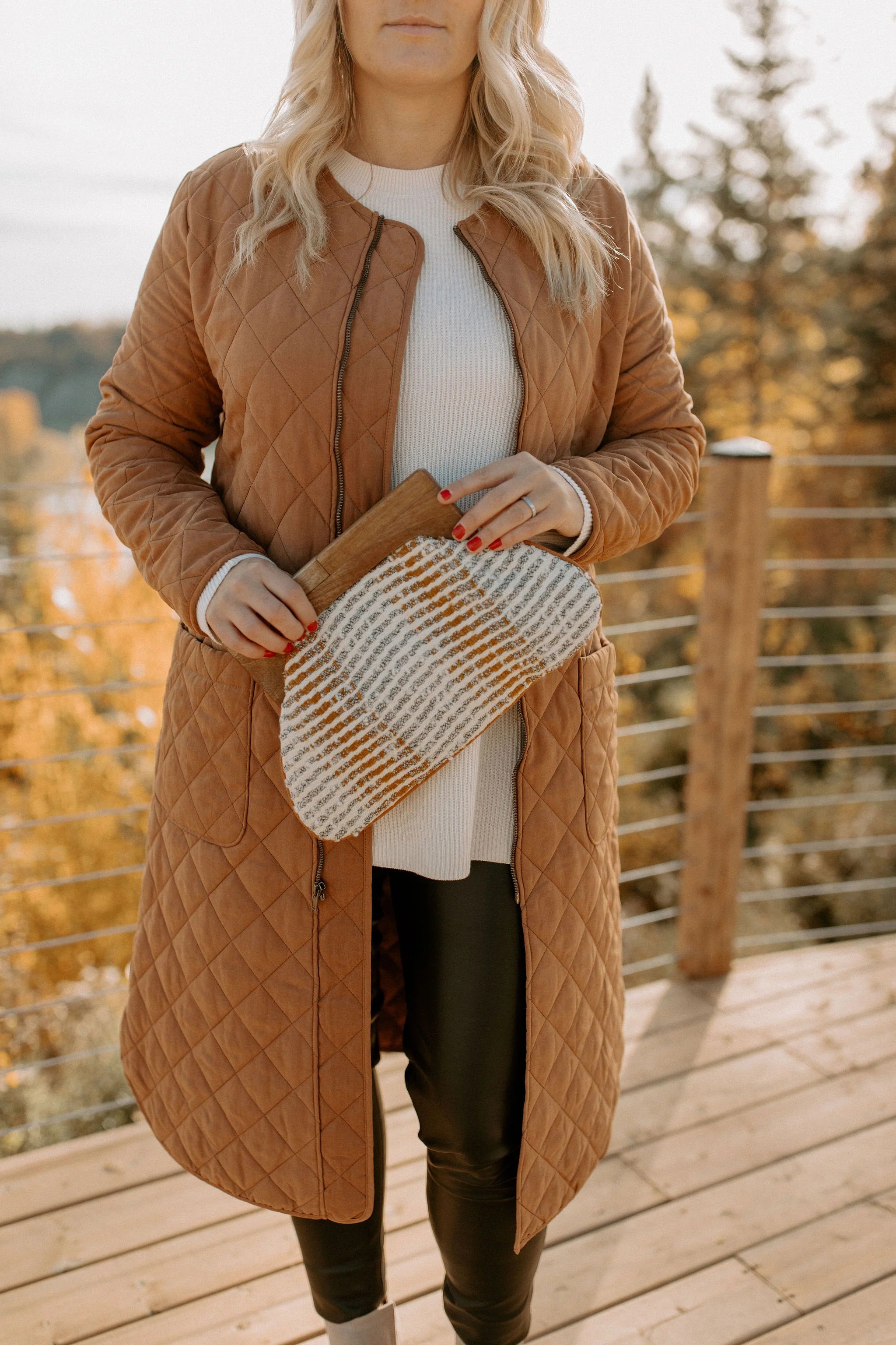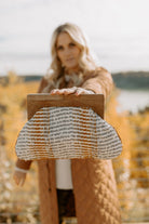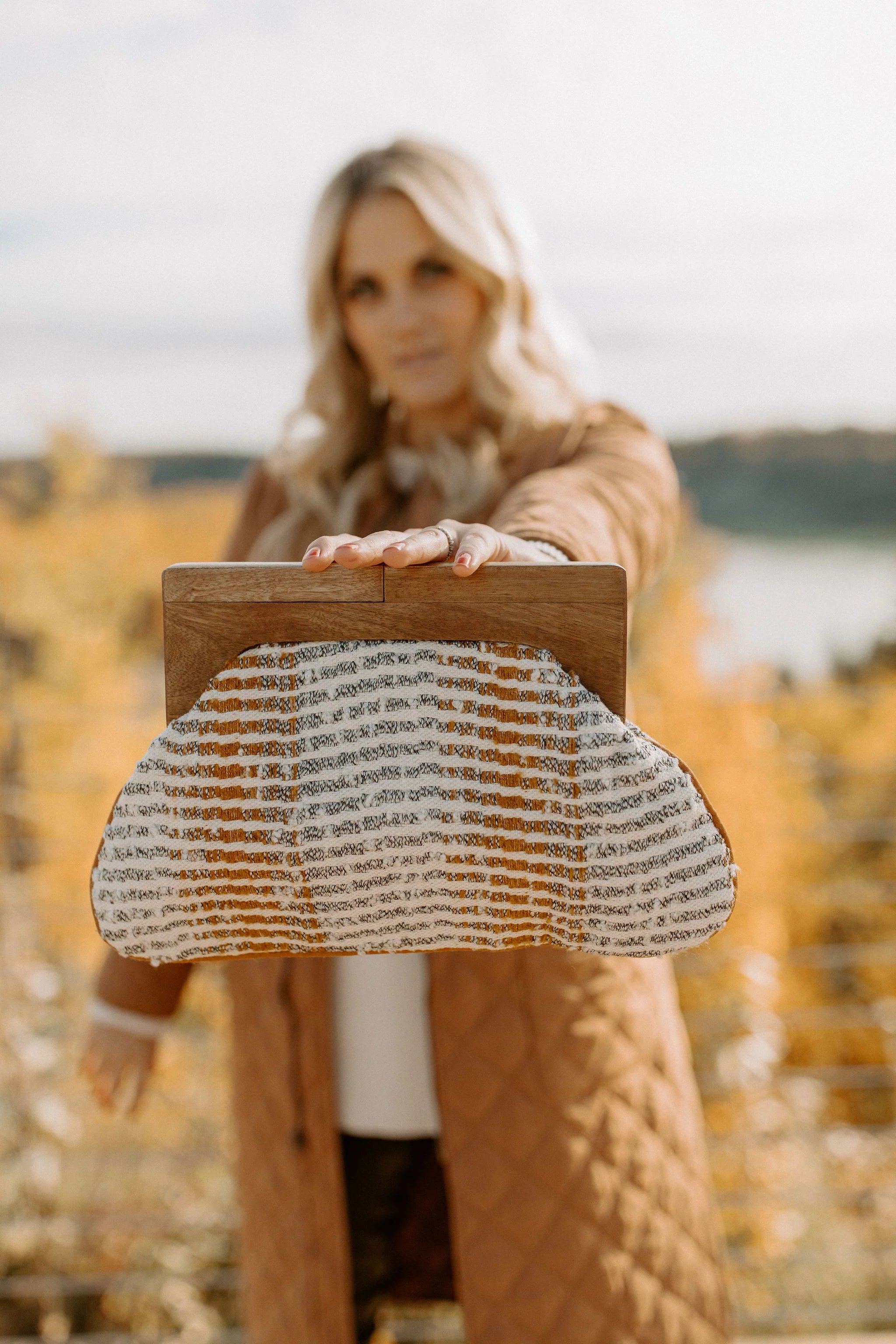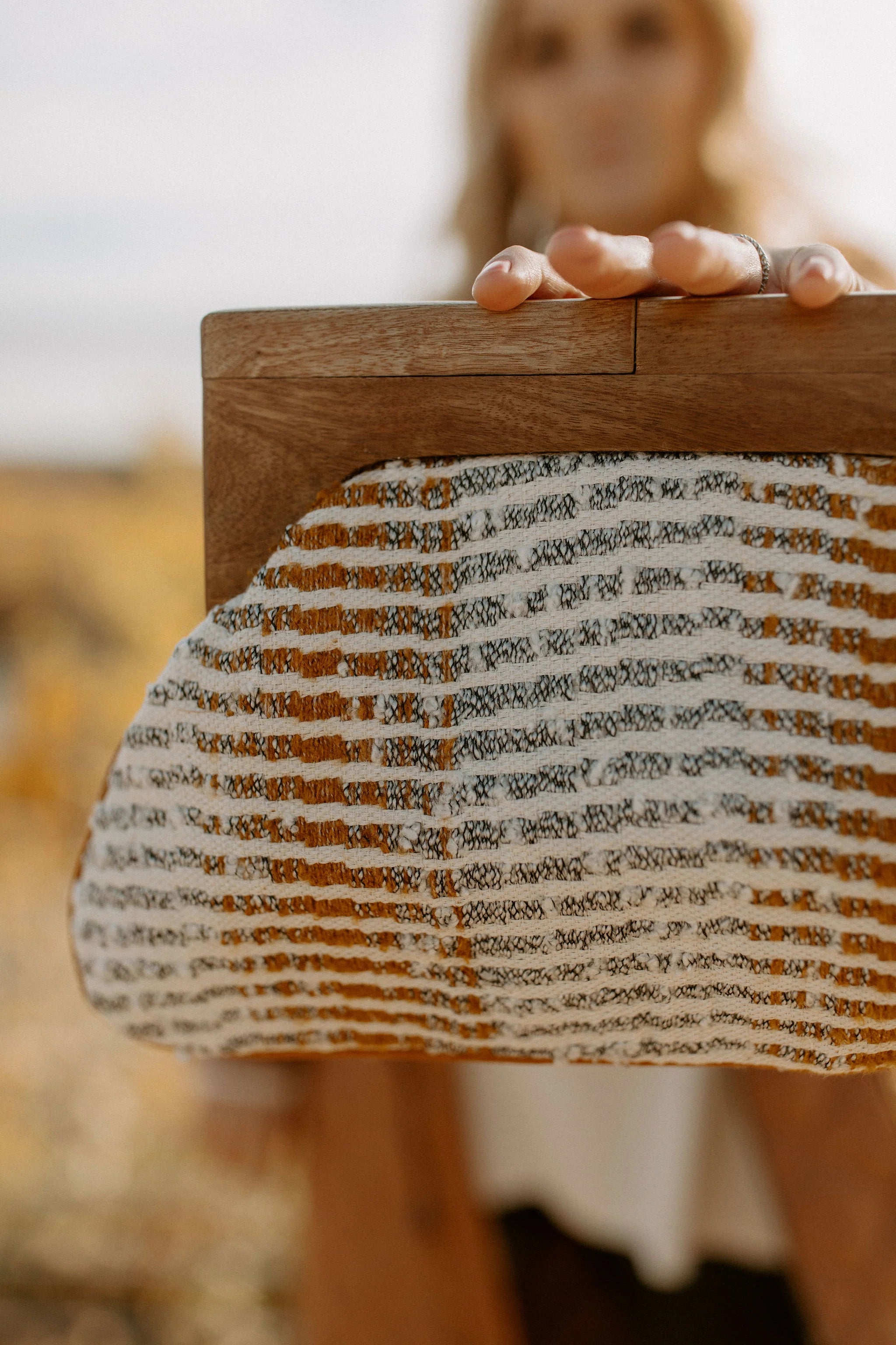 The Silas Clutch is a beautiful intricate beaded clutch with a wooden handle.
