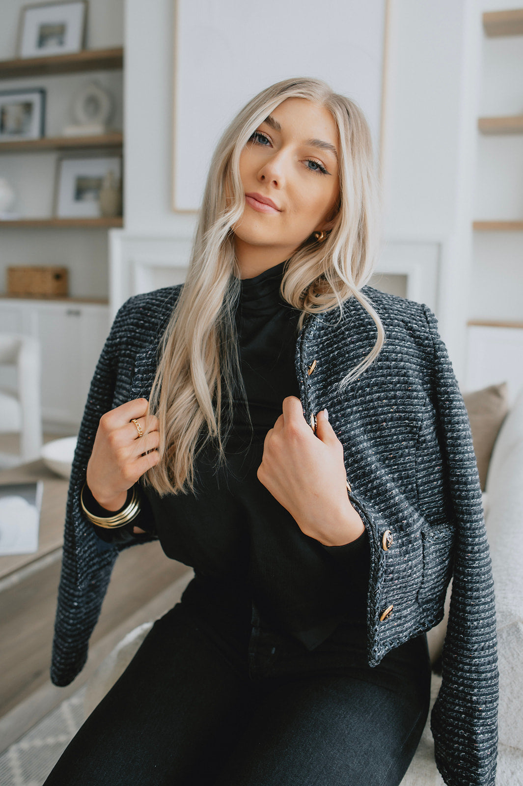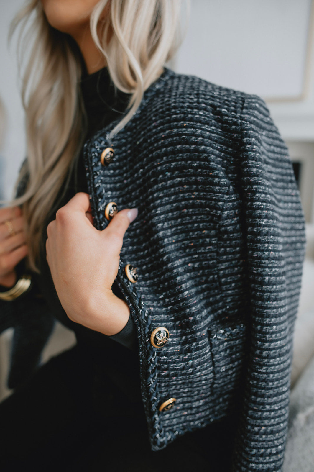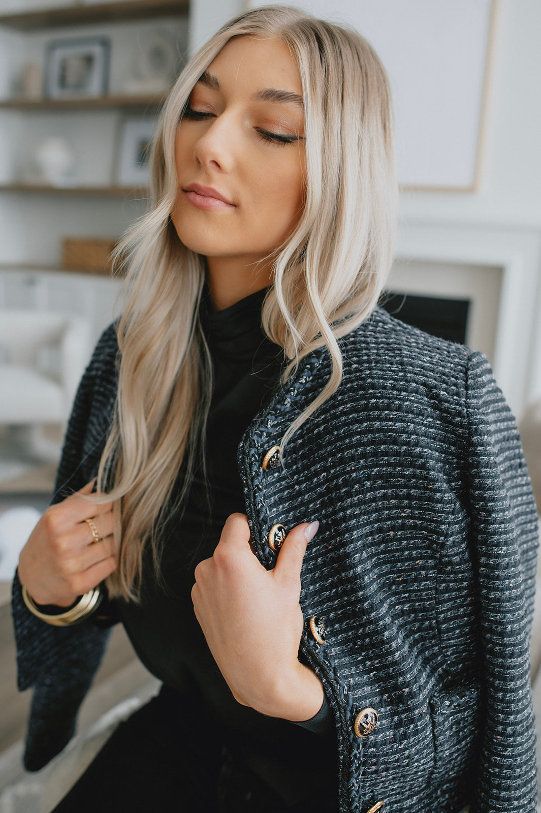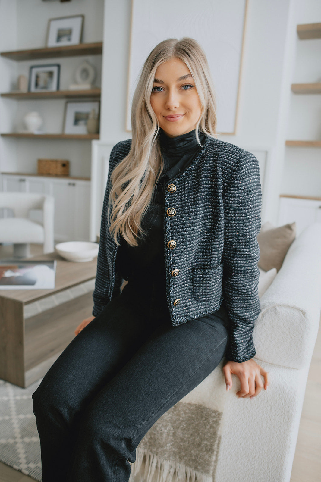 Meet our Billie Blazer, the perfect going-out blazer in a fun novelty tweed. It has a novelty button closure and braided detailing along the edges. Layer over your favorite tank and denim for an on the go look.
