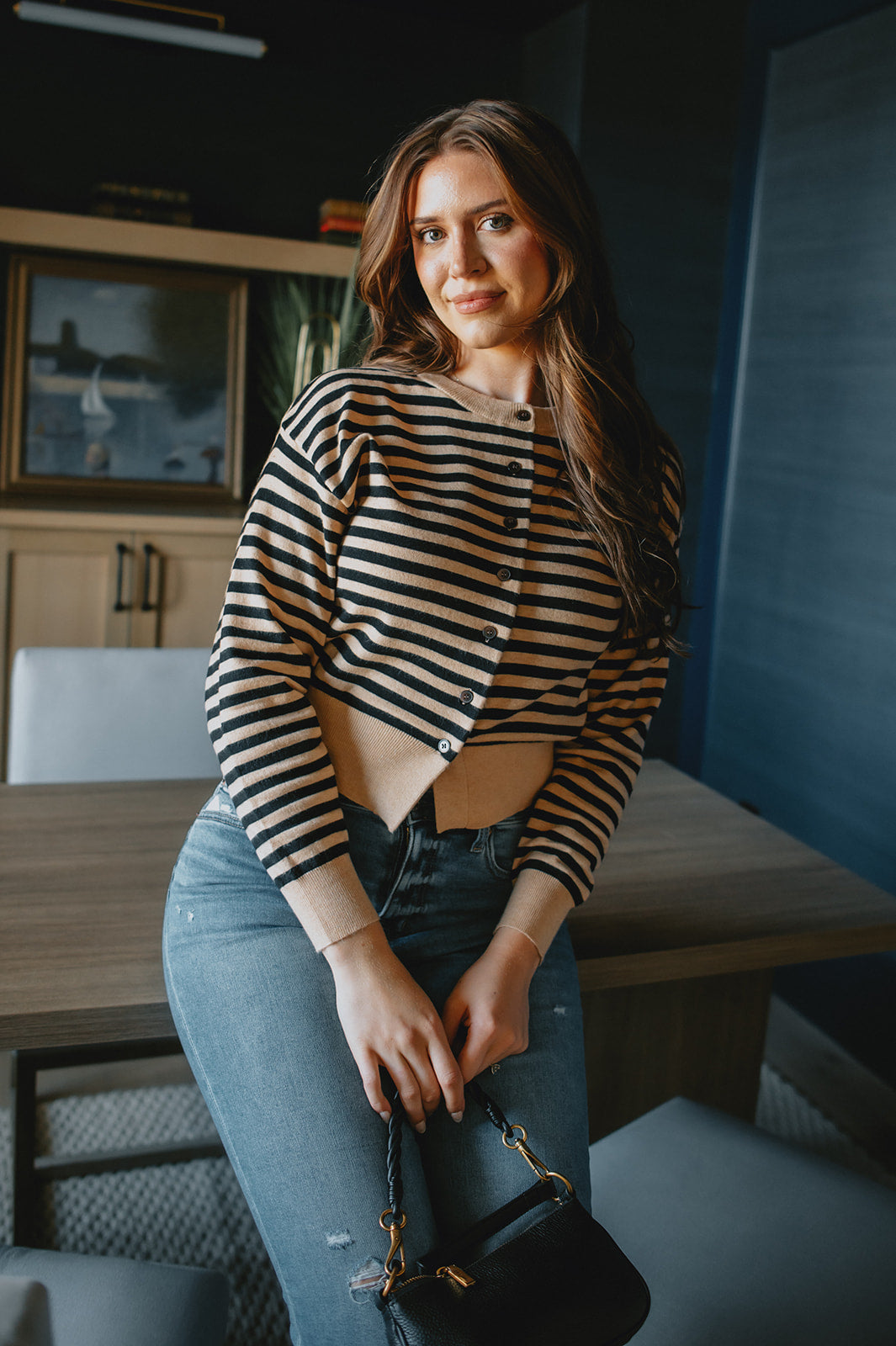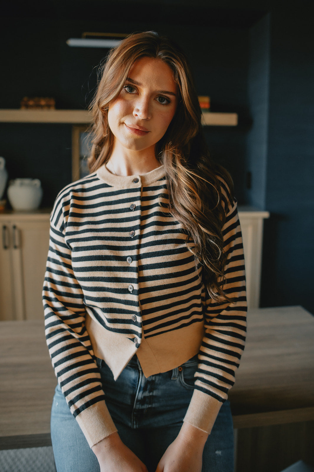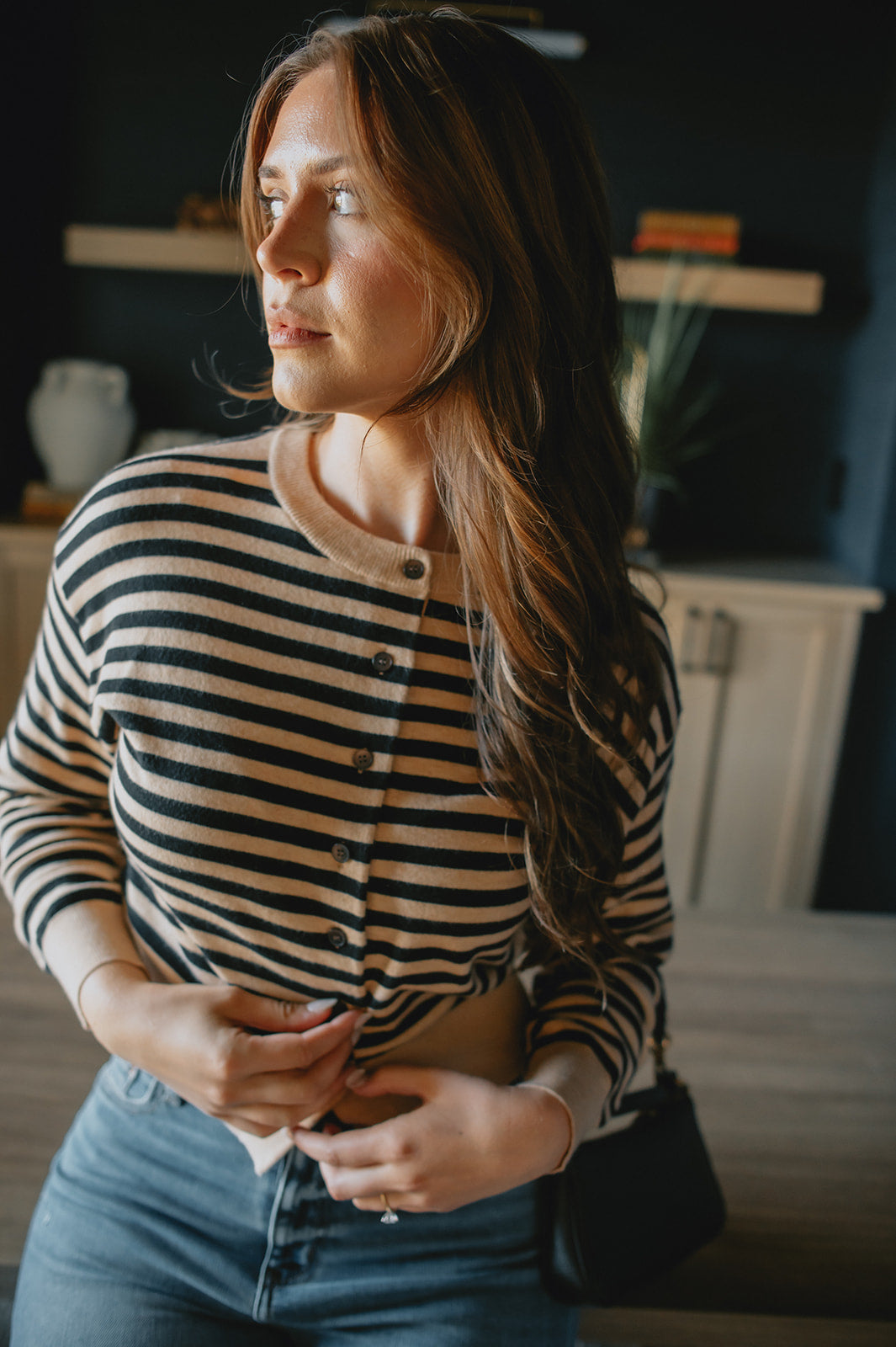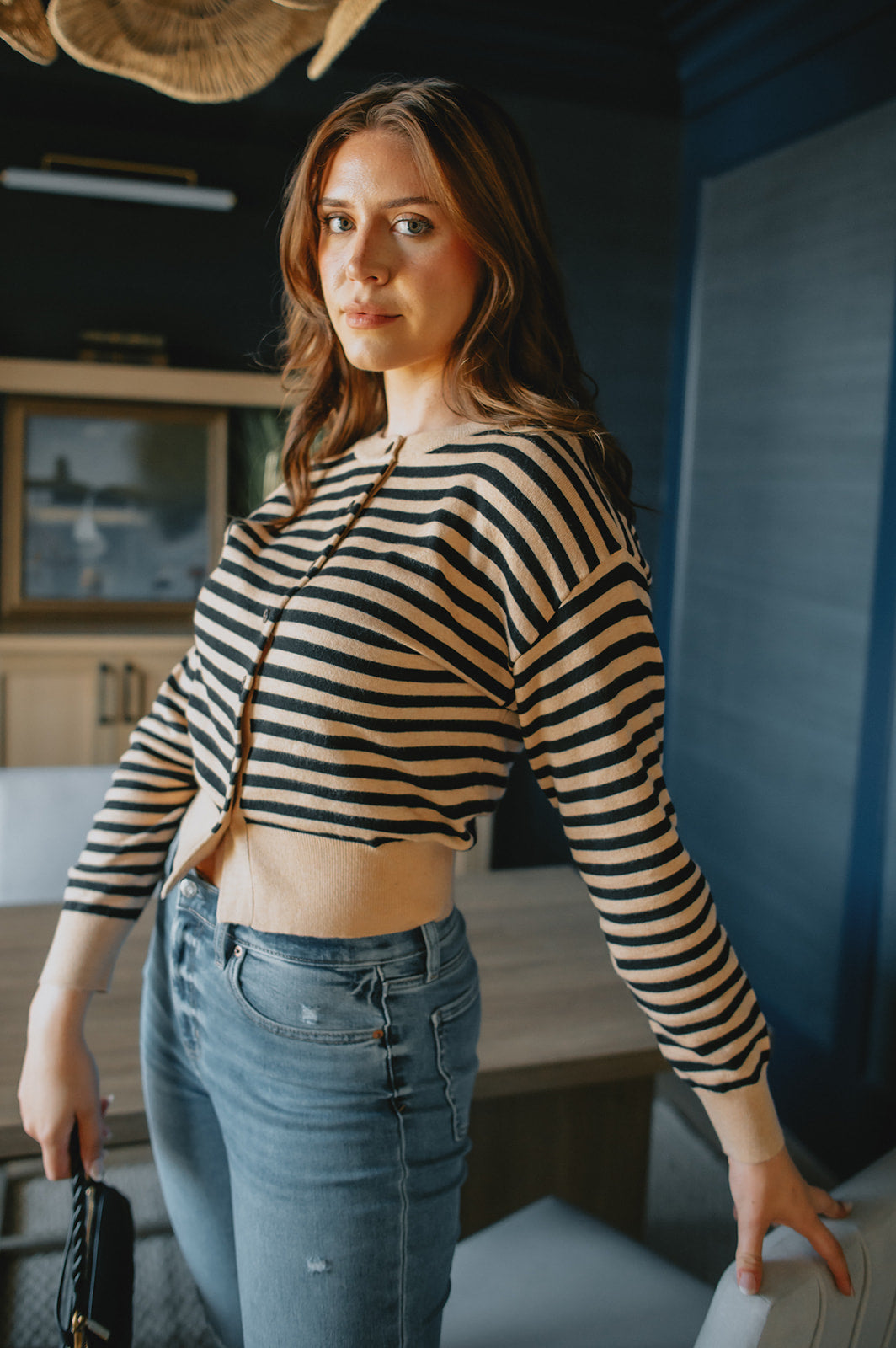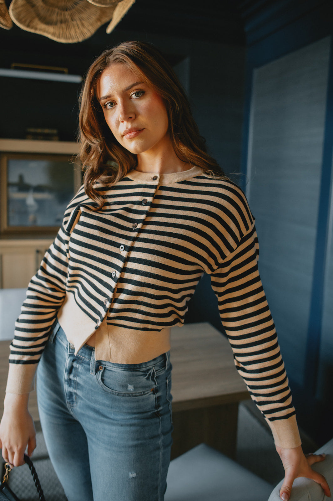 The perfect multi-functional wardrobe addition – this classic FRNCH stripped ‘Noumea’ cardigan can be worn layered up or solo. A super soft knitted cardigan that is a shorter length with button through front fastening, round neck and long sleeves. Black and neutral colour stripes make this extremely versatile!