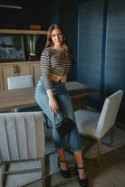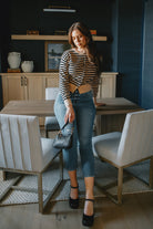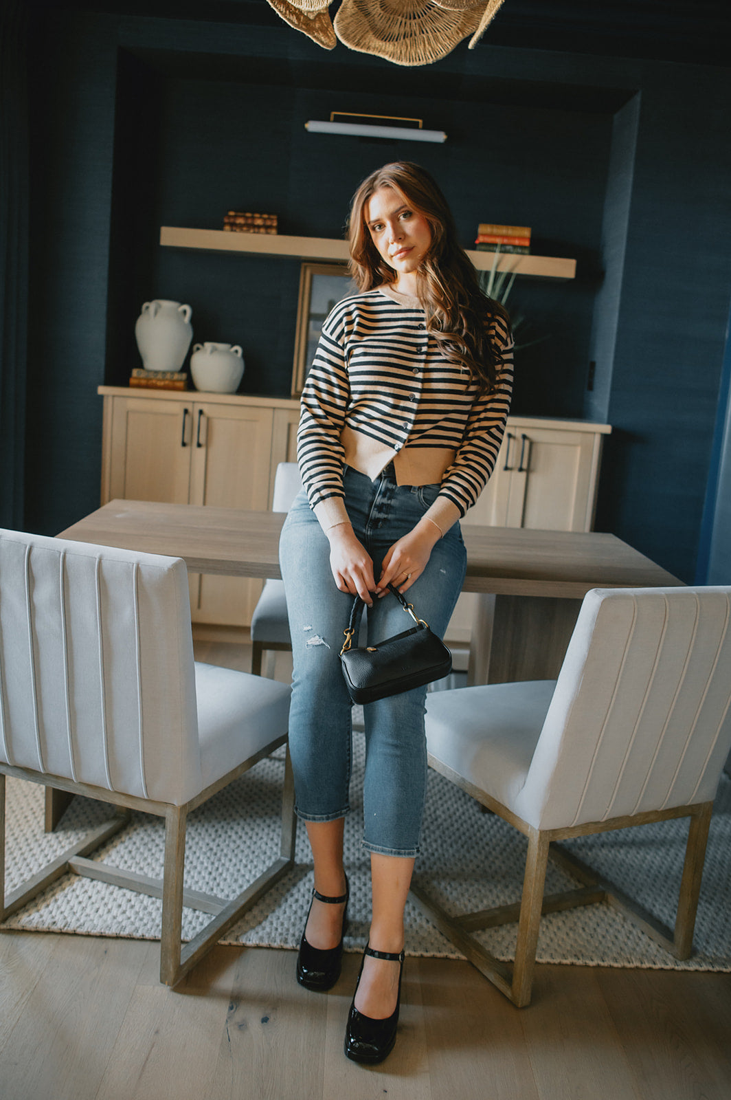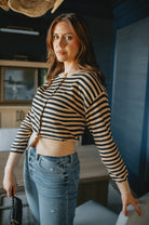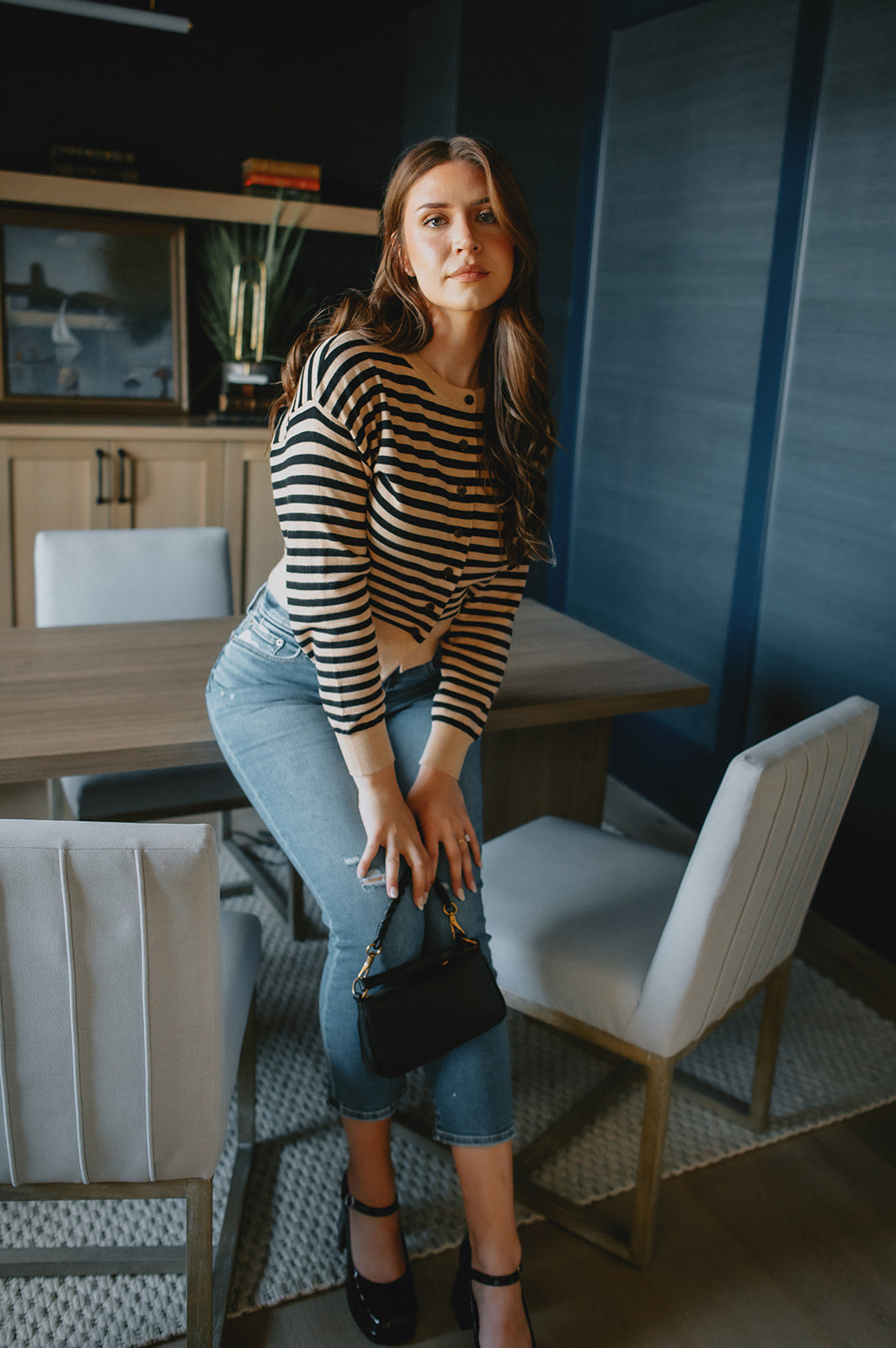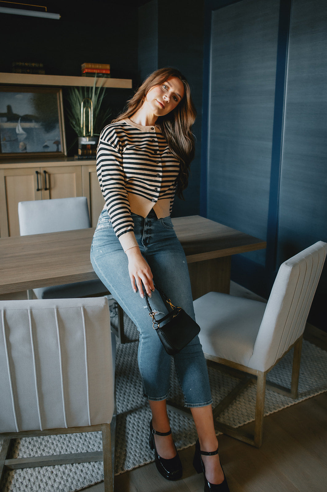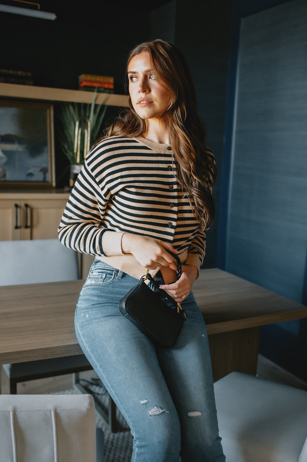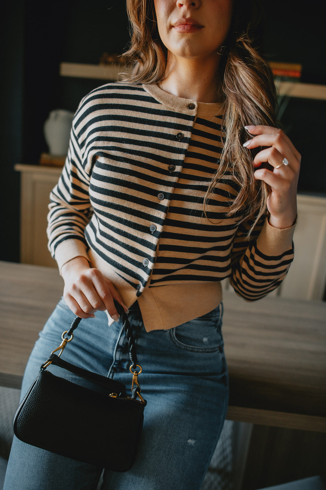 The perfect multi-functional wardrobe addition – this classic FRNCH stripped ‘Noumea’ cardigan can be worn layered up or solo. A super soft knitted cardigan that is a shorter length with button through front fastening, round neck and long sleeves. Black and neutral colour stripes make this extremely versatile!