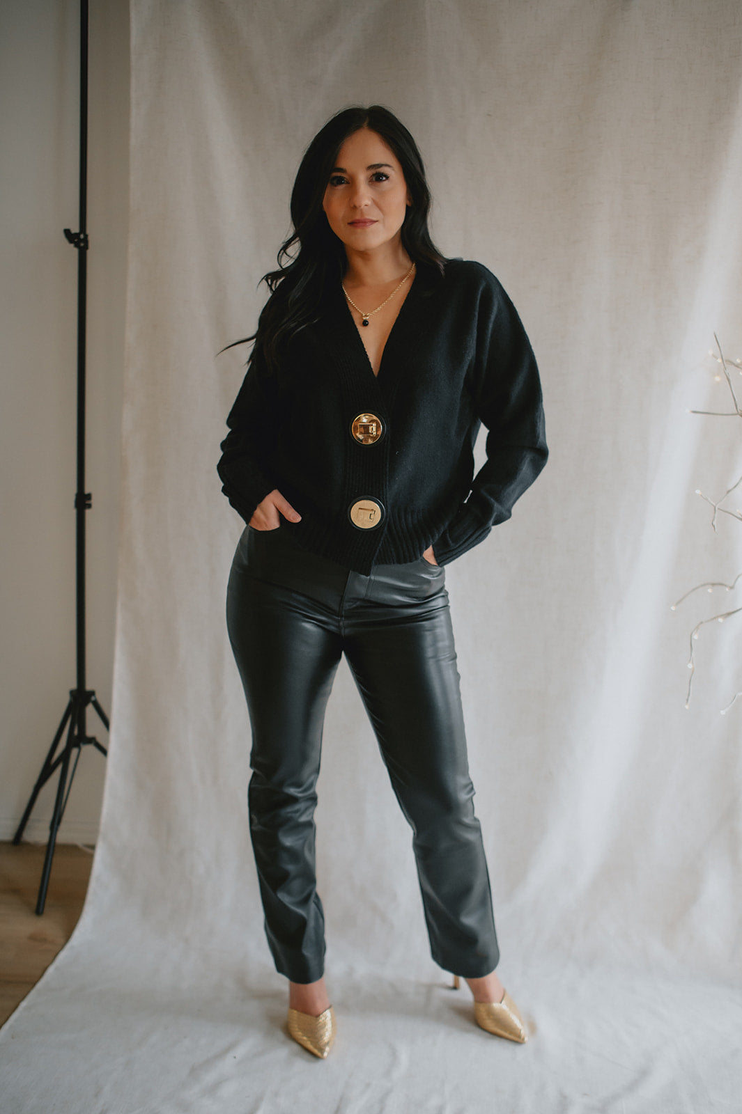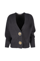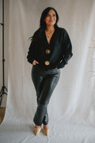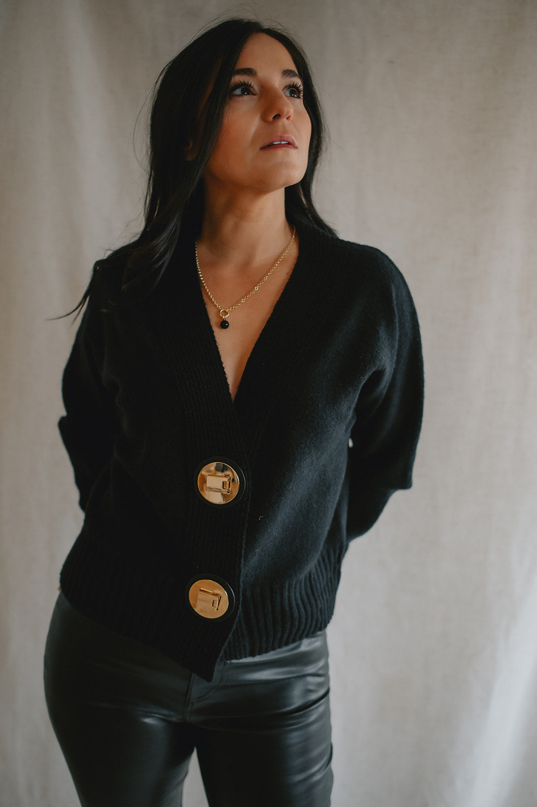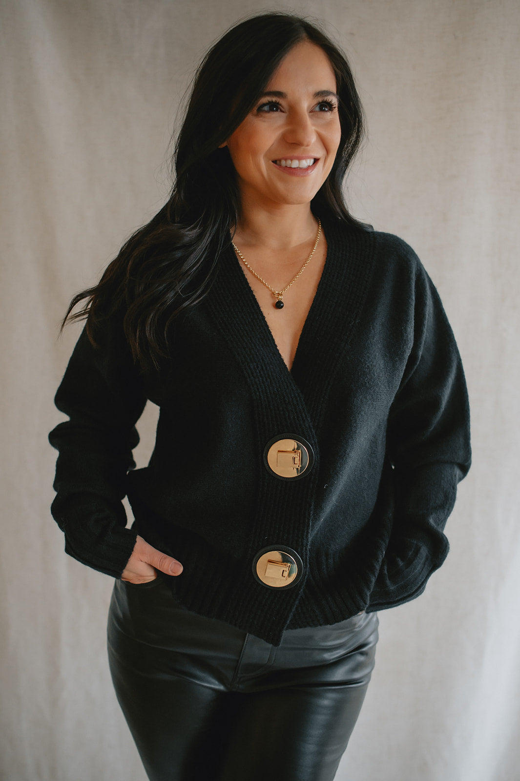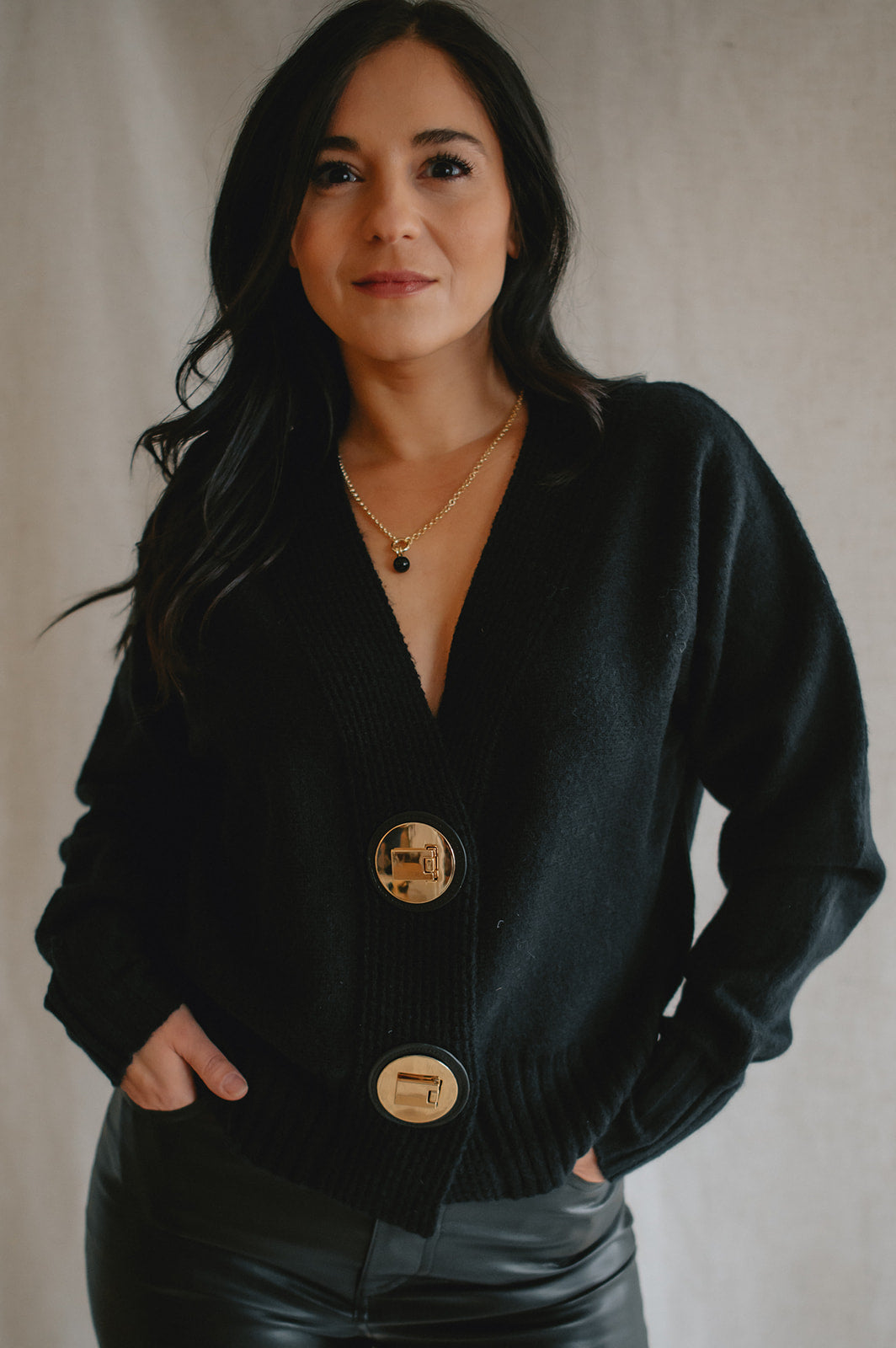 The standout detail? Two chunky gold buttons set on leather-look tabs, adding a bold, polished finish that brings a touch of modern sophistication to this clean silhouette. Whether worn buttoned up or layered open, this piece offers versatility, structure, and understated elegance.