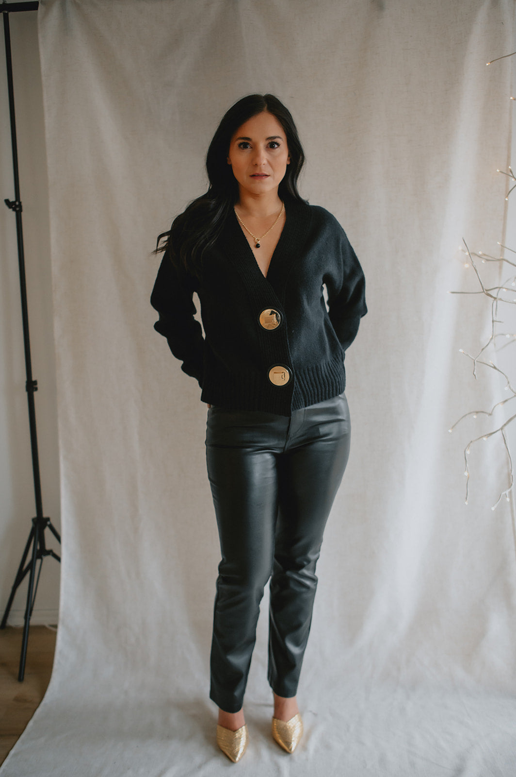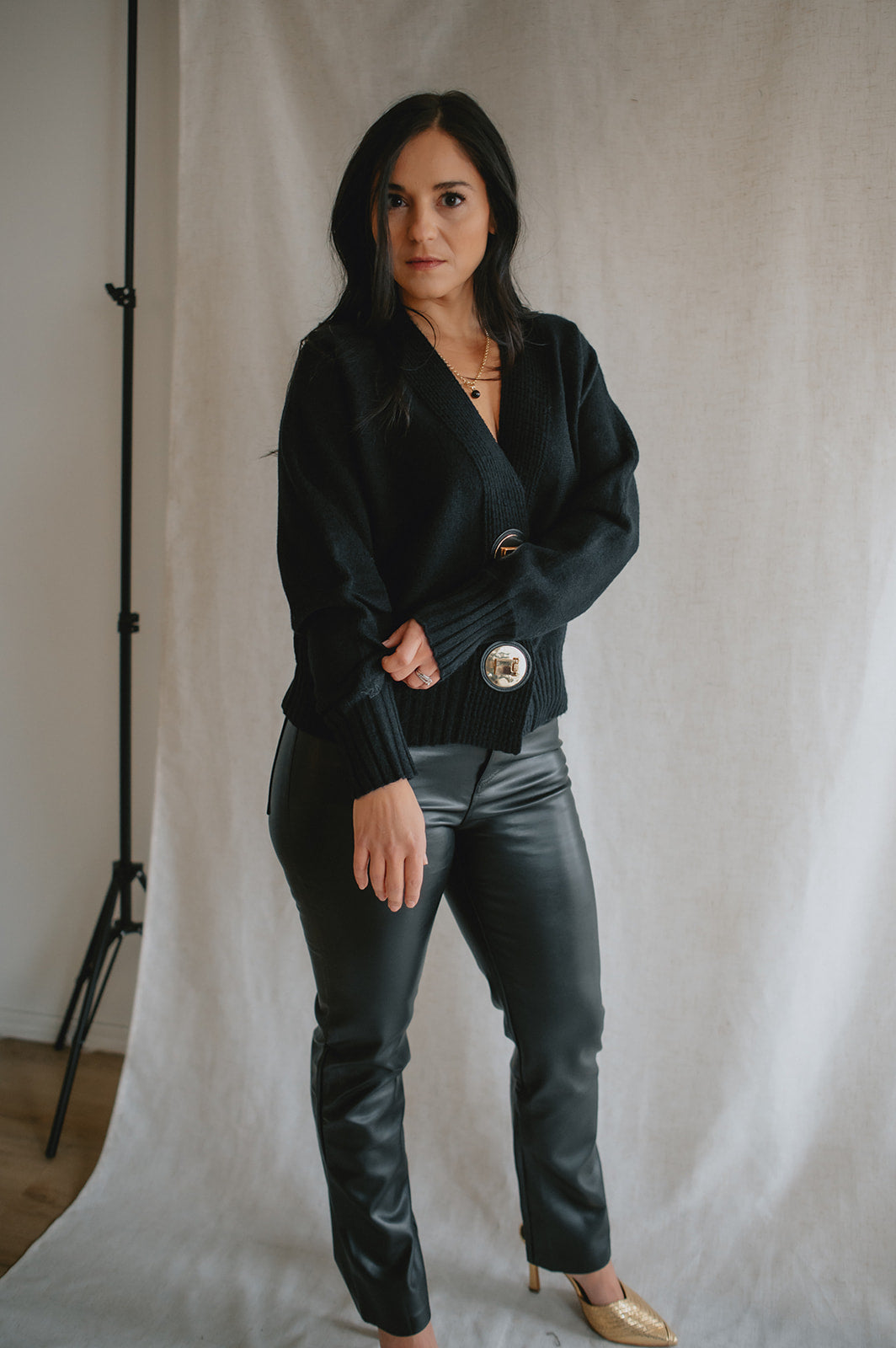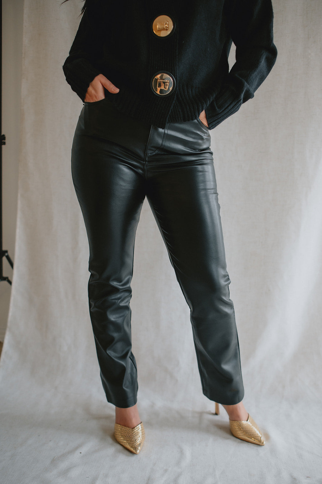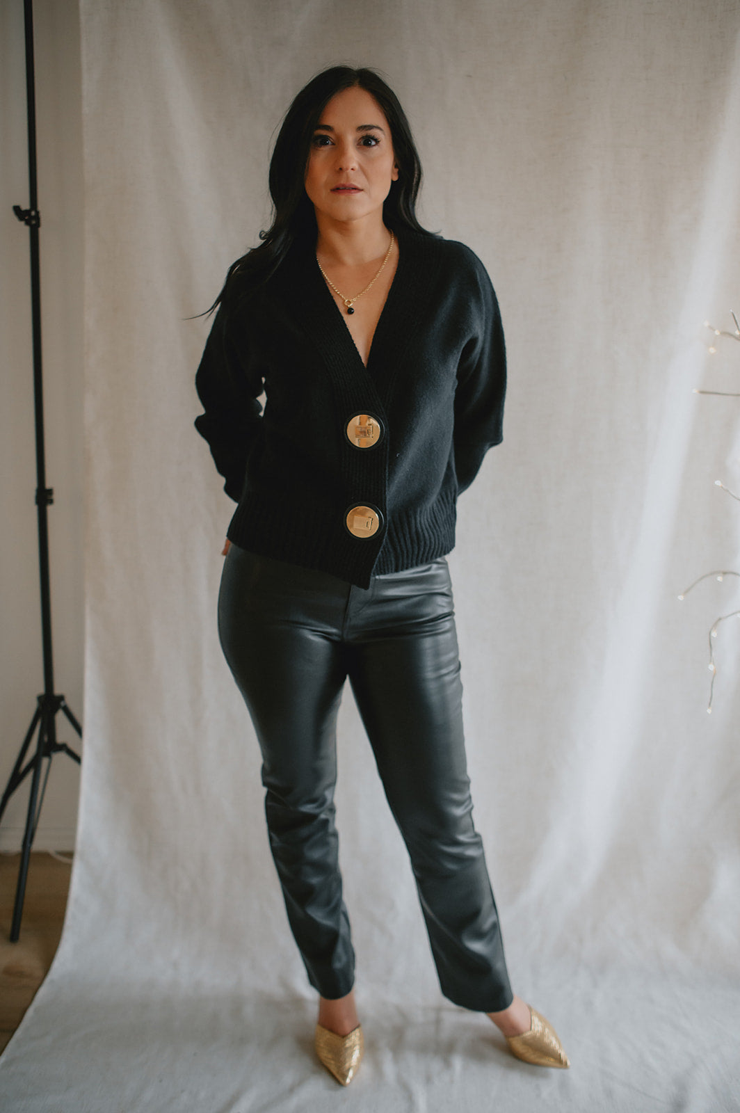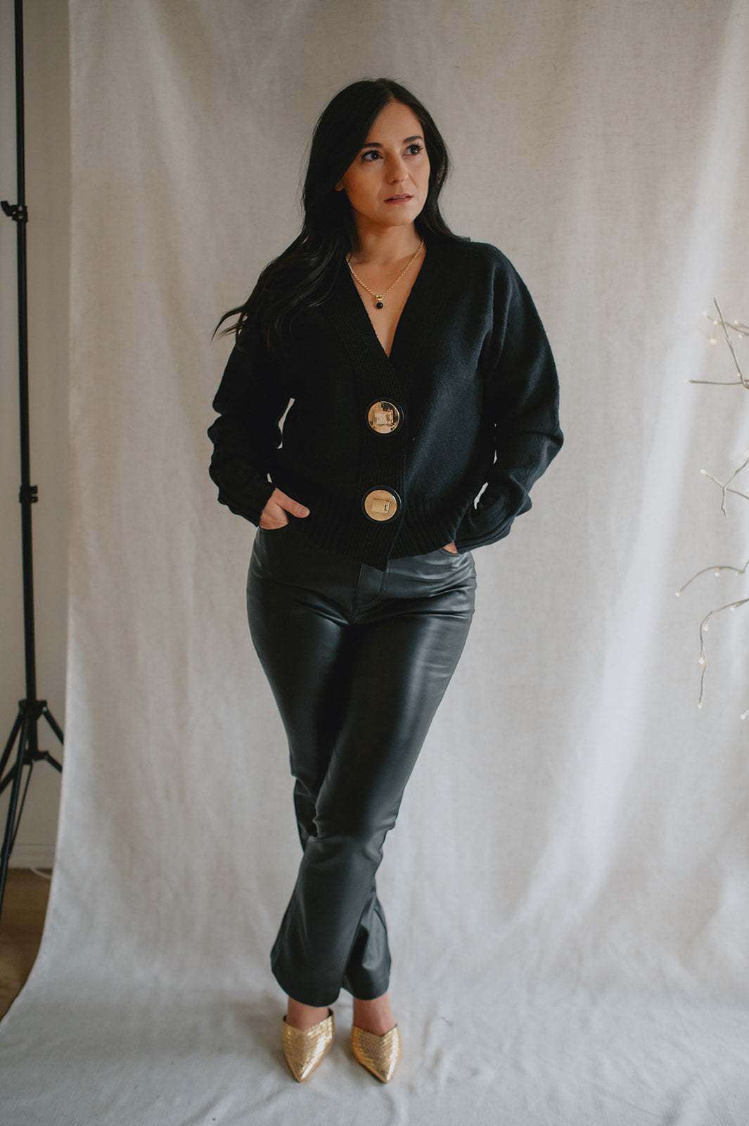 The standout detail? Two chunky gold buttons set on leather-look tabs, adding a bold, polished finish that brings a touch of modern sophistication to this clean silhouette. Whether worn buttoned up or layered open, this piece offers versatility, structure, and understated elegance.