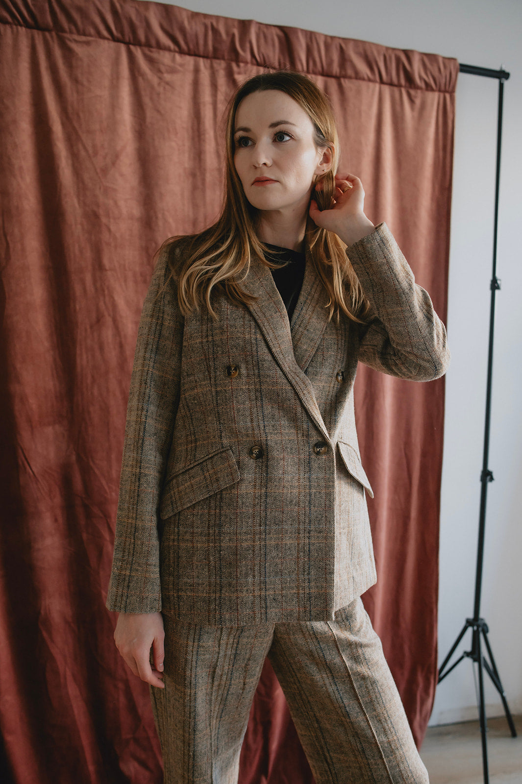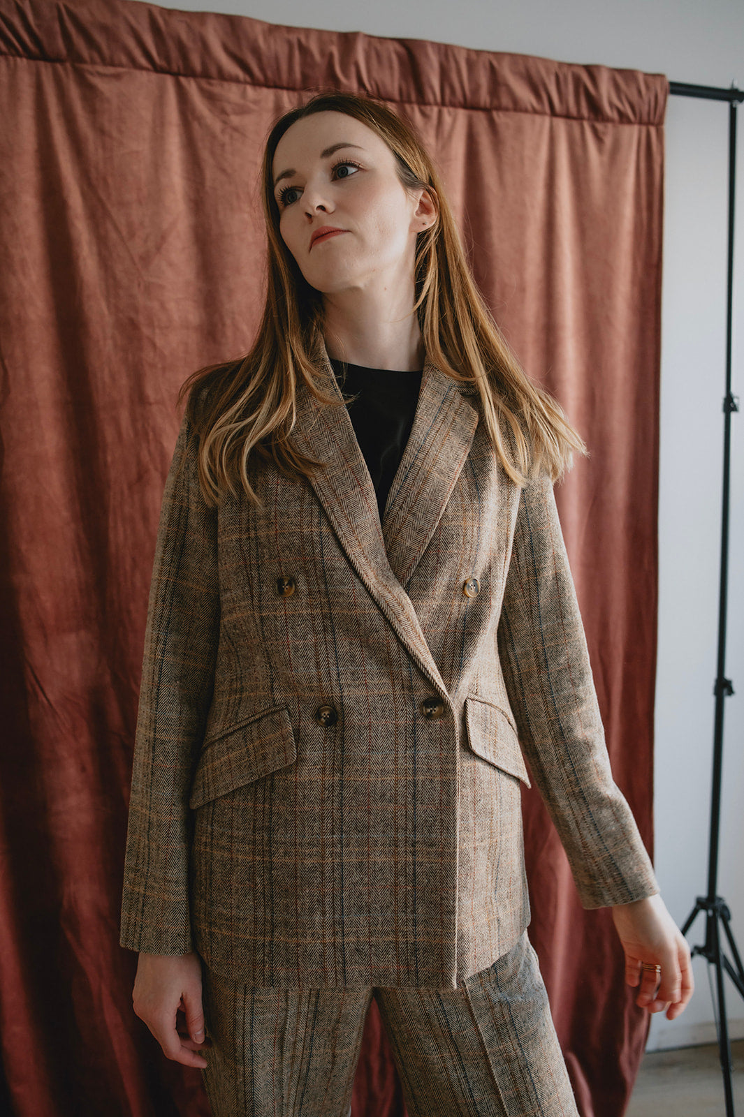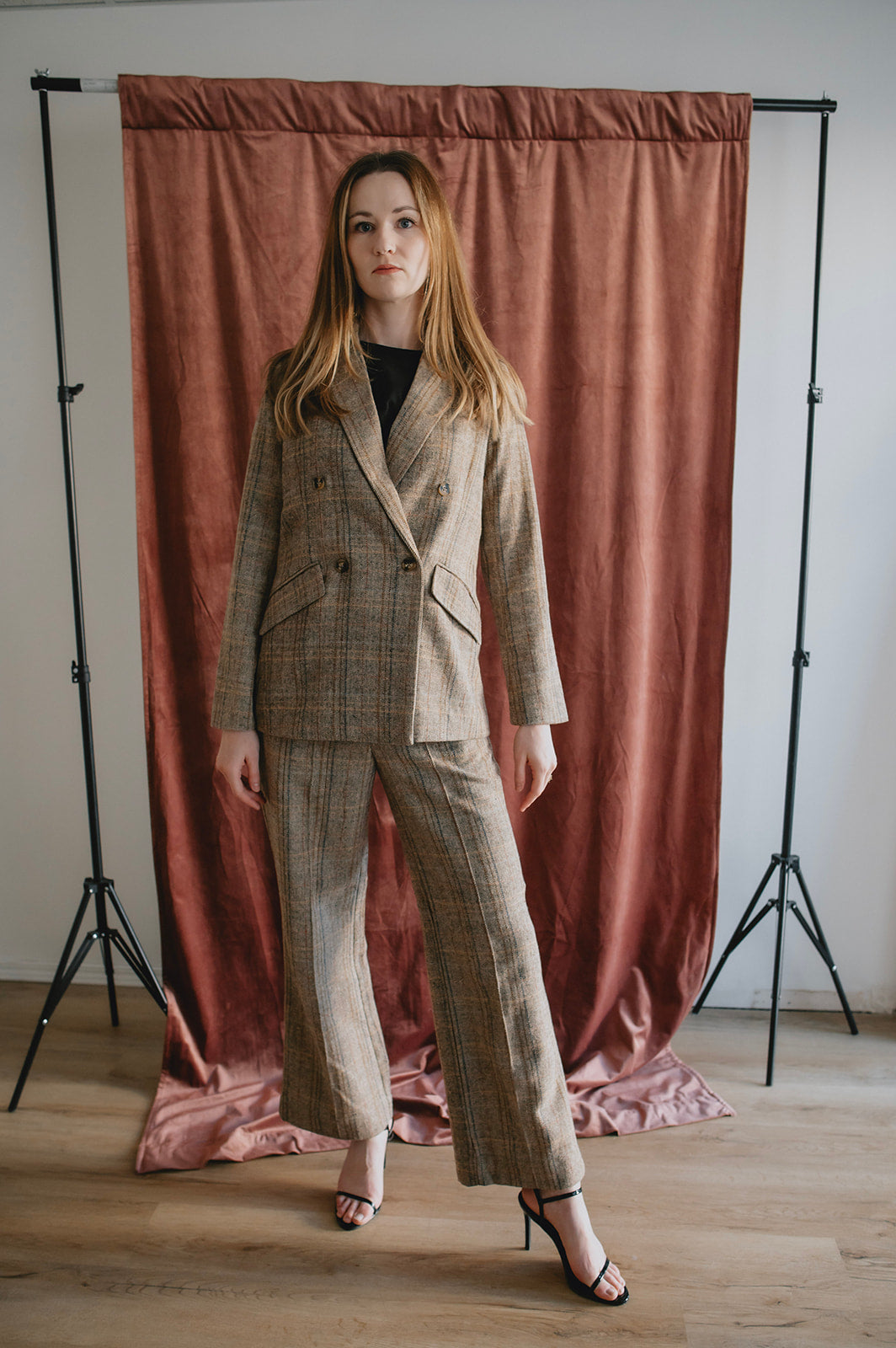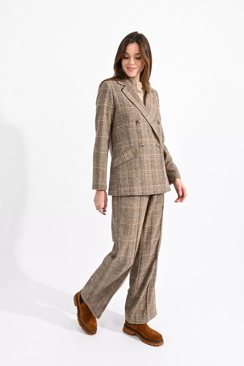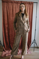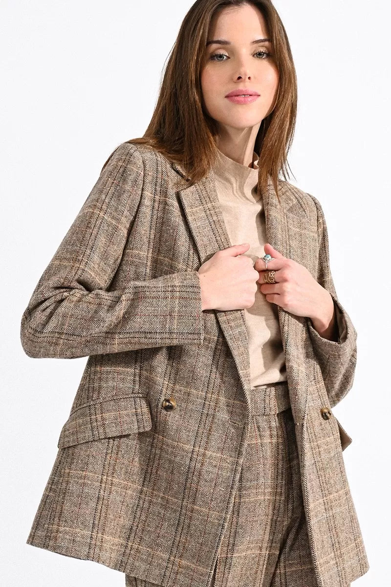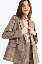 A classic plaid double-breasted blazer featuring a lapel collar and flap pockets. The perfect addition to your wardrobe.
