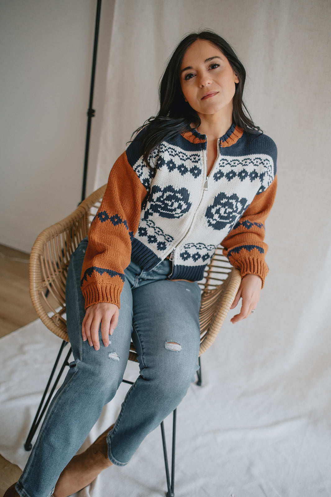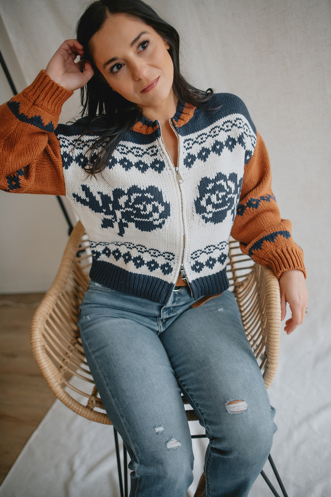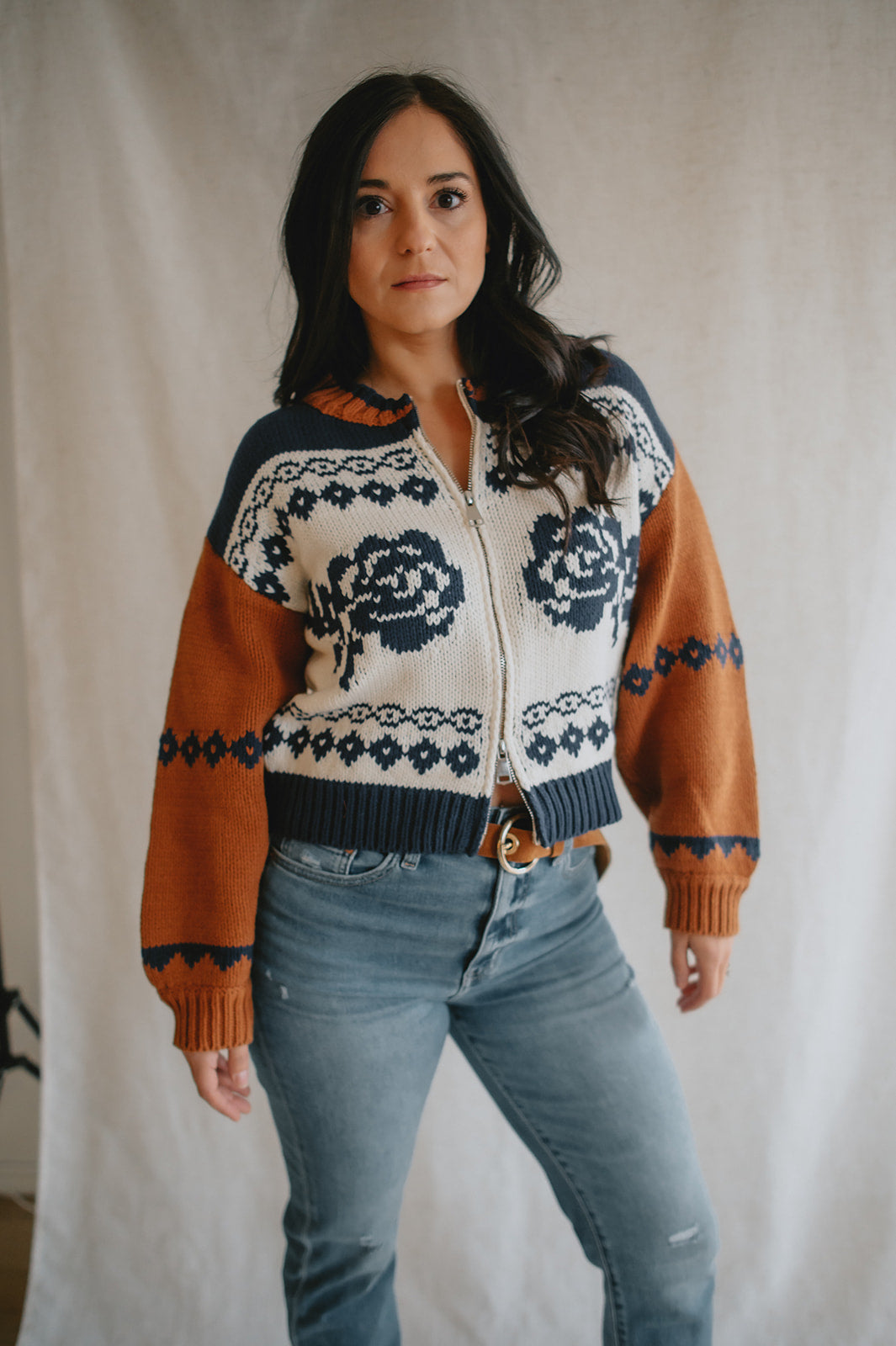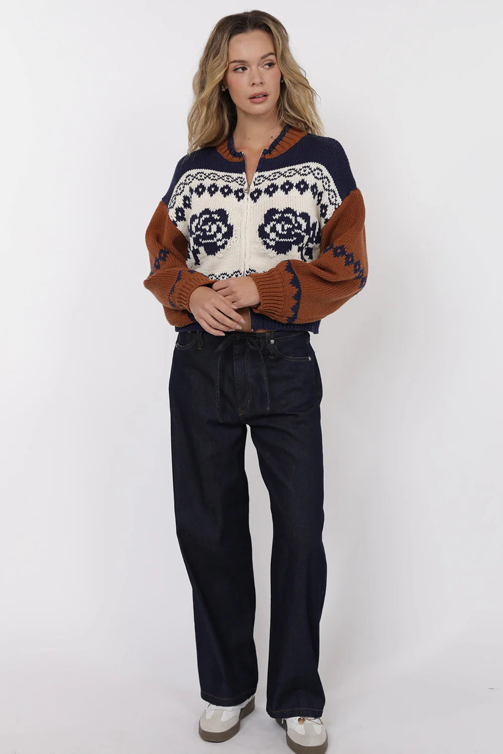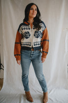 Elevate your wardrobe with the Sage the Label Sweet Rose Jacquard Zip Sweater Jacket. Crafted with a delicate rose jacquard pattern, this boxy silhouette sweater offers a modern, relaxed fit. The front zipper closure adds versatility and ease, making it perfect for layering on cooler days. Stylish yet comfortable, it’s an ideal piece to effortlessly enhance your casual looks.
