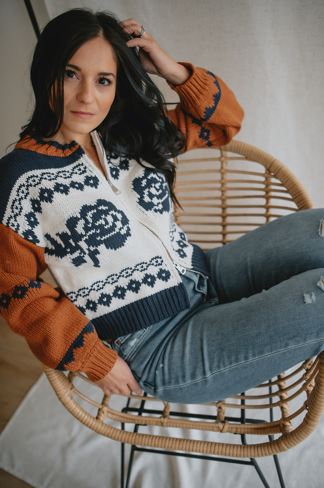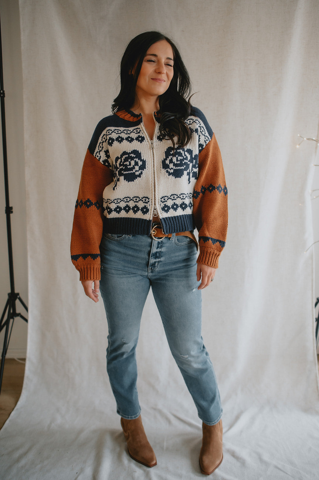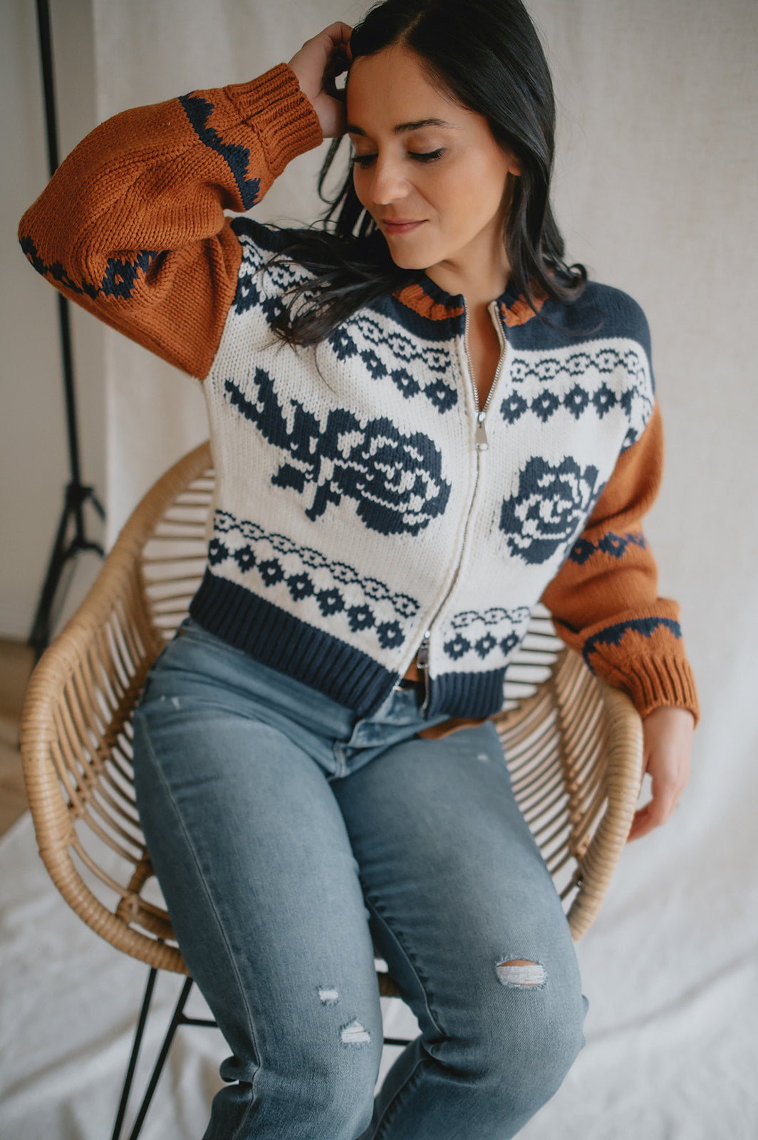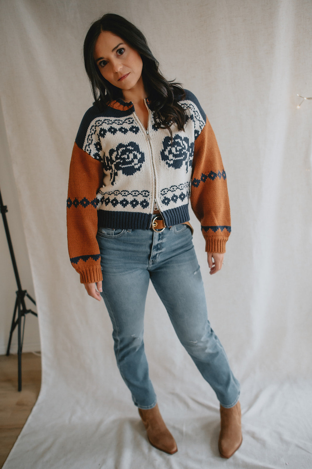 Elevate your wardrobe with the Sage the Label Sweet Rose Jacquard Zip Sweater Jacket. Crafted with a delicate rose jacquard pattern, this boxy silhouette sweater offers a modern, relaxed fit. The front zipper closure adds versatility and ease, making it perfect for layering on cooler days. Stylish yet comfortable, it’s an ideal piece to effortlessly enhance your casual looks.