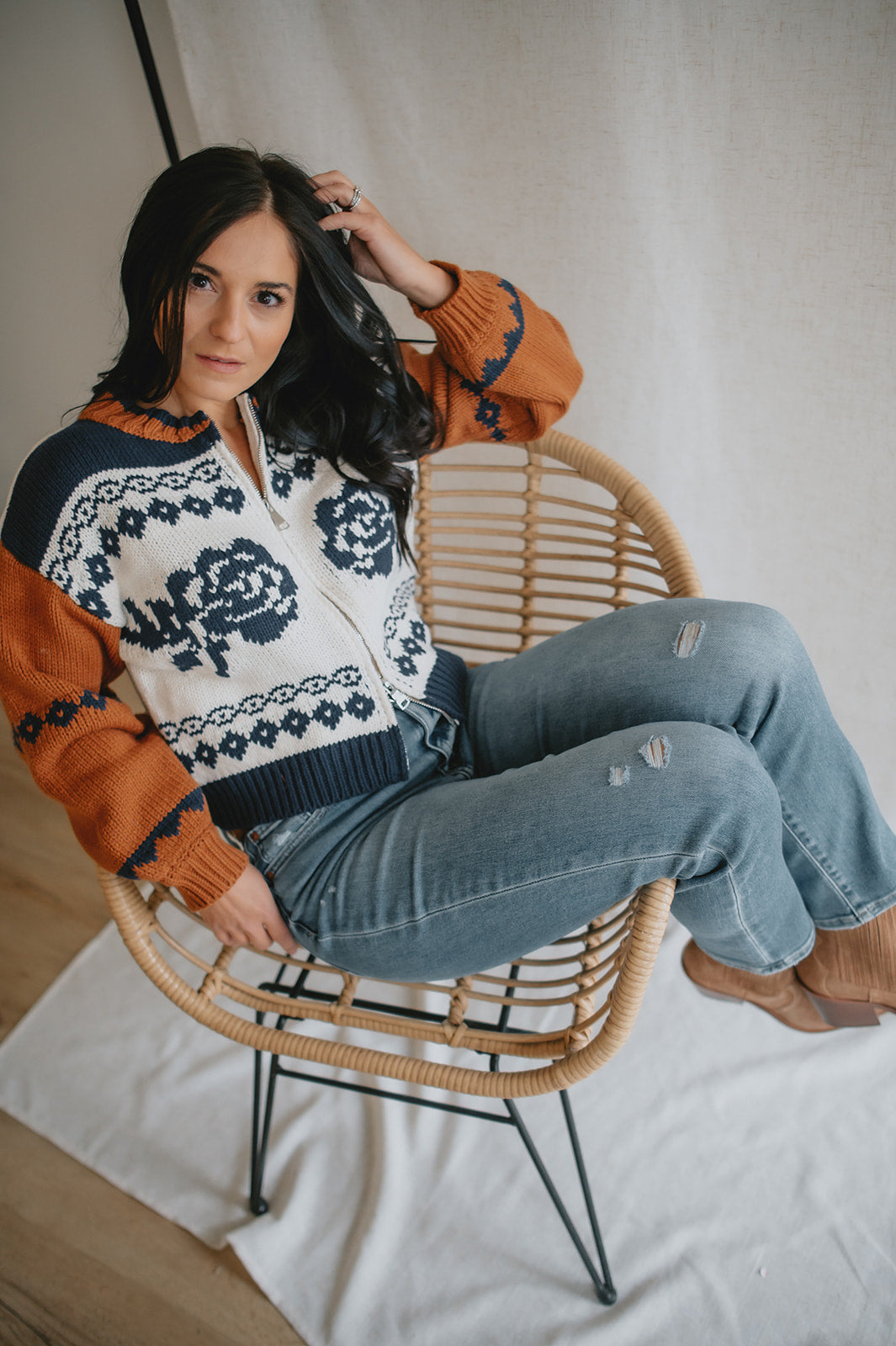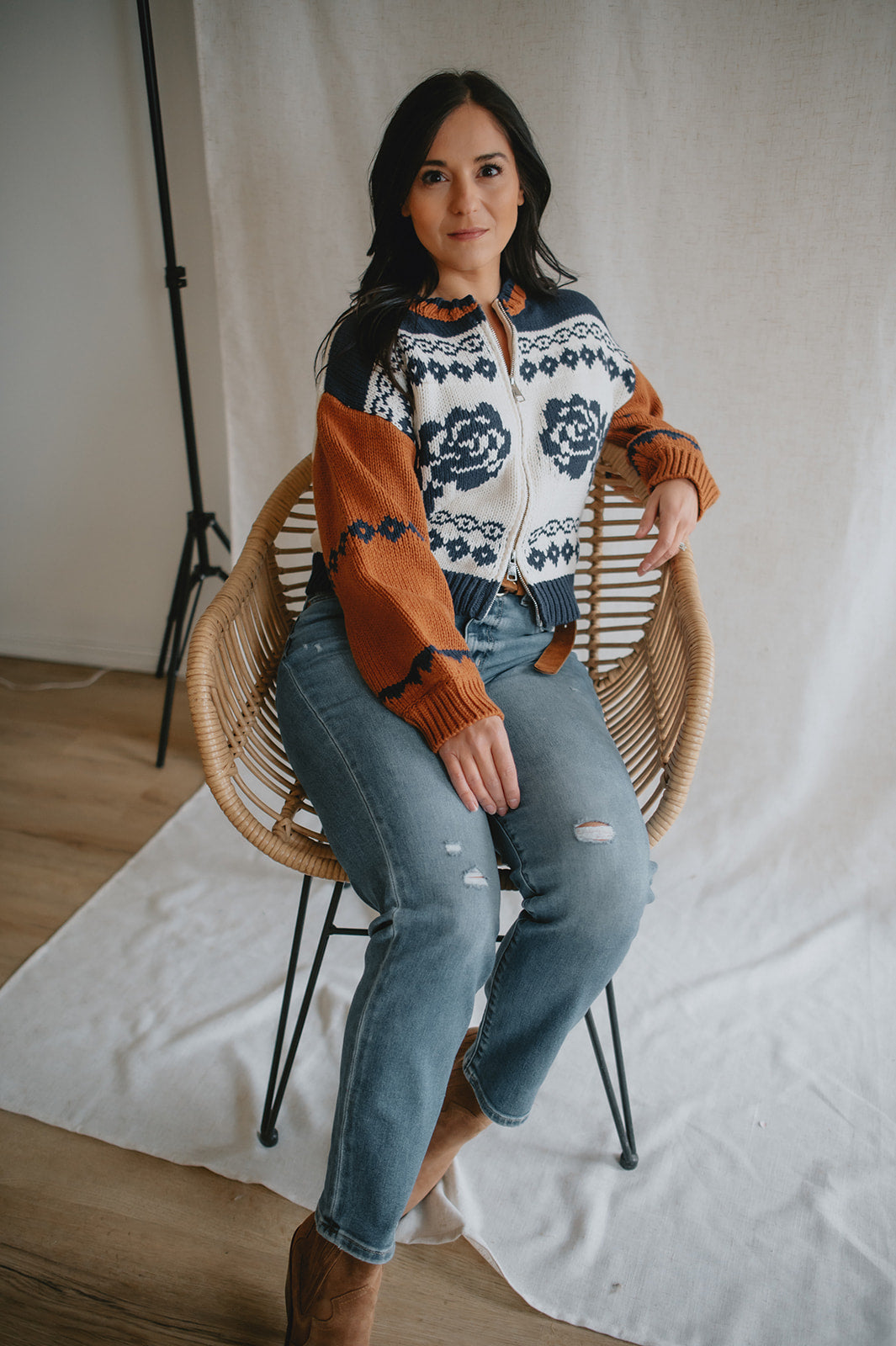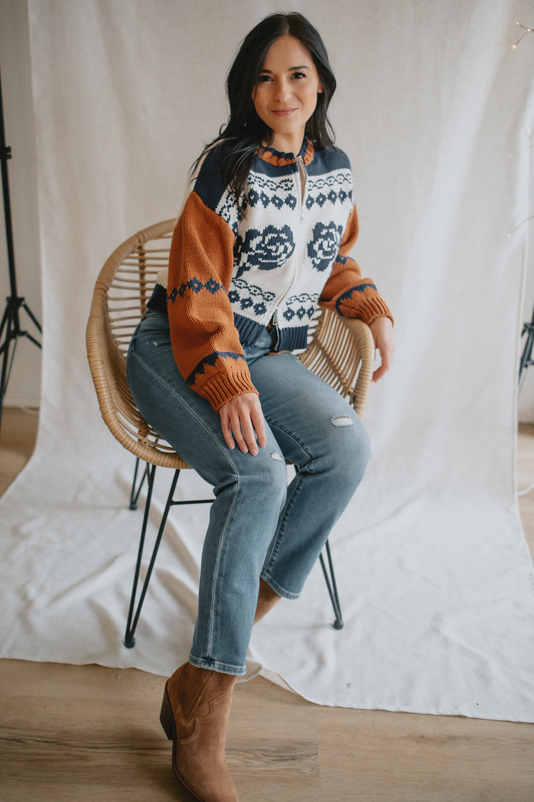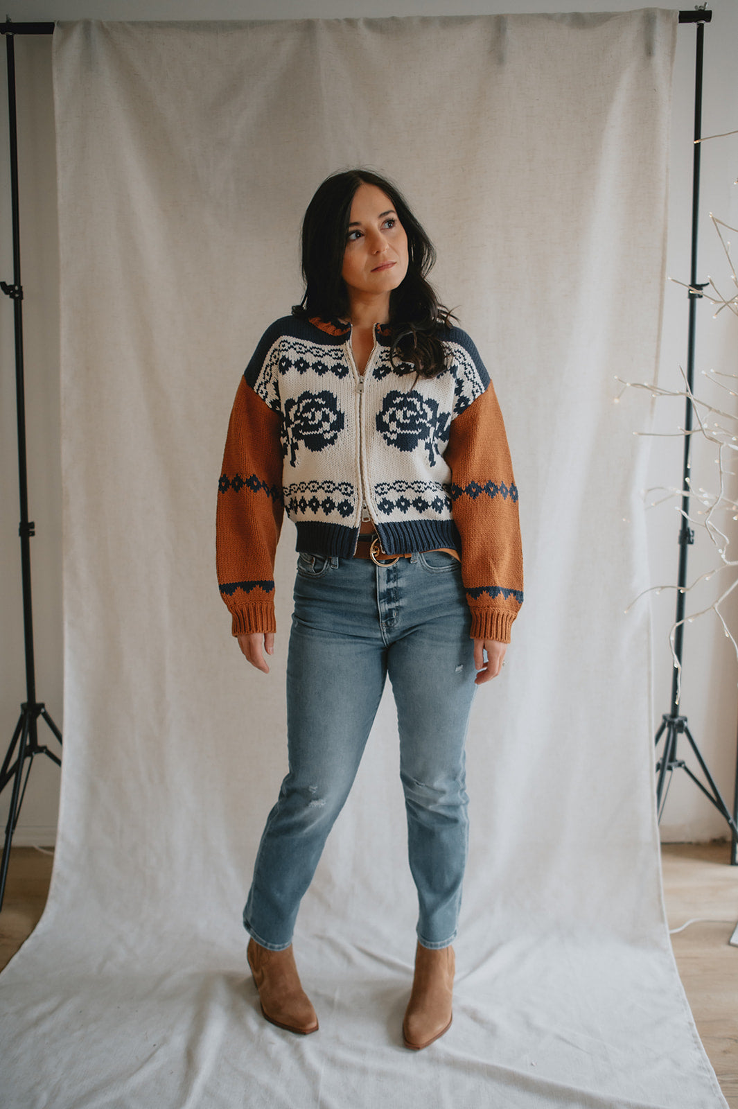 Elevate your wardrobe with the Sage the Label Sweet Rose Jacquard Zip Sweater Jacket. Crafted with a delicate rose jacquard pattern, this boxy silhouette sweater offers a modern, relaxed fit. The front zipper closure adds versatility and ease, making it perfect for layering on cooler days. Stylish yet comfortable, it’s an ideal piece to effortlessly enhance your casual looks.