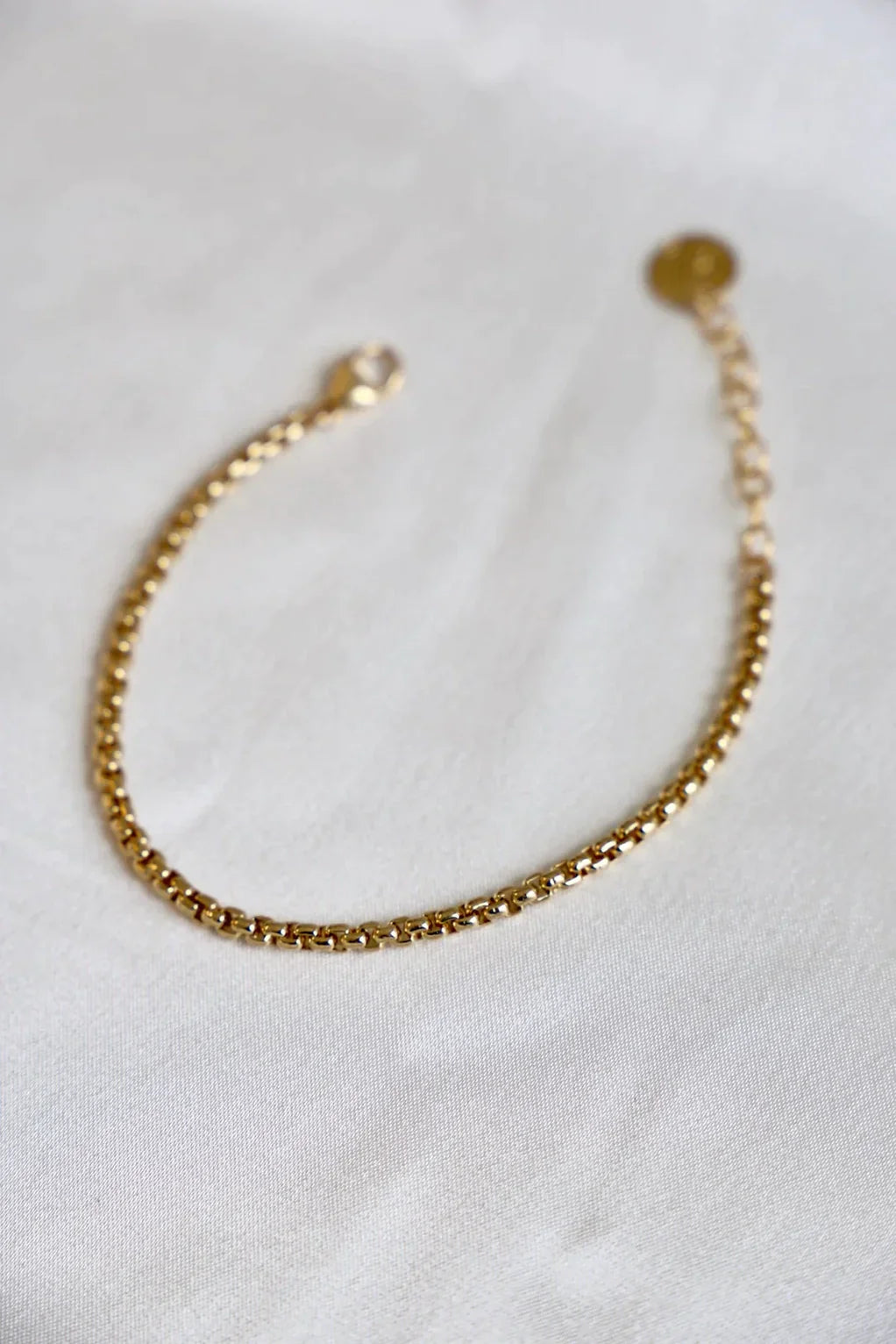 The Holland Chain Bracelet is made with 24 karat gold plate and features a round box chain for a classic yet luxurious look. With its sleek design and top quality materials, this bracelet is perfect for special occasions or everyday wear.