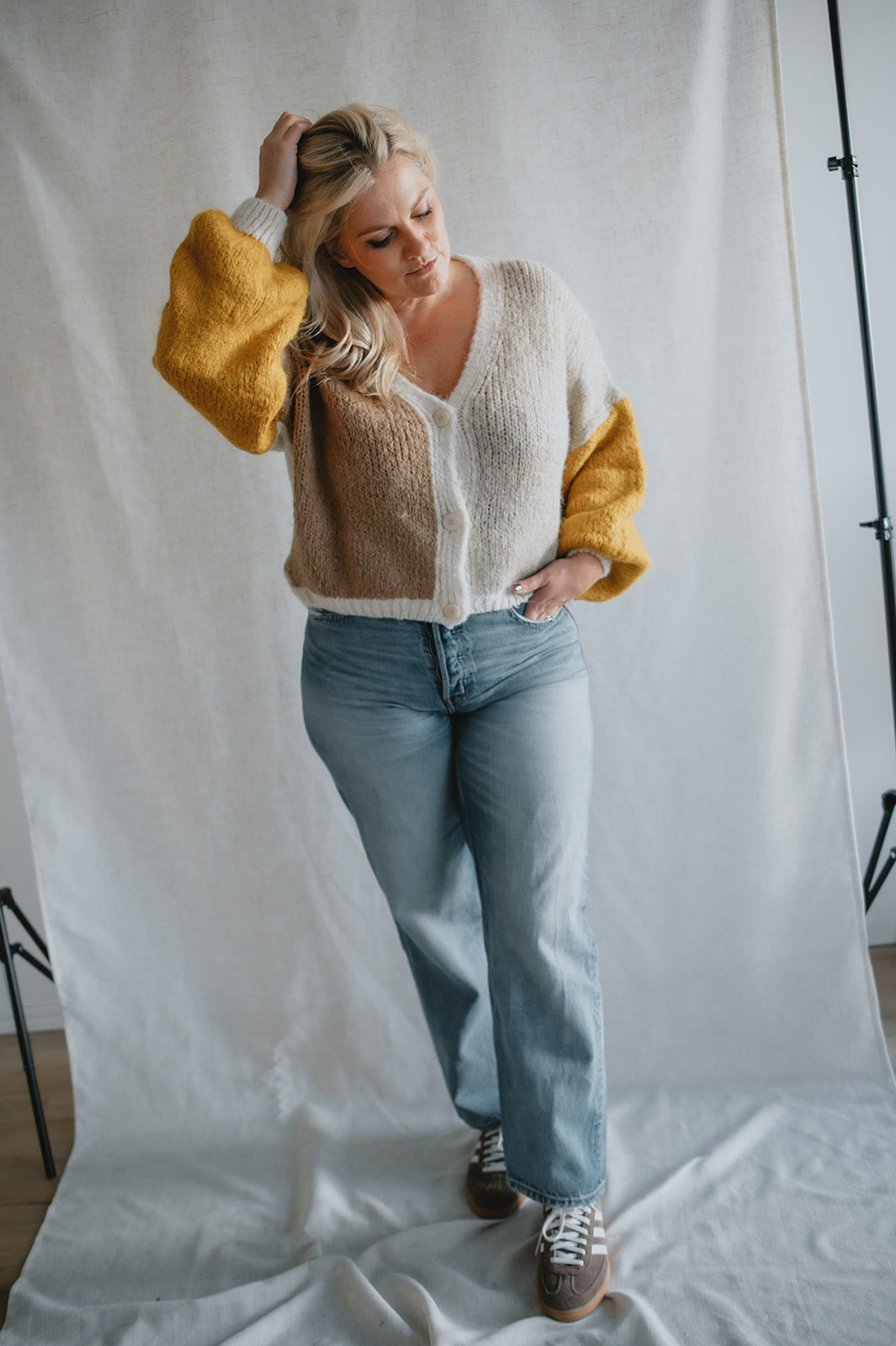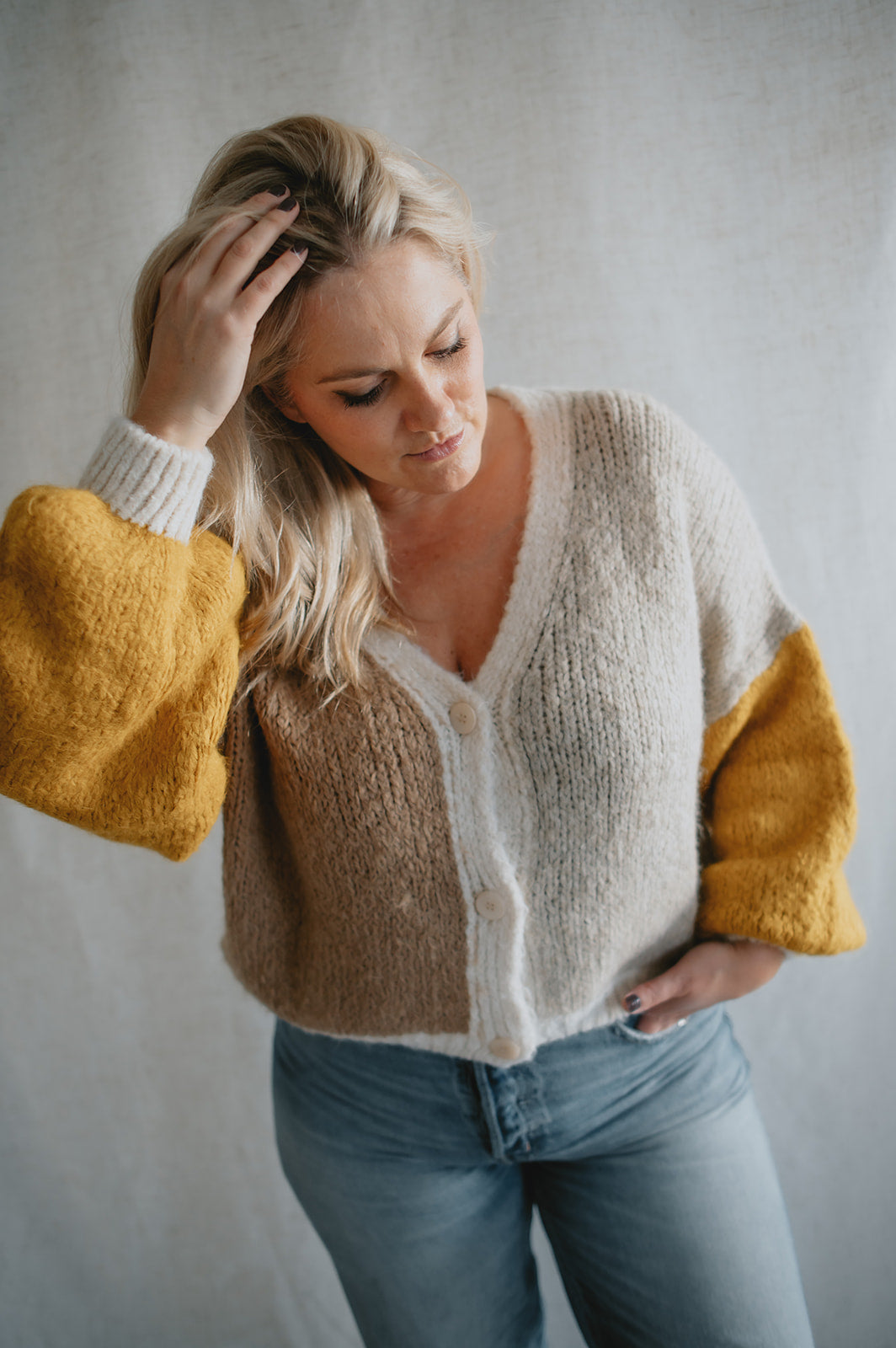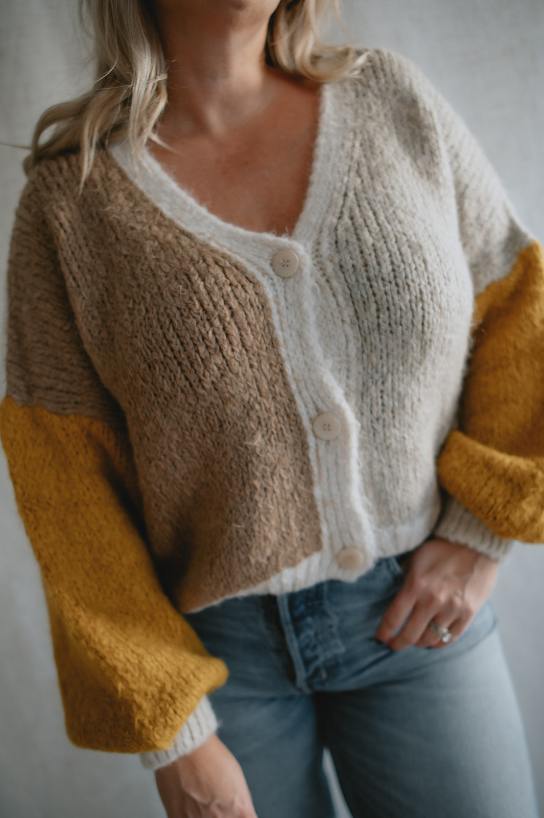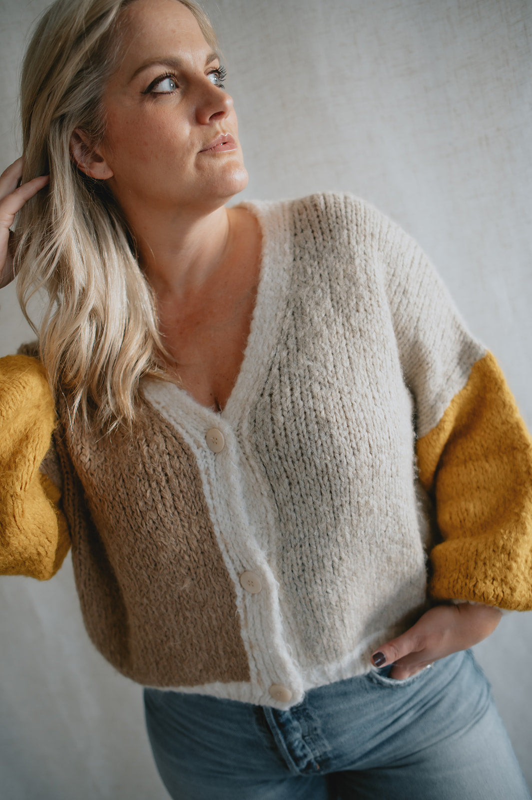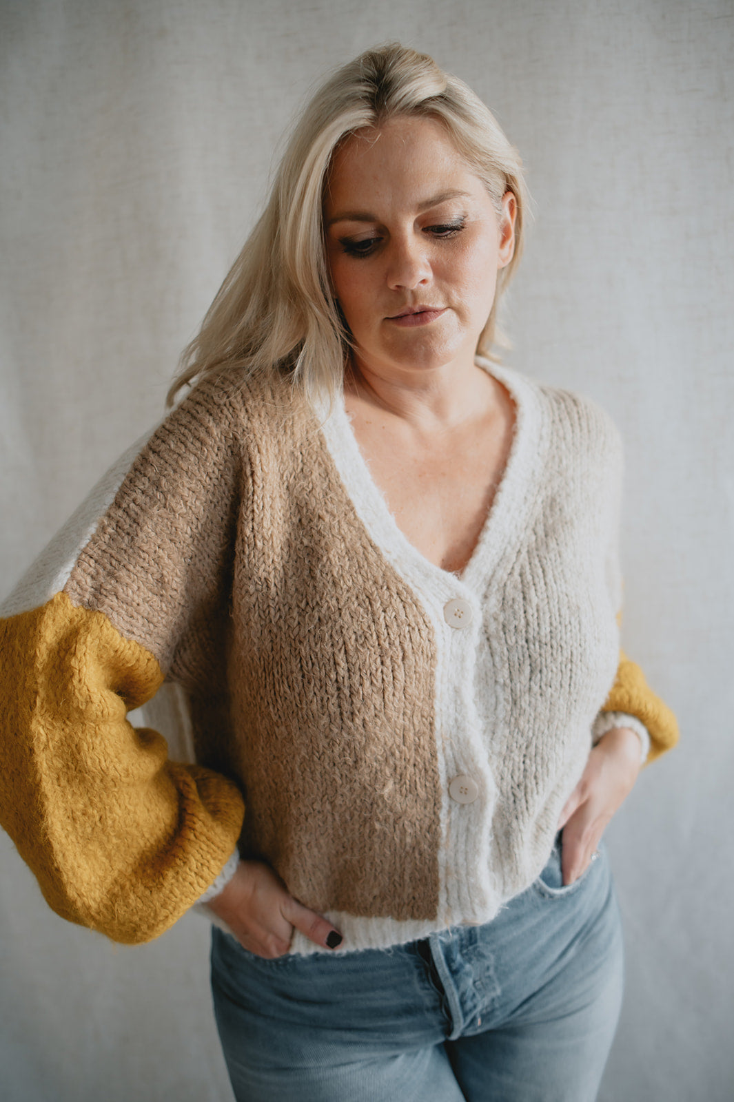 The Colour Block Cardigan with a modern essential that brings warmth and dimension to any wardrobe. Designed in a palette of softly blended neutrals, this cardigan features distinct colour block panels in shades of cream, taupe, and mustard, offering a versatile look that pairs beautifully with everything from denim to loungewear.