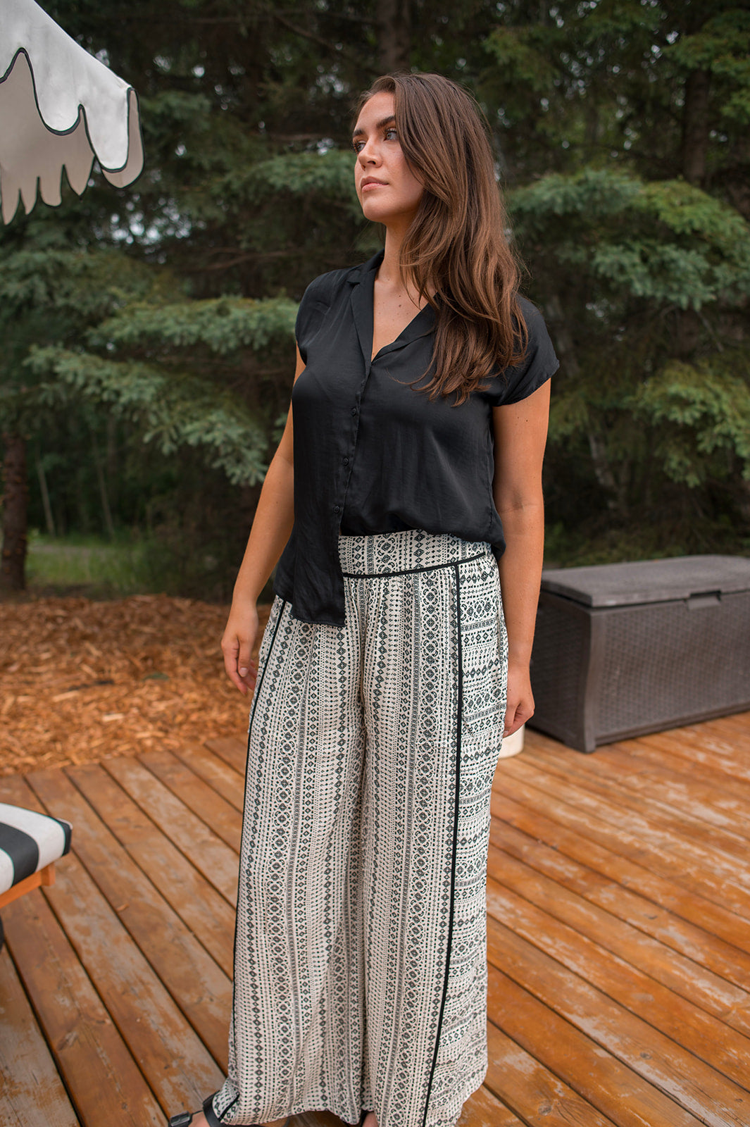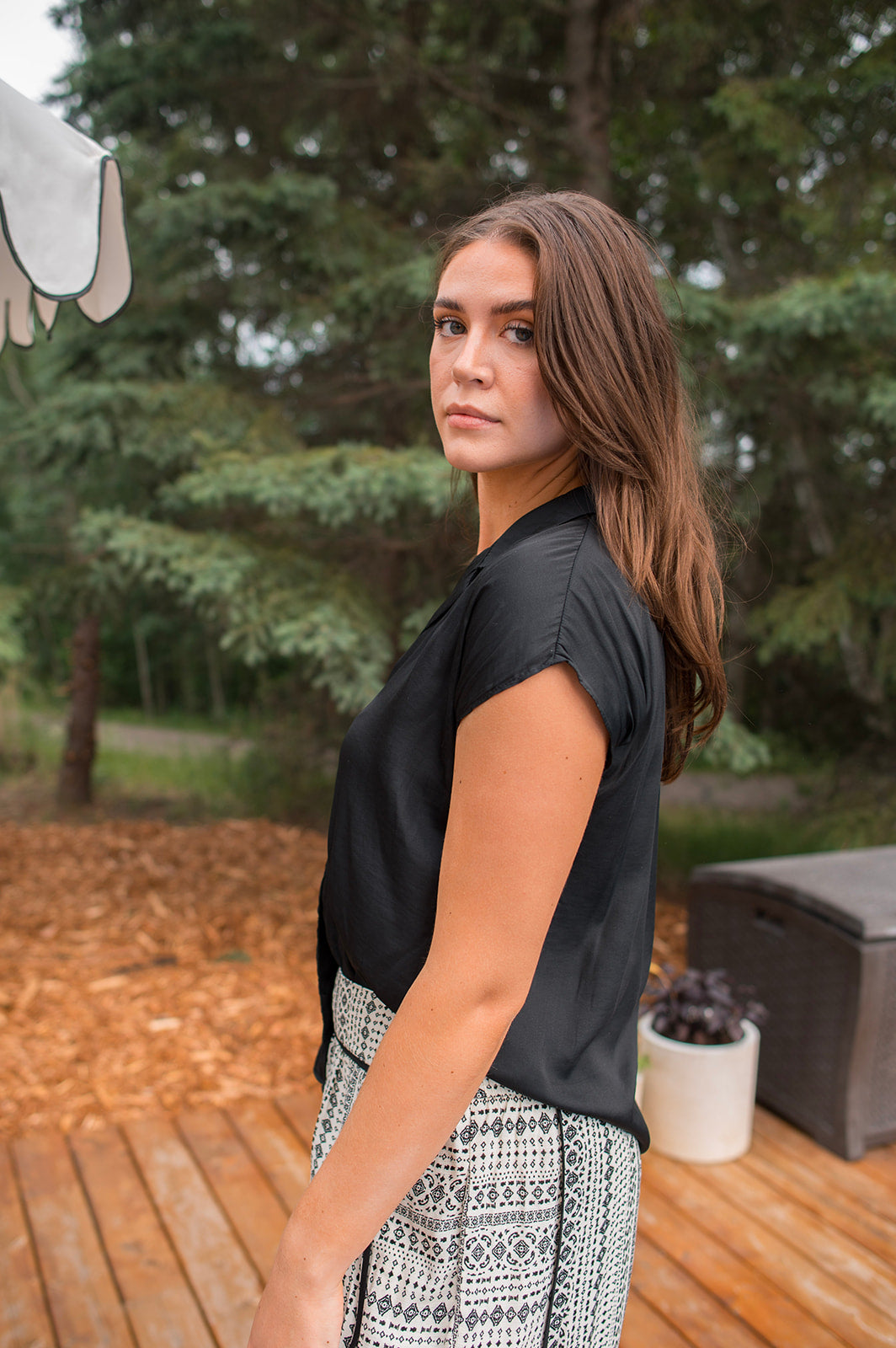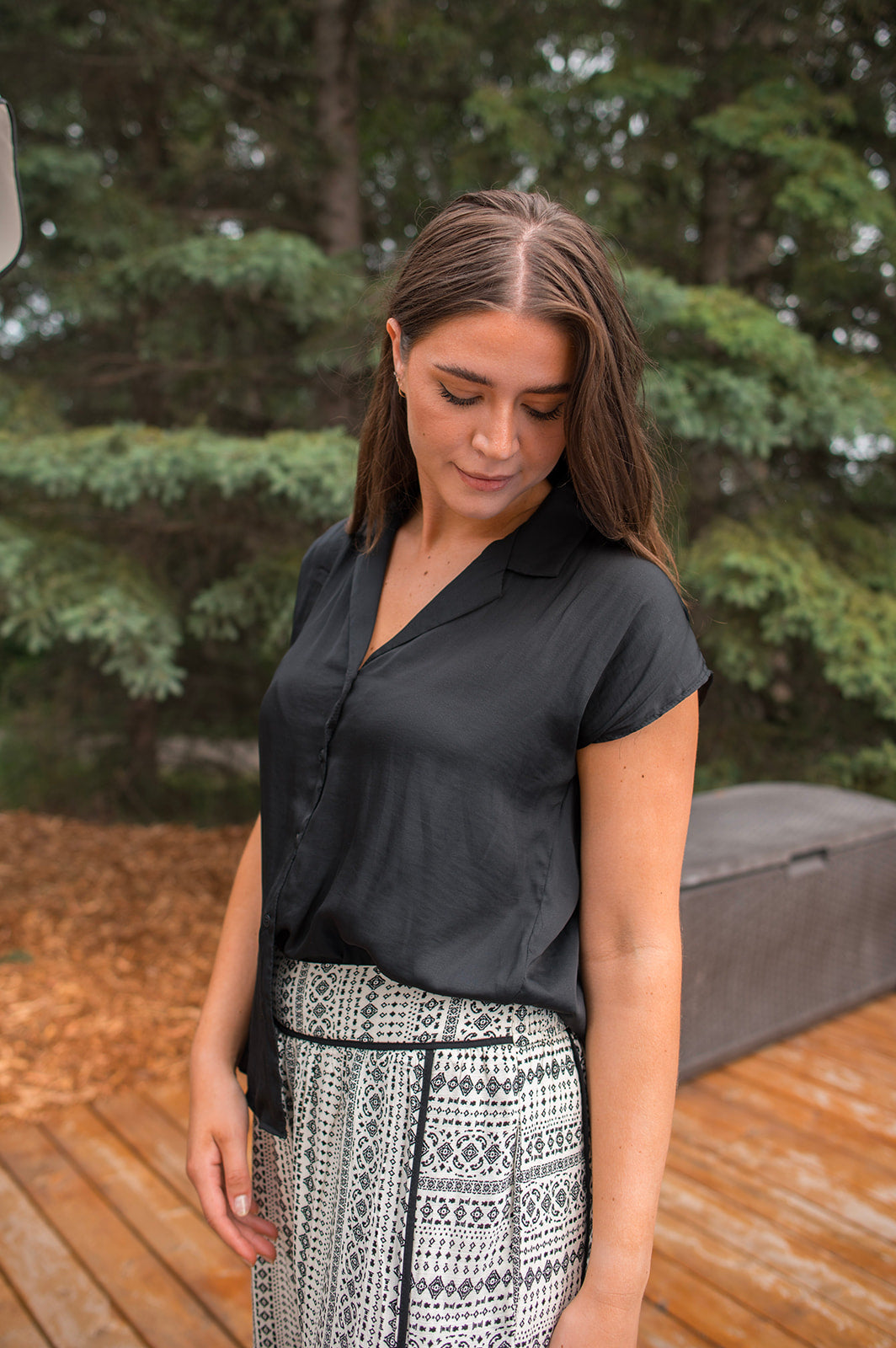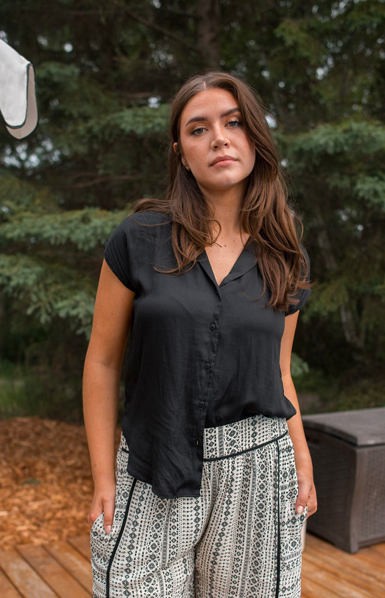 This blouse is such a good summer basic. We love the open spread collar, cap sleeve, and silky material. You can tie her up with a high waisted bottom, tuck her into some dress pants, or wear her out with denim. This is will be a great transition piece as we move into fall and winter which is a great bonus.